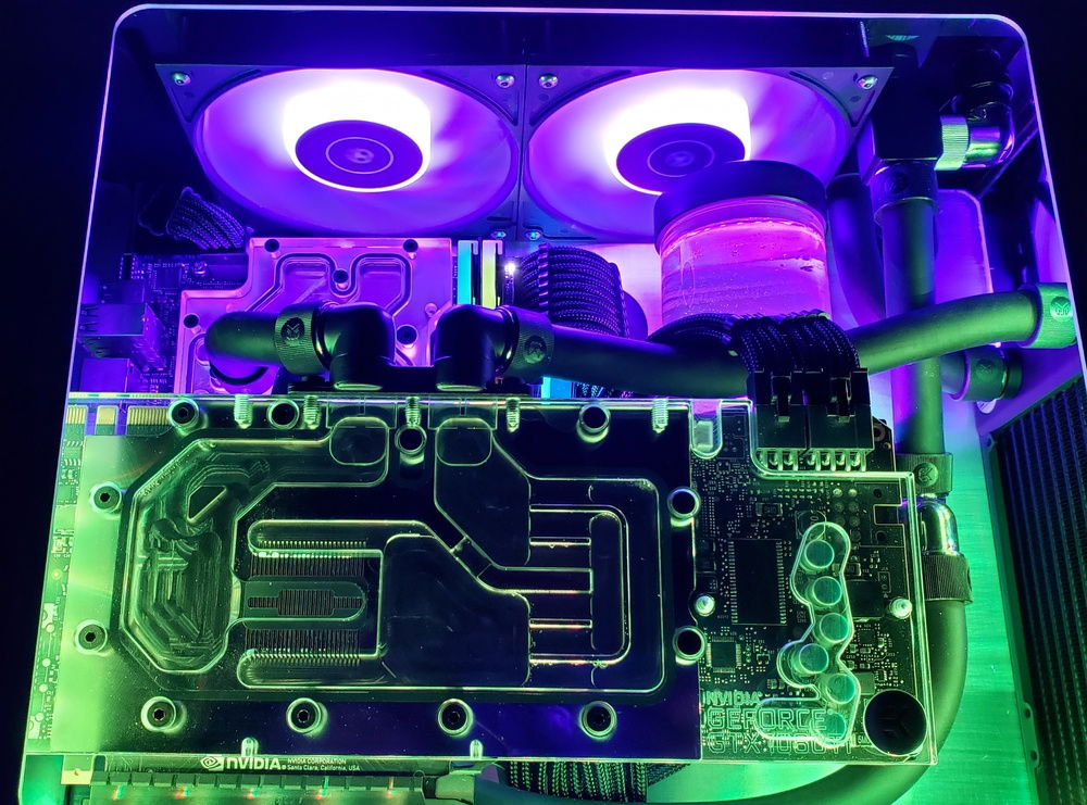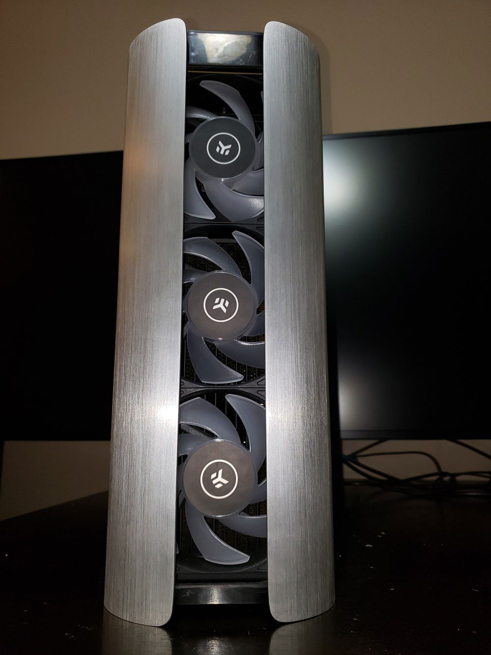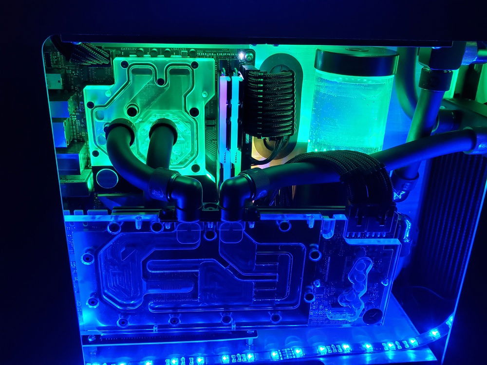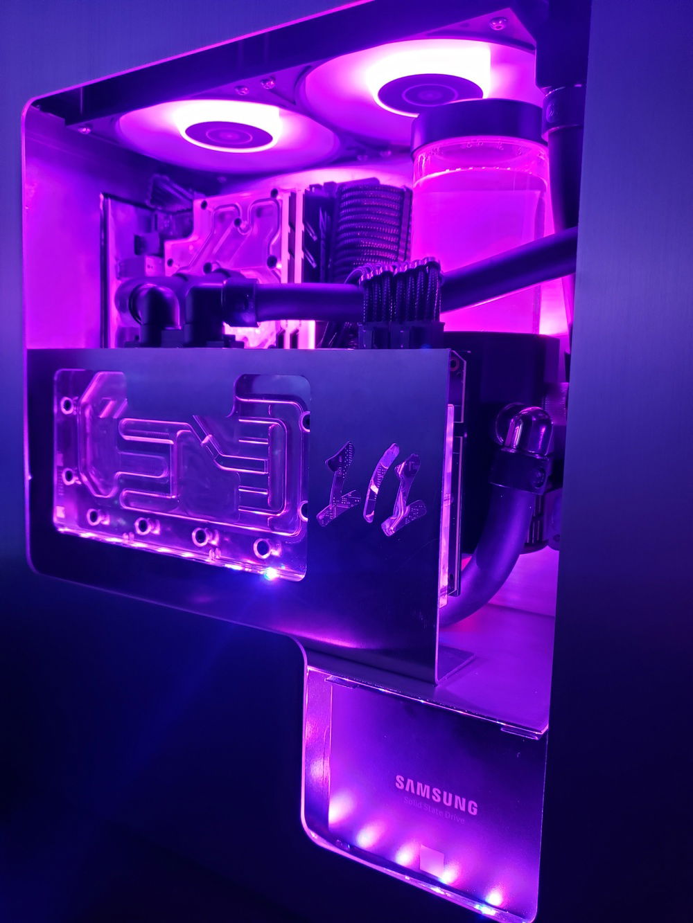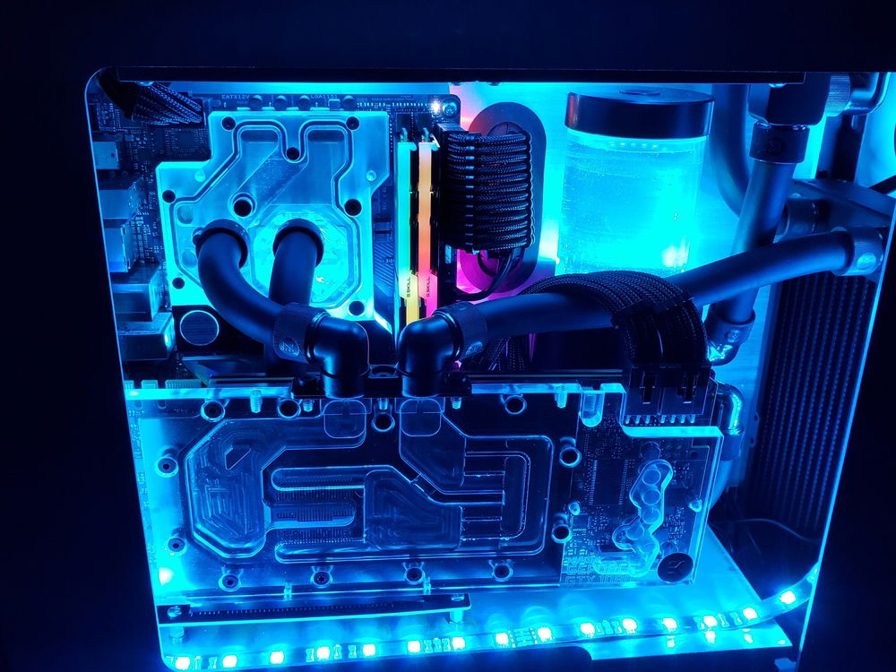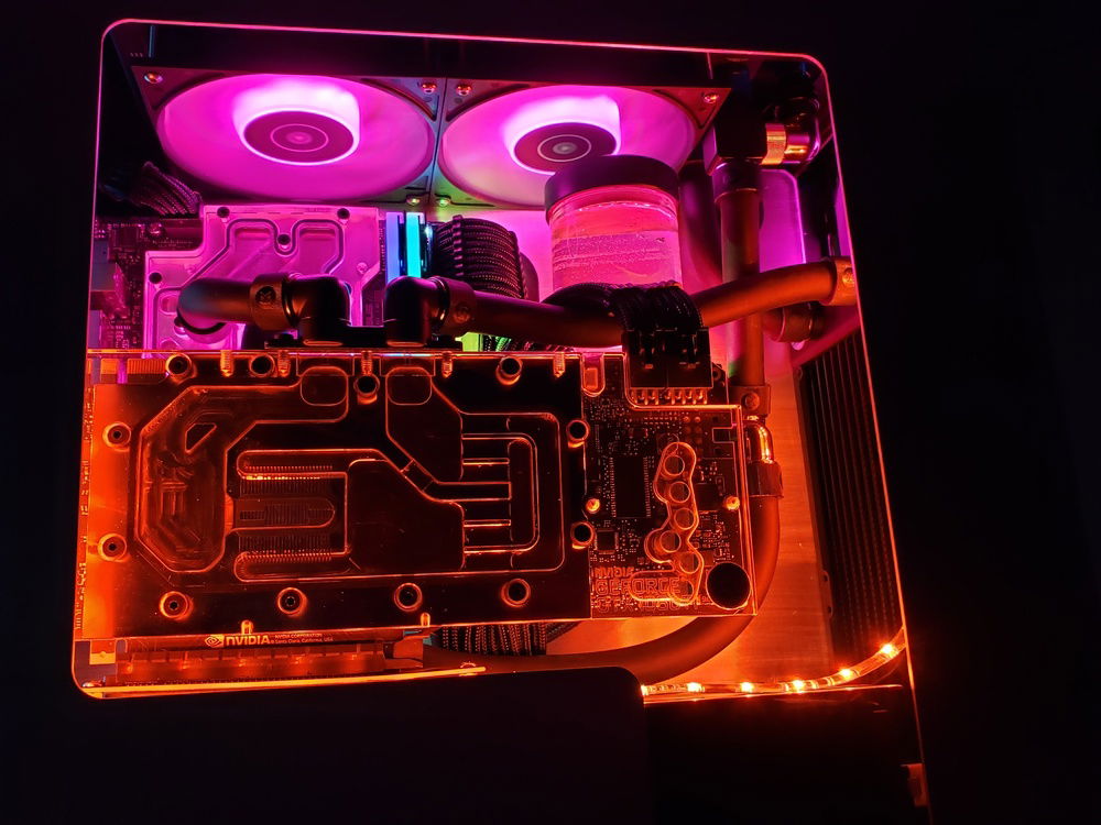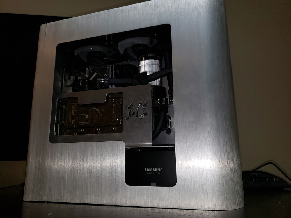 Chopped up silver Bitfenix Pandora mATX aluminum. Motherboard shifted down 1.5" (38mm) and forward 0.5" (12mm). New aluminum rear panel and motherboard tray fitted. Full custom EKWB loop to keep the 8086k and 1080ti cool ;)