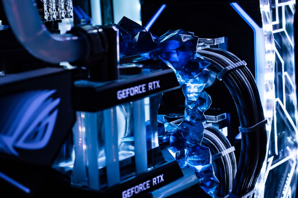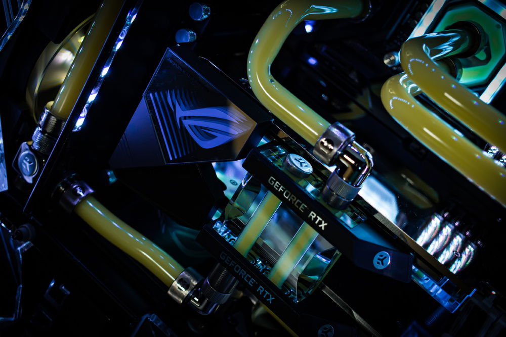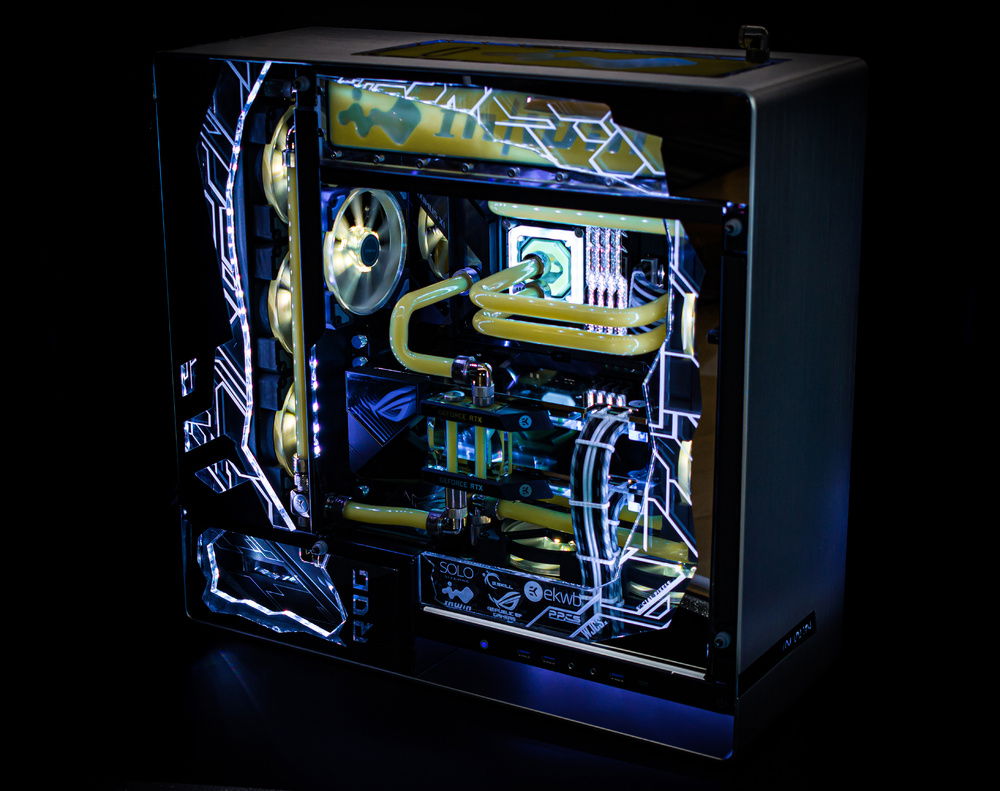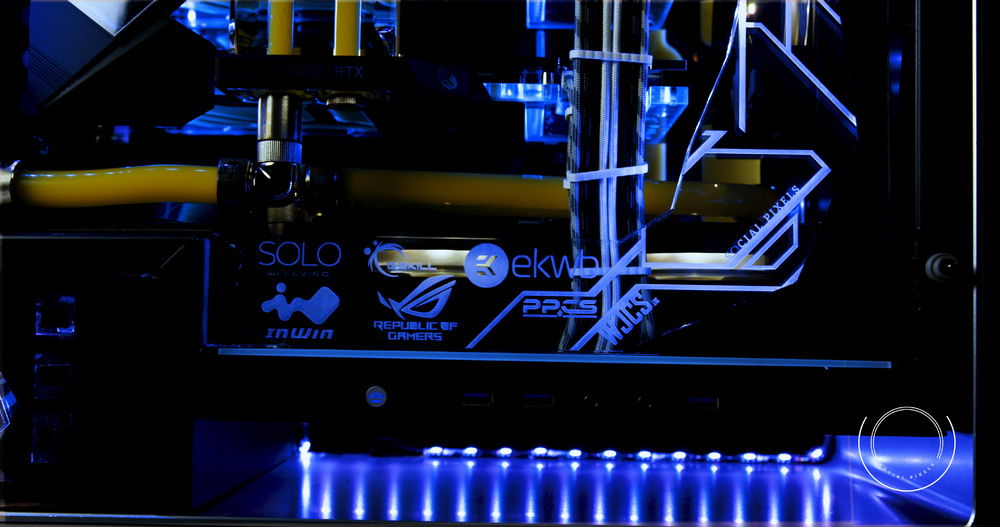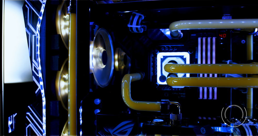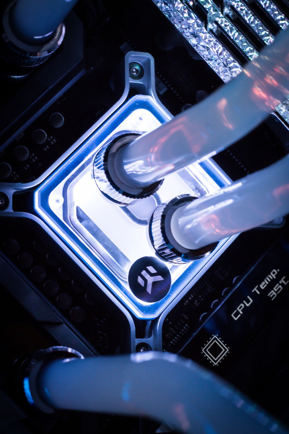 All accent lights are driven by ASUS Aura, and fan lights are driven by the EK Connect (Beta)