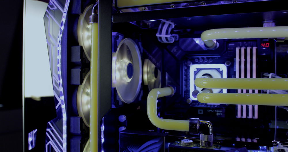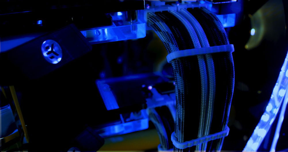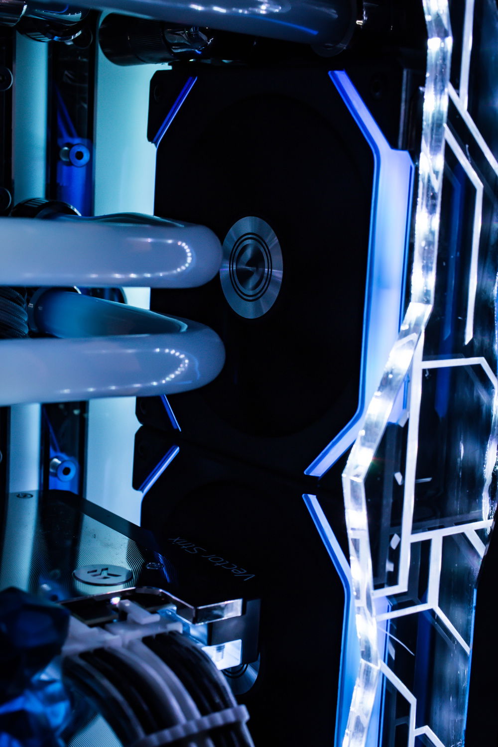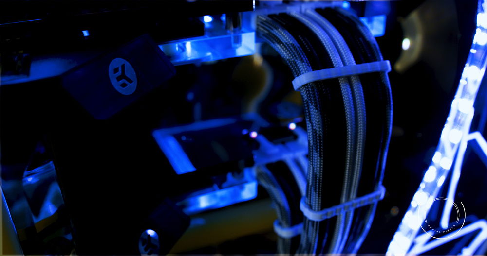 Custom Distro-plate in the back, making the runs much cleaner, with an addressable RGB strip