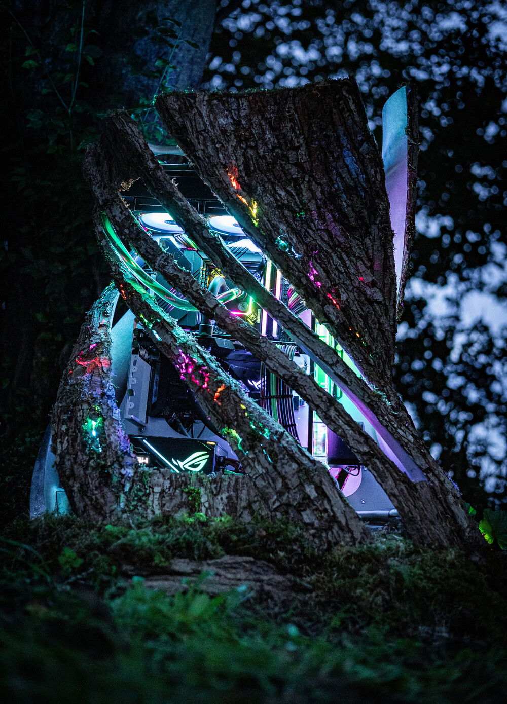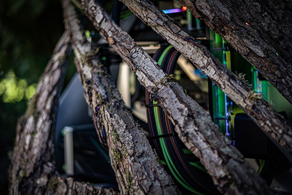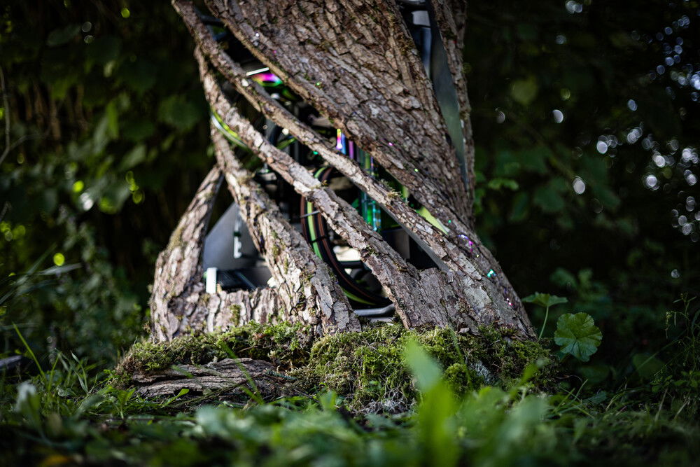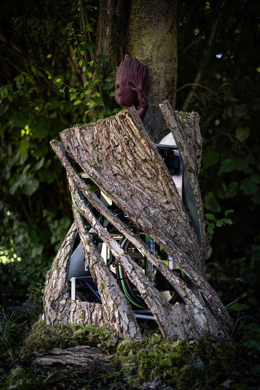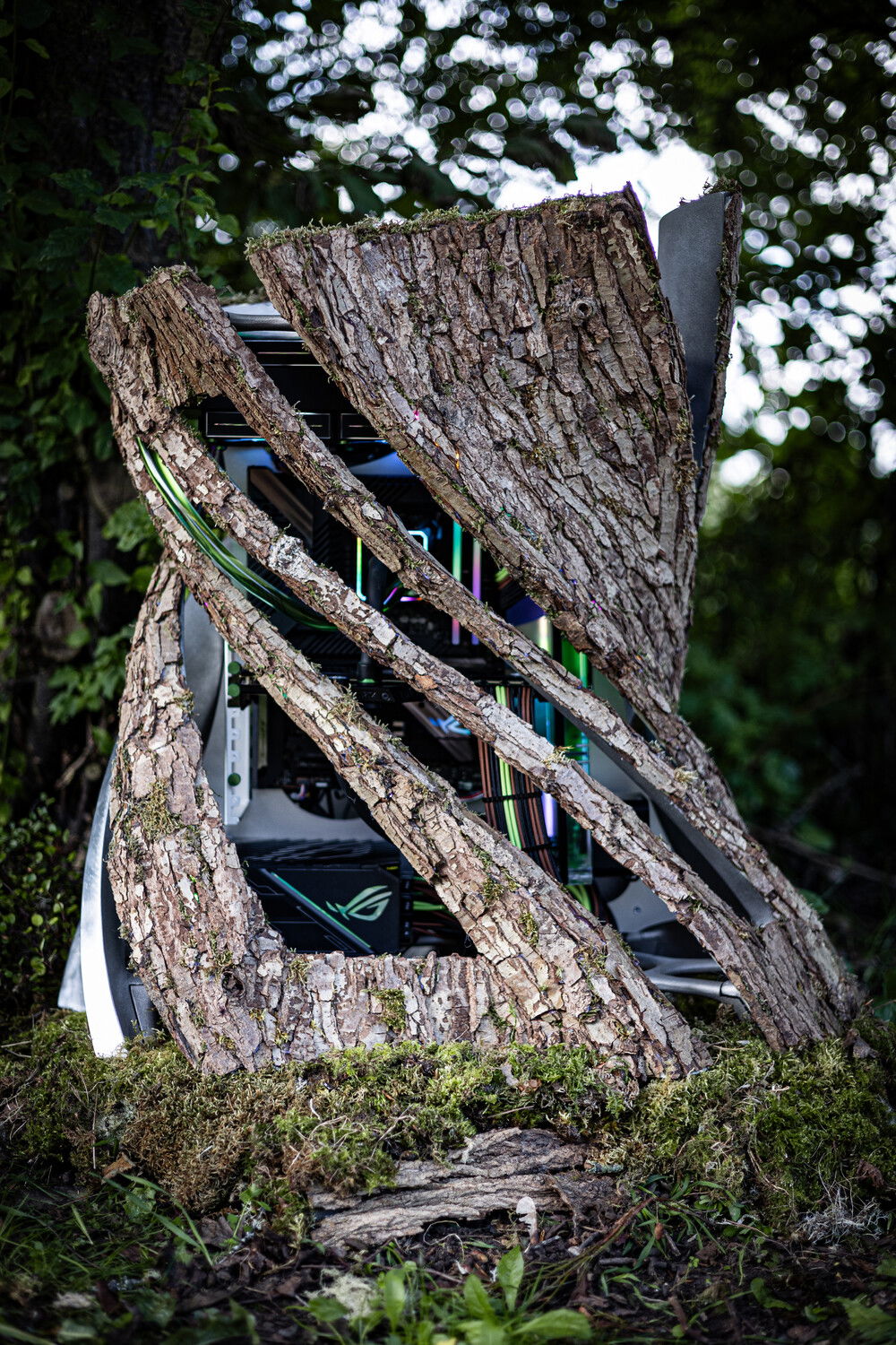 Using the InWin Europe Z-Tower case as a base, we covered it in wood and moss, adding some lights behind it, for that feeling.