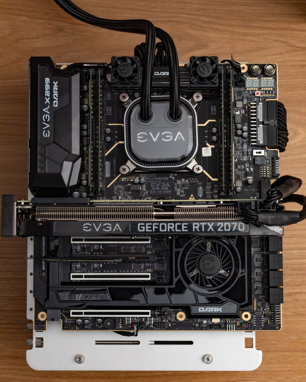 Well, this was a fun one! So many of my builds are purpose driven. I just wanted something that was overkill fun. I do have a backup M.2 set aside for this PC with all my main PC apps as a backup, just in case, but this IS the fun machine. My last run-in with Intel HEDT was X79. Aside from tweaking after building it, I used it strictly as a workhorse. You’ll notice some changing hardware in the pics. While I was waiting for water cooling parts, I was using an EVGA X299 Micro 2 and varying GPUs from an RX580 to a 2070 Super. The CLC was the EVGA CLC 360. Good cooler and cheaper than most others, but the fans are horrendously loud.
