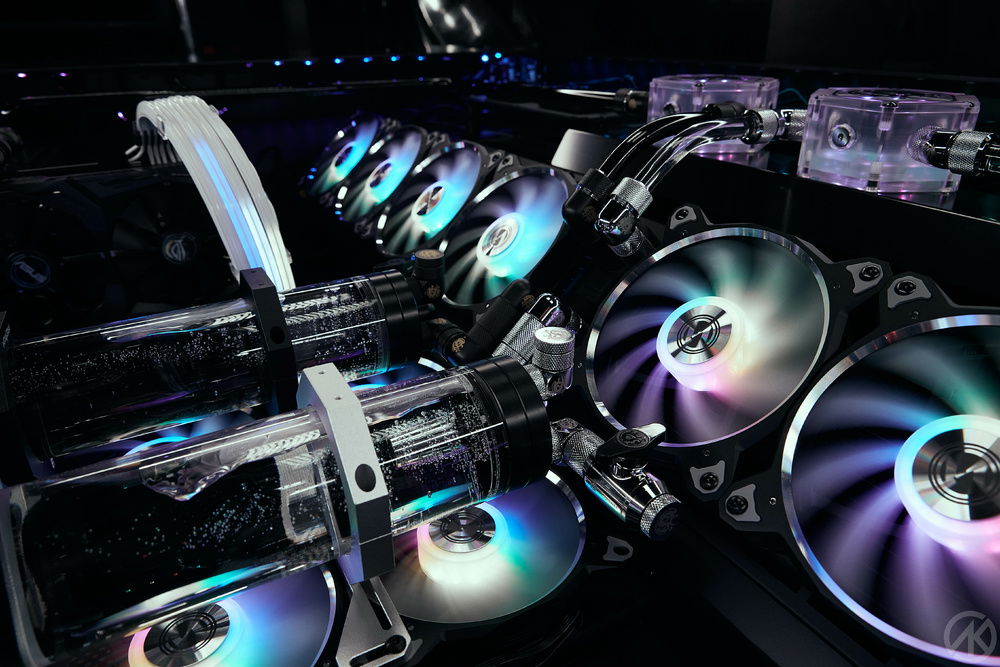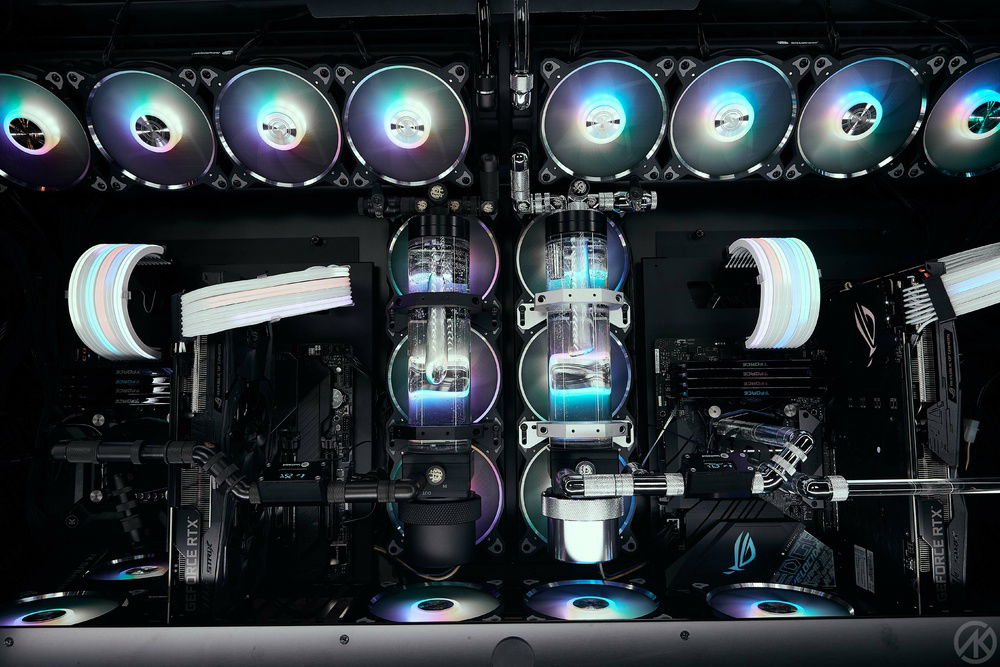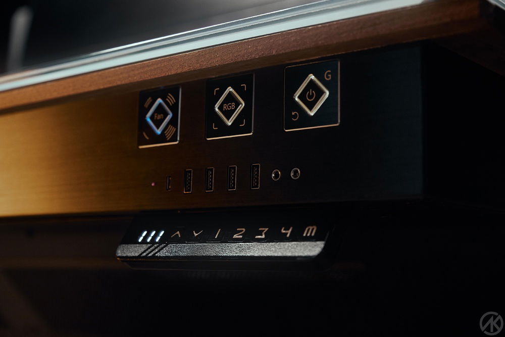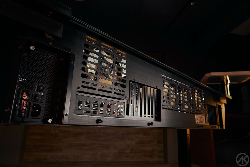 As a professional case modder, I recently built a new workplace to practice my passion. For this new place, I needed a computer that could perform well enough to let me work on my custom parts and also let me game every once in a while to relieve the pressure. The new DK-05F from LIAN LI is a dual system desk PC case that could allow me to have a standing/sitting down desk with two systems where each could be optimized for their own purpose. Most of my time was dedicated to cable management, water cooling routing, and overall aesthetic. Starting with two colors to distinguish the two systems, planning the water cooling took more time, as the desk is so big and the runs are quite long. I decided to trim the desk with walnut wood to give it a nice classic feel, and added custom-designed speaker stands (also made of walnut and aluminum). Cable management was the most challenging part because a dual system results in double the cables. With such an open design, figuring out the best order to mount all the components became a crucial part of the cable management. The edge of the top panel helped to hide most of the cable excess, and the removable motherboard trays and various mounting brackets were lifesavers to prevent scratching the frame of the desk when mounting parts and moving things around.
