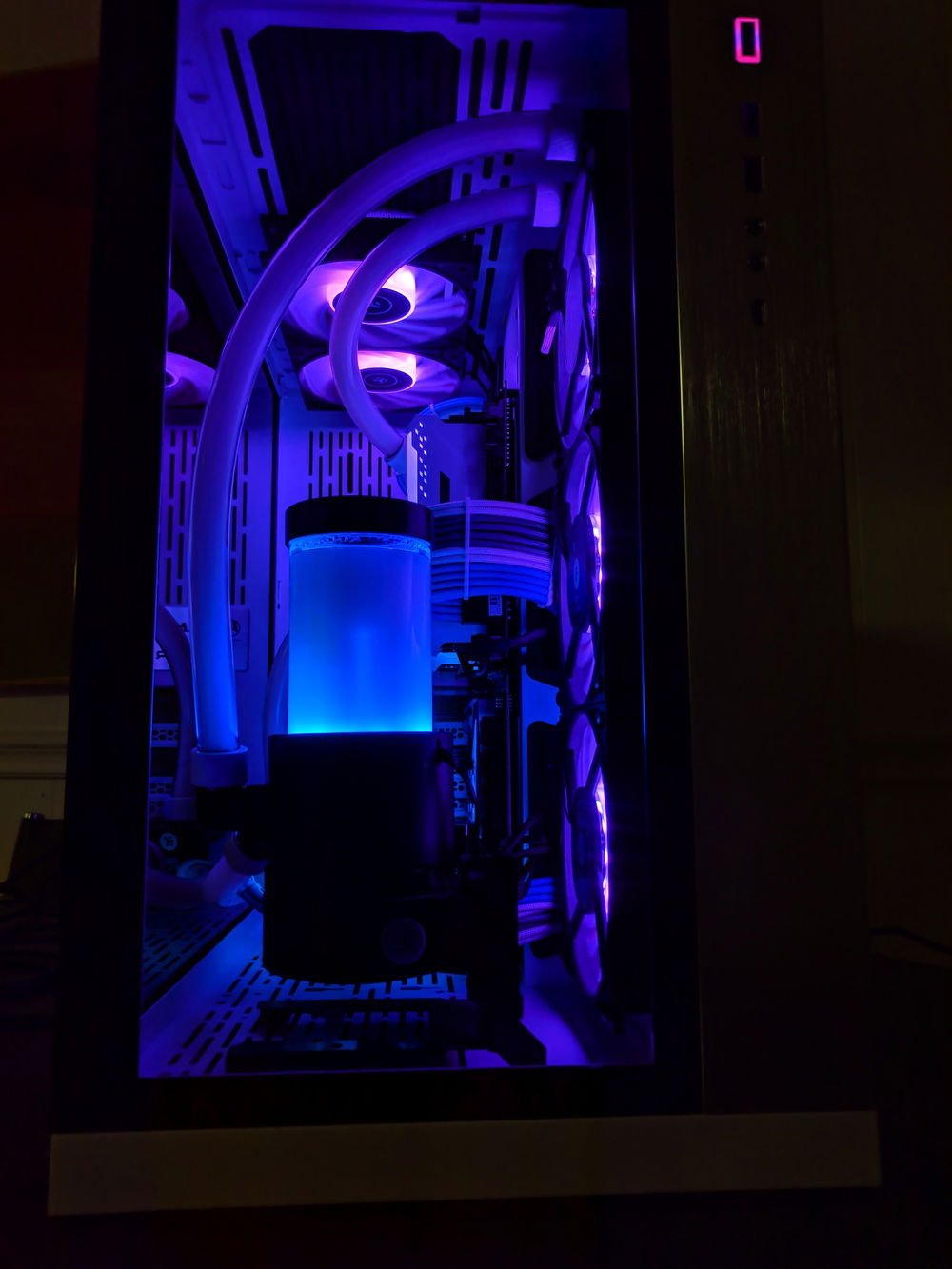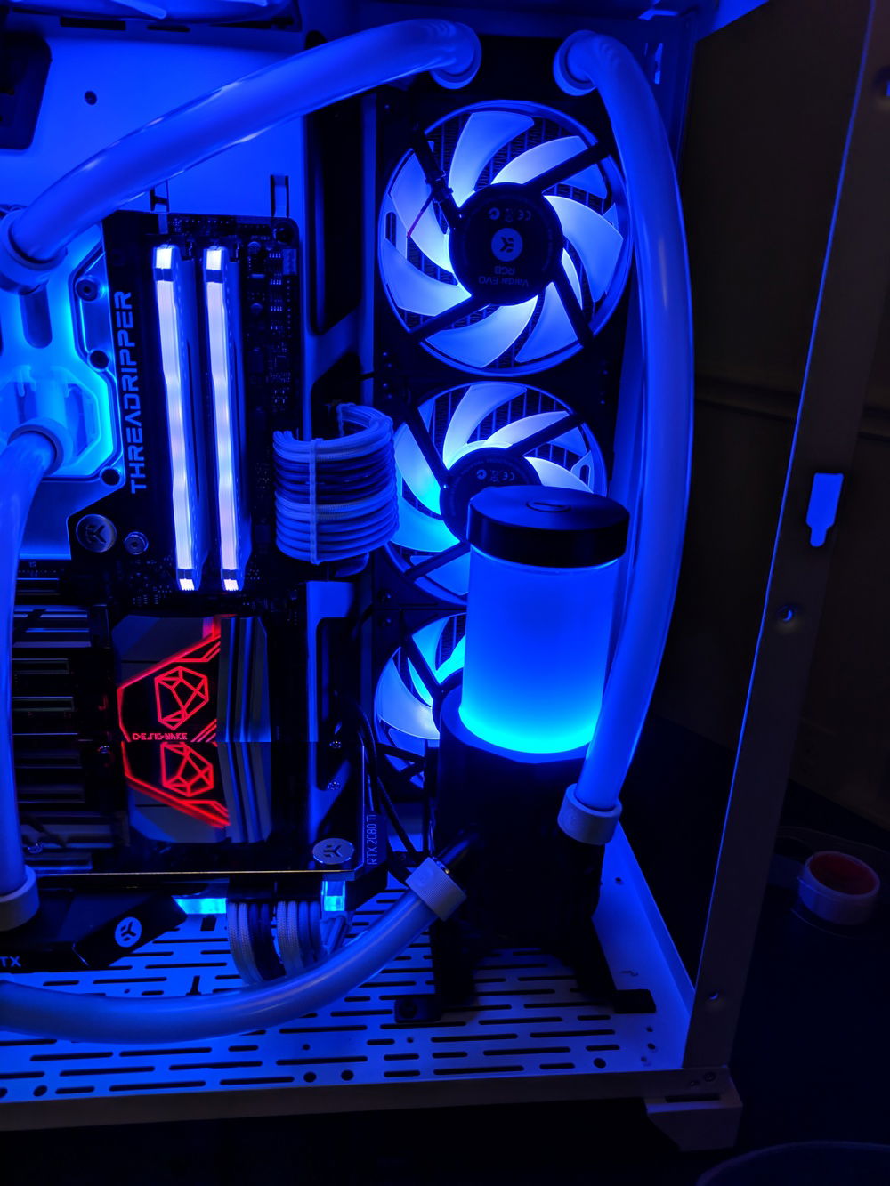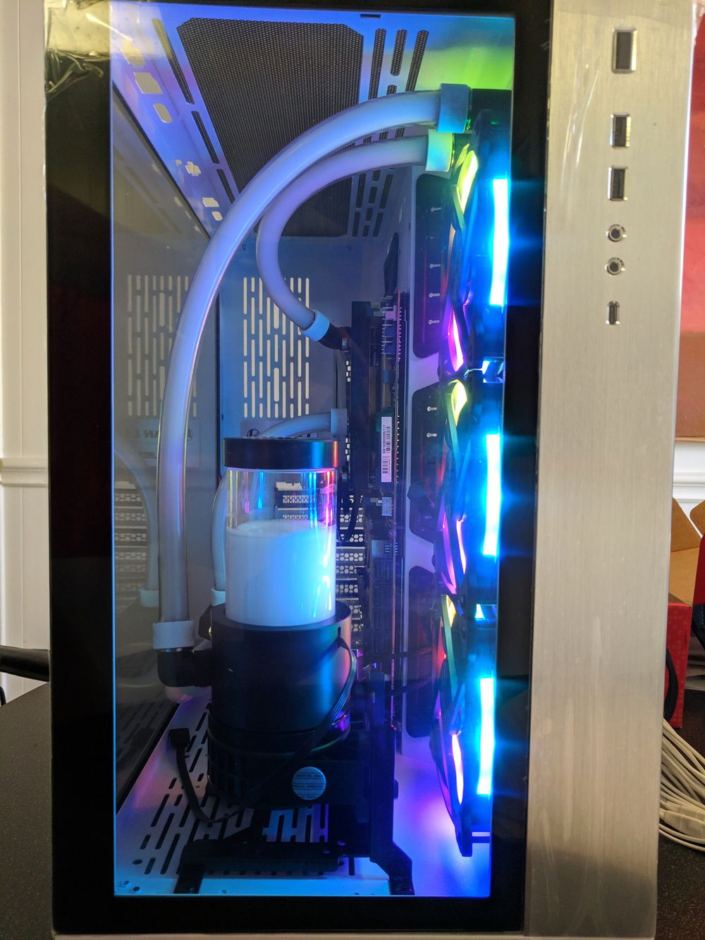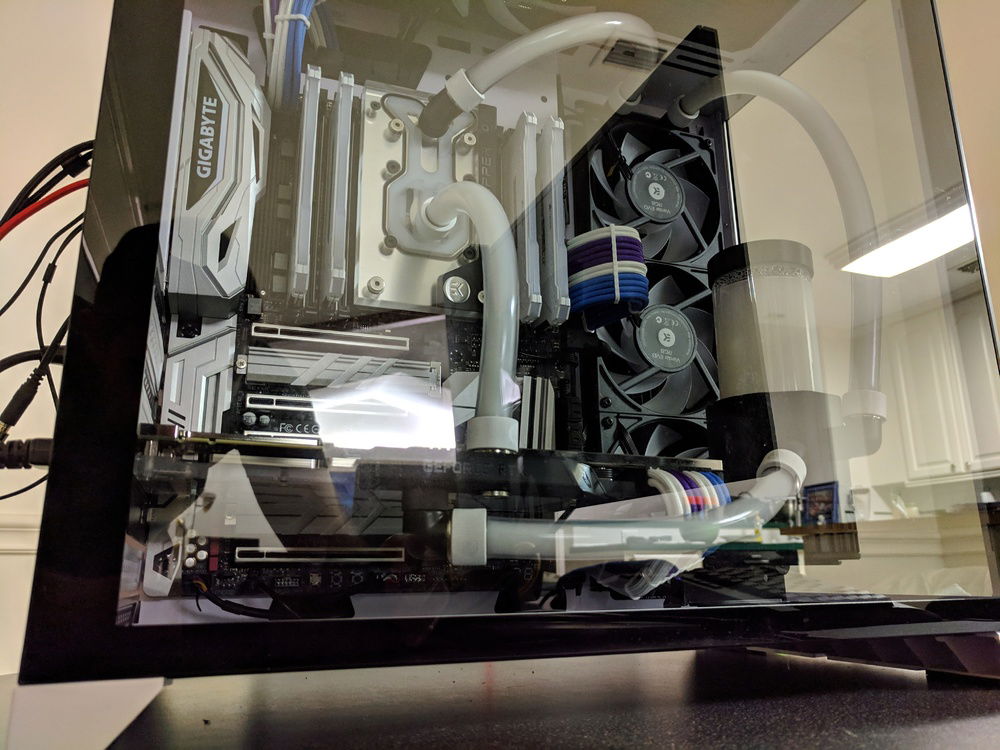 First time custom loop build. Did AMD way back in the day (Thunderbird / Athlon) and thought I'd try it out again for my new gaming machine. Most the parts are chosen for their looks.