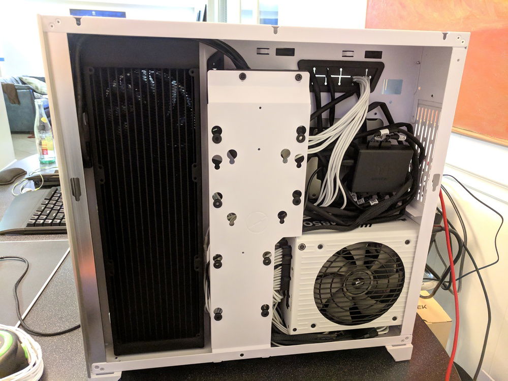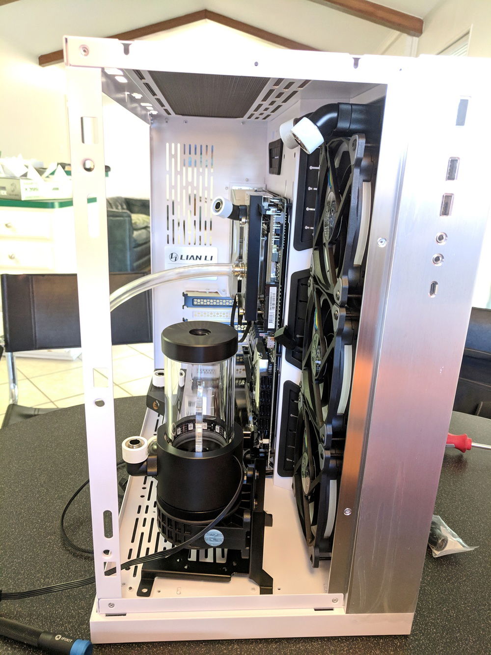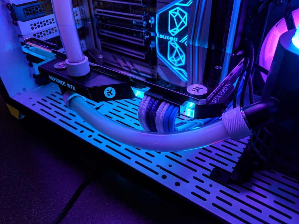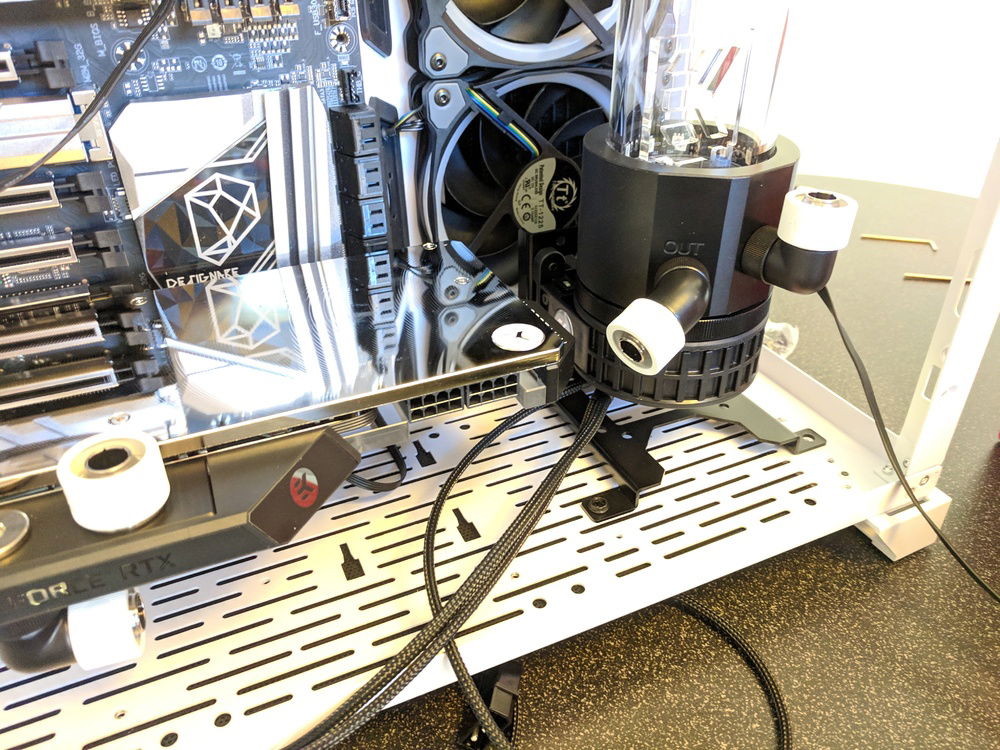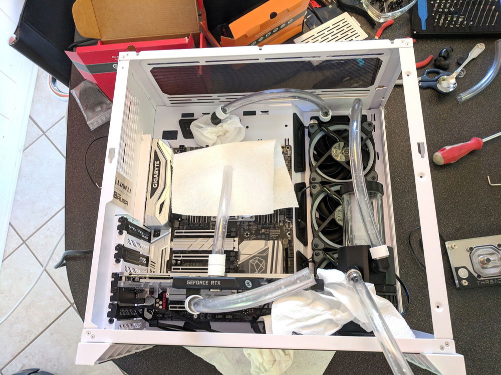 * I should have added a way to drain the coolant. The initial coolant flush was a pain. But it was manageable. By sucking as much as I could out of the reservoir, closing it all back up, laying case on its side, then disconnecting the GPU to reservoir hose after the coolant drained out. This allowed me to attach another hose to the disconnected fitting and drain both into a large bowl.