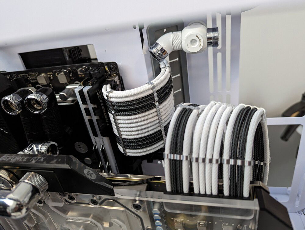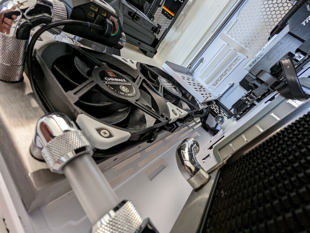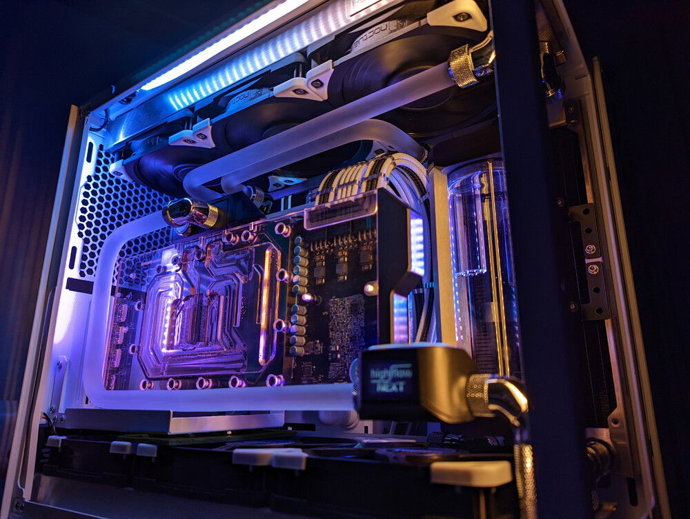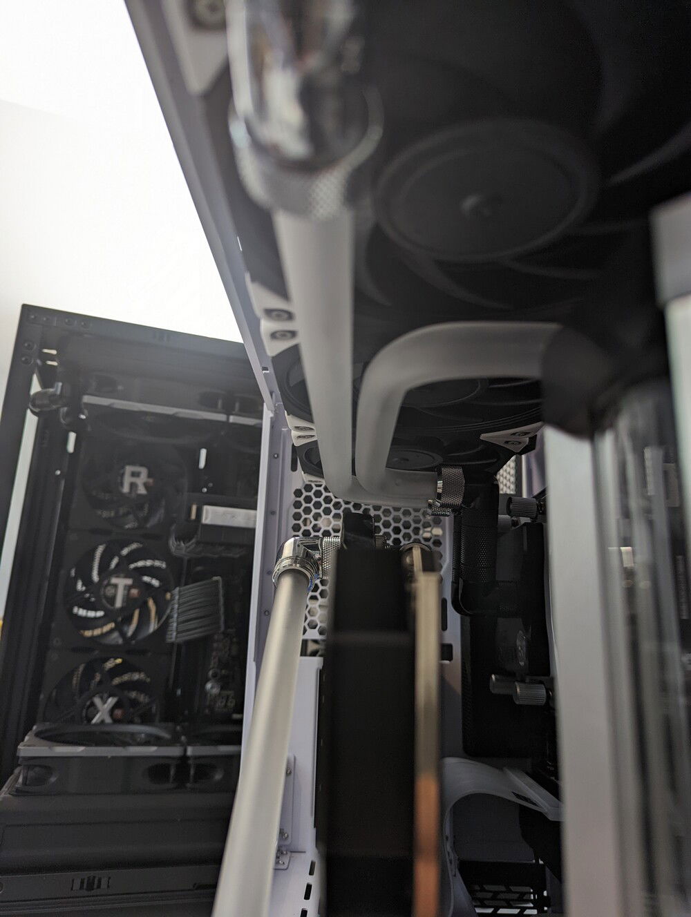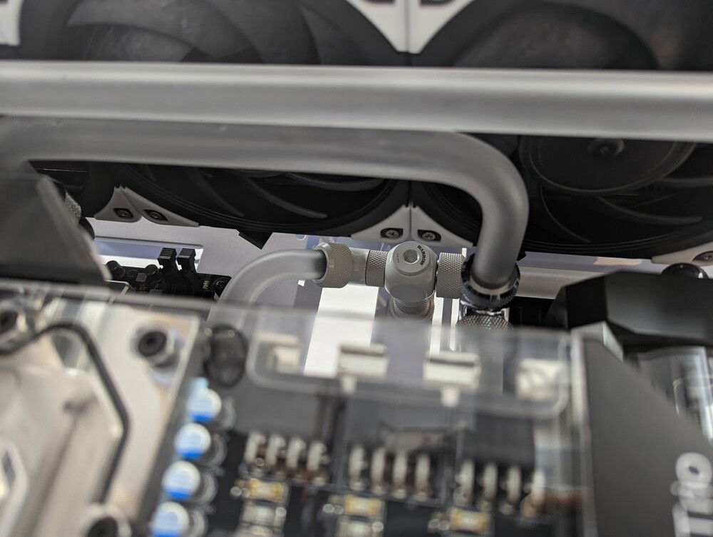 Another O11D Mini custom loop for a client. This one is pretty similar to the Neon Concentrate build in overall layout. 2x360mm rads, 1x240mm rad, ITX mobo, vertical GPU, standalone res in the main chamber, pump top in the back and a convenient filling and draining system. You can check out that build for a more detailed run down. Once again, I didn't get a chance to take high quality photos, but you can see a bit more of the tube layout here.