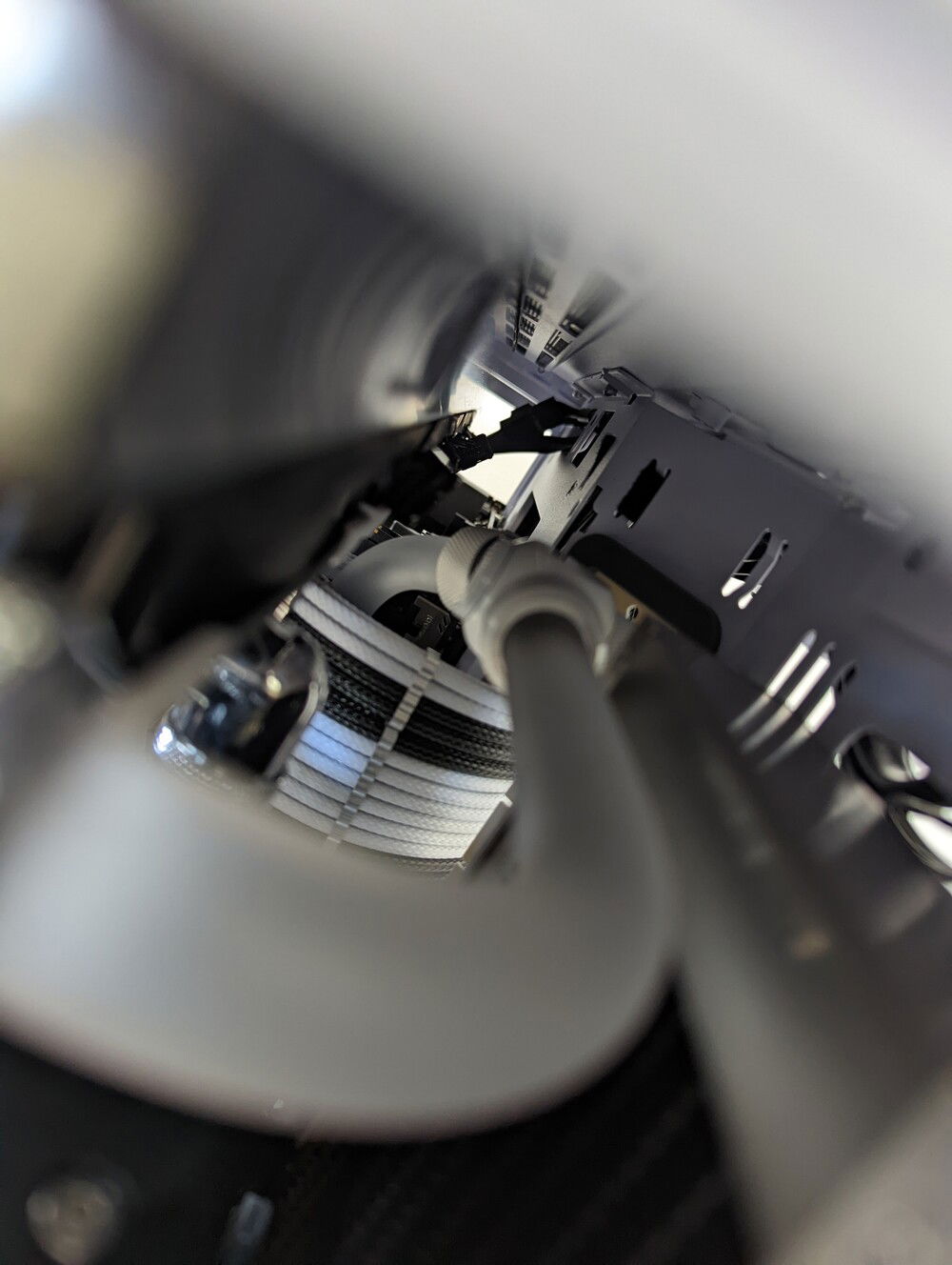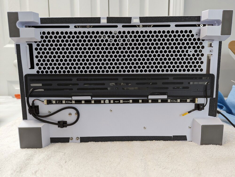 I started this build months after my previous Mini build. I took that experience and simplified things. I modified the stock O11D Mini vertical GPU bracket to clear the bottom radiator, while putting the ITX mobo in the middle position. All that is required to do this is cut bottom edge of the mobo i/o bracket. Needless to say, this was far easier than creating a custom panel from scratch. The downside to this approach is the Lian Li bracket is pretty flimsy and the bottom support for the GPU will have to be braced against the bottom fans/rad (I used a 3D printed piece). The narrower radiators enabled me to do a drain port tube run from the bottom of the reservoir to the back of the case.