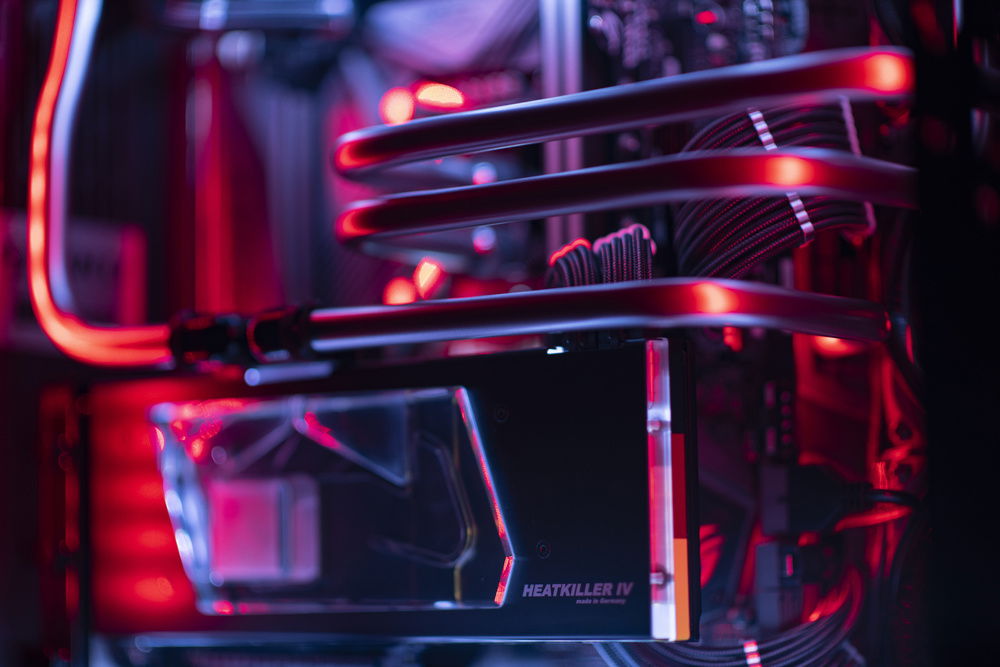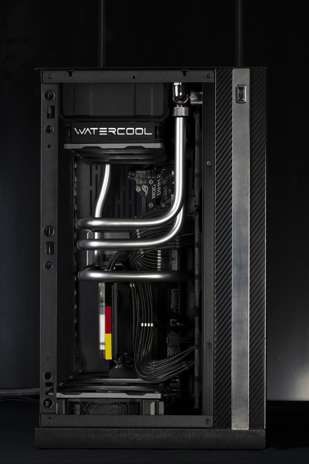 Clockwerk Industries. For a dash of color, I added a vinyl German flag to the GPU block since Heatkiller and Noiseblocker are German brands. The RGB Halos fan frames and Aquacomputer LED strips provide the lighting. I find that white or red and white are the best colors. Putting the reservoir(s) in the back opens up the main chamber and allowed me to do more uniform and minimalist tube runs.