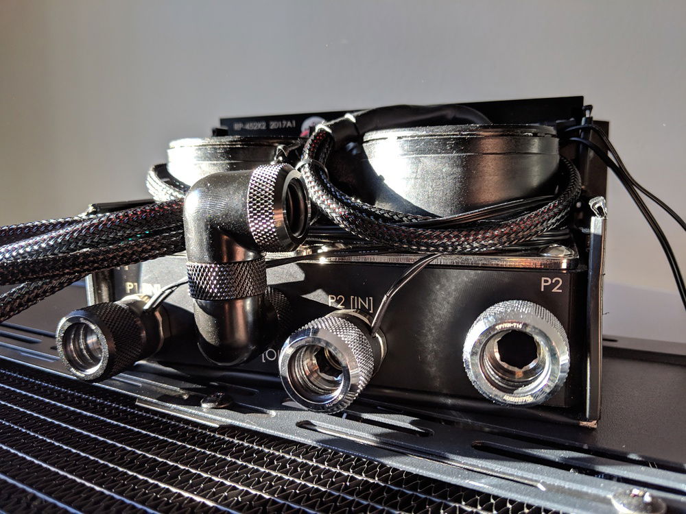 For acoustics, each D5 only having to handle 1 rad and 1 block means I can keep the pump RPM range very low 850-2000rpm (below fan noise). The noiseblocker fans are terrific at low RPM. Outside of the A12-25s from Noctua, I haven't heard a quieter fan. I have all my fans capped at 1000rpm up to any water temp below 38c (which I only reach on hot days). The bottom 3x140mm fans are on 7mm thick rubber gaskets that not only dampen vibrations, but raise the fans from case floor, which reduces air turbulence noise at higher RPMs. Finally, the top, rear and back side case panels as well as the pump housing are lined in sponge neoprene. I was very skeptical this would have any noticeable effect... but at least for the back side case panel, which I can A/B test, there is a noticeable reduction in buzzy/high pitch noises from the pump. Combine all that with the overall good airflow of the O11D and you've got a system that is cool and quiet.