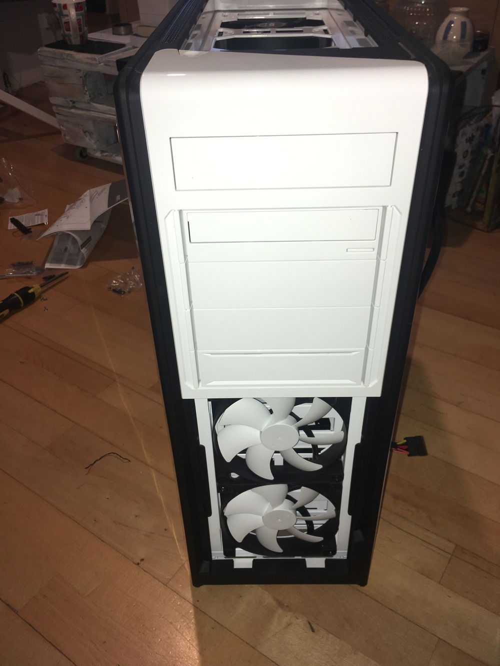 Front. Blue and white power switch wire stripped bare and tapped together to boot