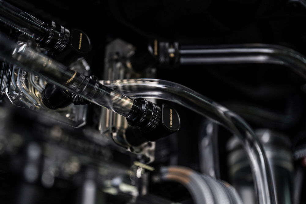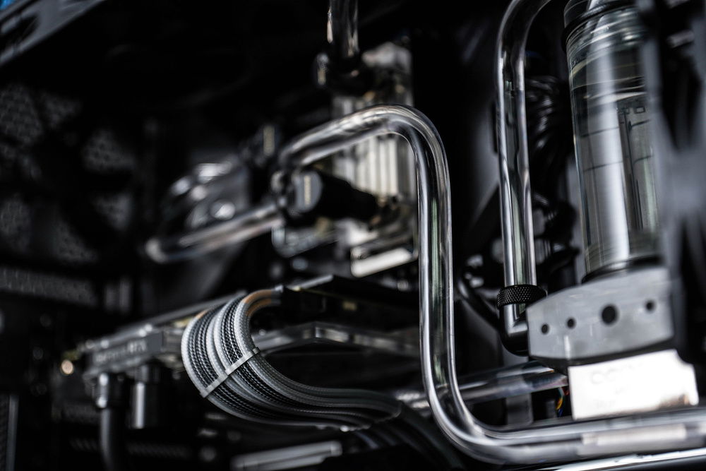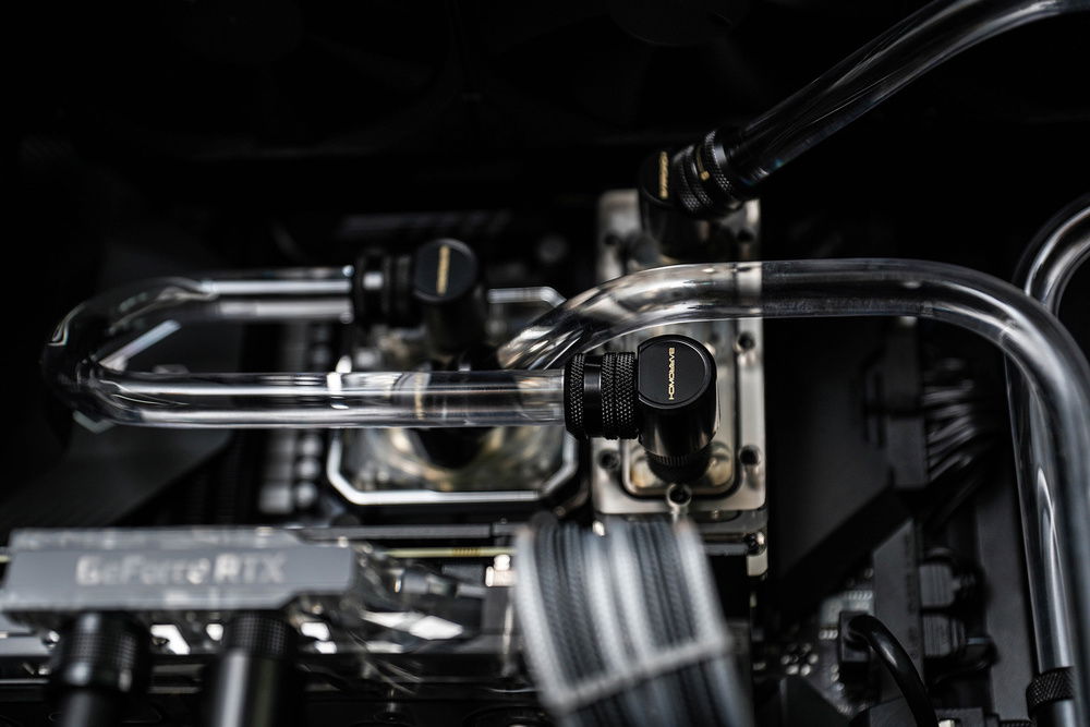 This unique water loop design takes inspiration from the longitudinal shape of the Fractal Design S2 case, incorporating many clean horizontal lines that intertwine with each other. Clear PETG tubes are used alongside singular chrome and matte black tubes, to provide the visual distinction of a half-and-half, hence being christened "Duality".