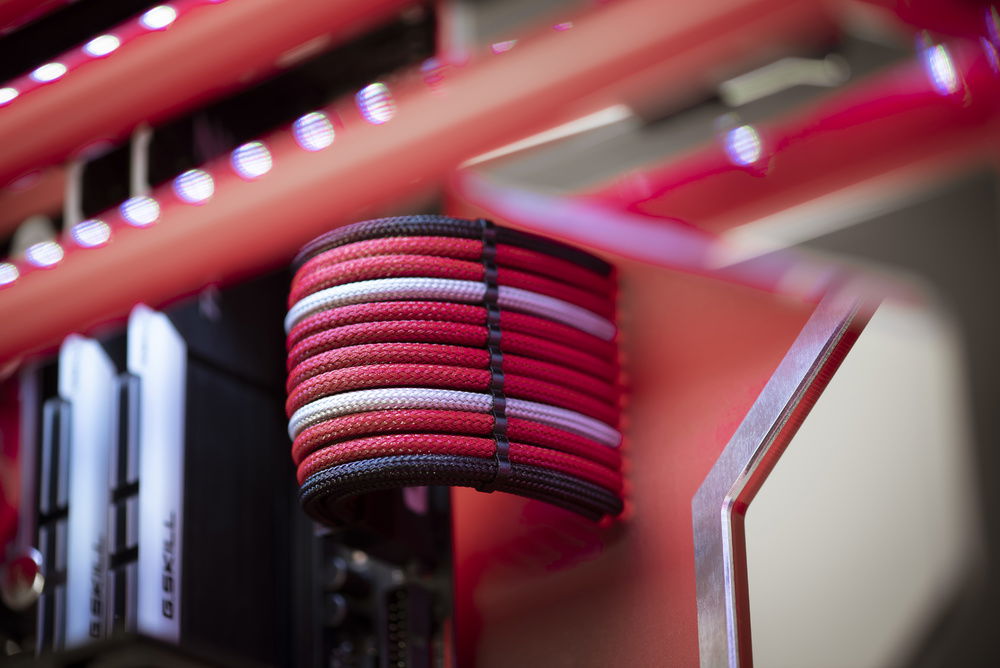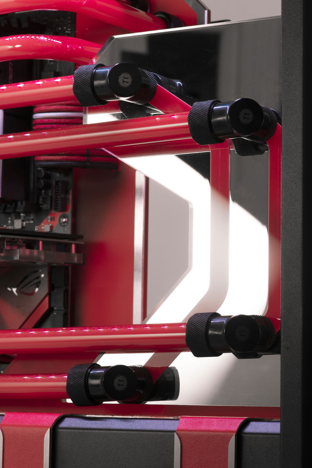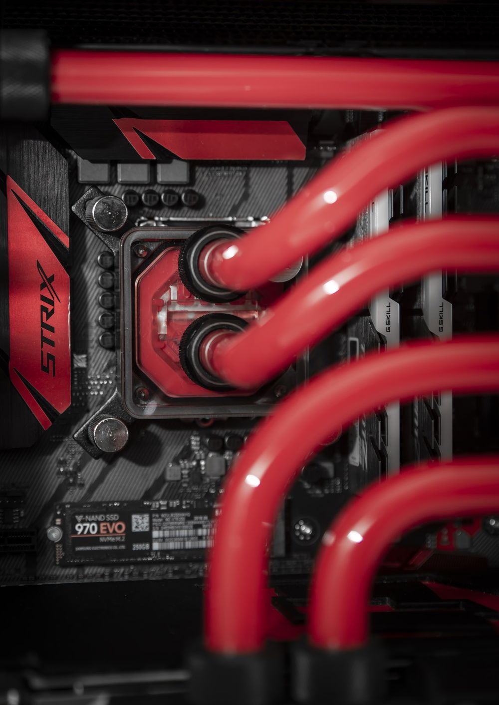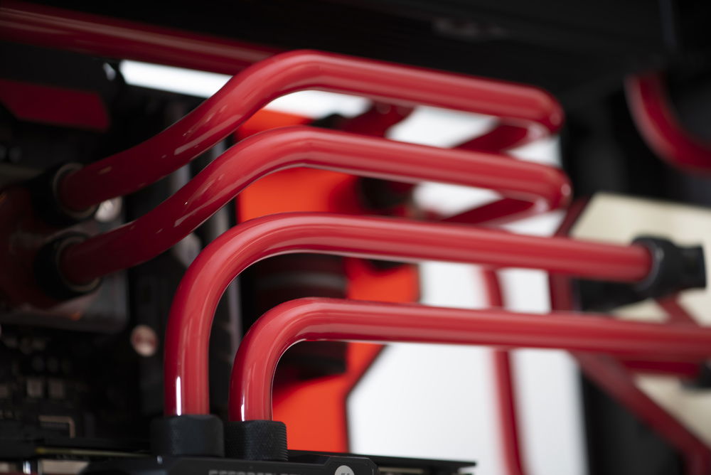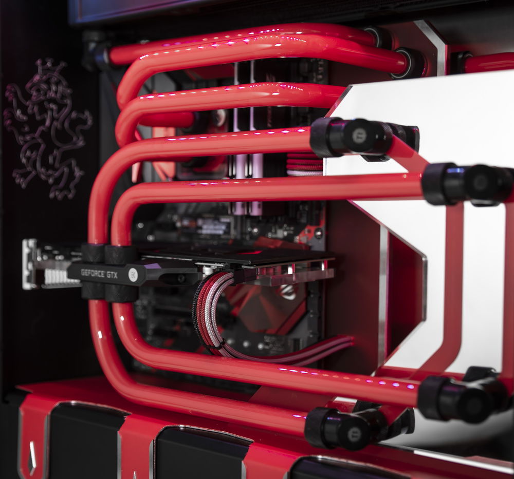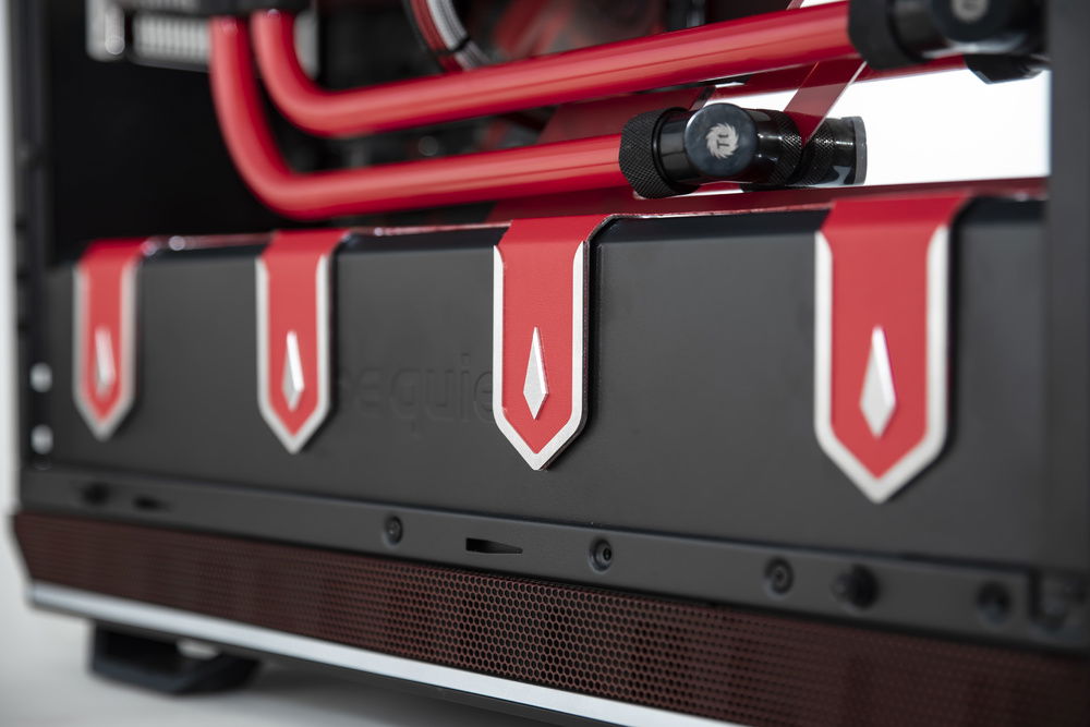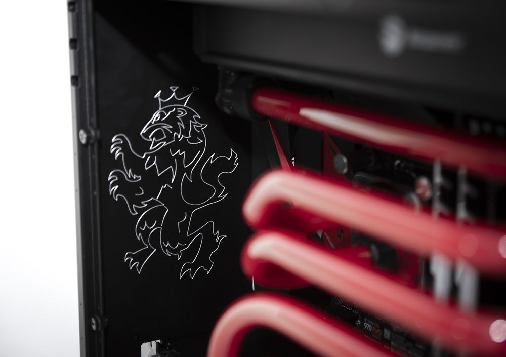 Based in BeQuiet's Dark Base Pro 900 rev. 2, the build features a fully reworked interior made from scratch. I used leather to add texture to the rear panel and PSU shroud, along with frosted red acrylic for colour. There are two distribution panels constructed from mirrored acrylic that form the basis for the watercooling loop, along with fully custom made cables to keep things neat and clean.