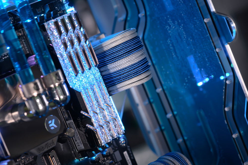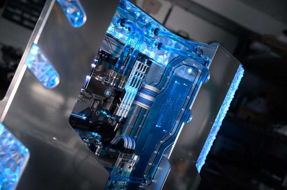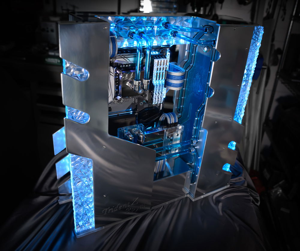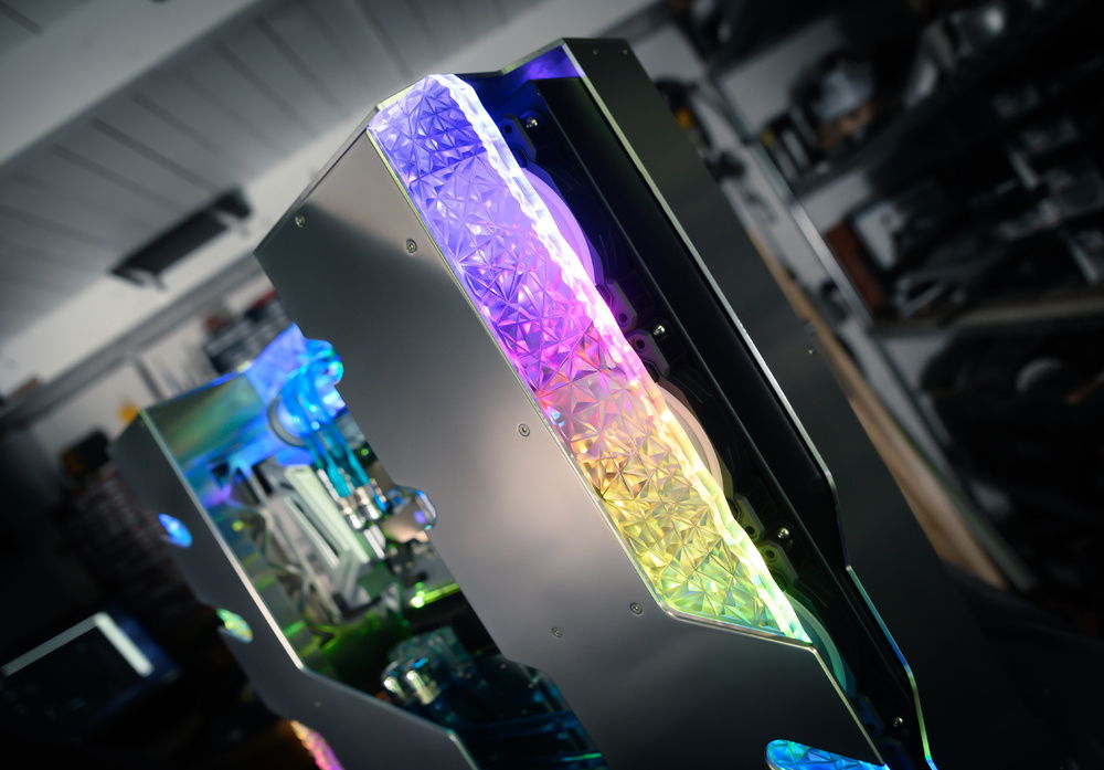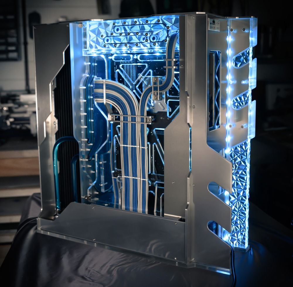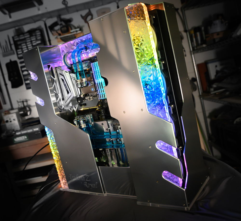 The entire chassis was designed from the ground up to show off G.Skill's Trident Z Royal RGB memory. To do this I incorporated their crystal pattern into the distro plates and lighting panels. The pattern itself is 3D milled from acrylic, there are no decals or films used here and everything was cut from scratch by me.