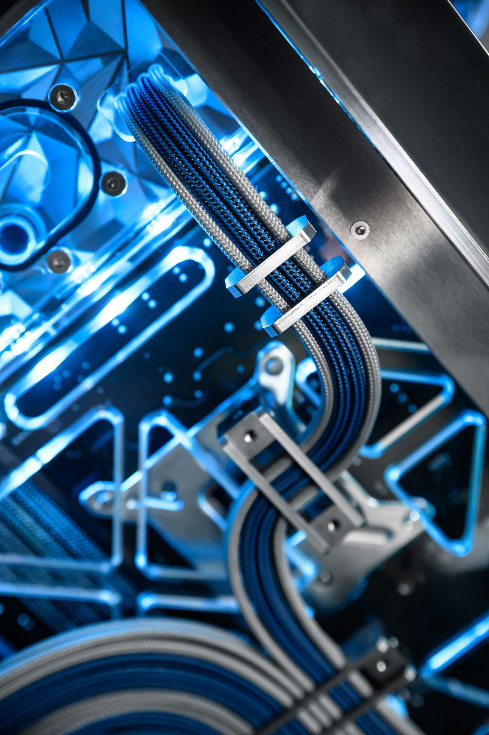 The frame is constructed from 3mm, 4mm and 5mm aluminium, all CNC-cut and polished. Most of the watercooling is handled by a pair of distro plates, one of which includes a DDC pump mounted directly to it underneath the PSU shroud. The cabling is fully custom, with each wire cut to length so that the runs are perfectly even.