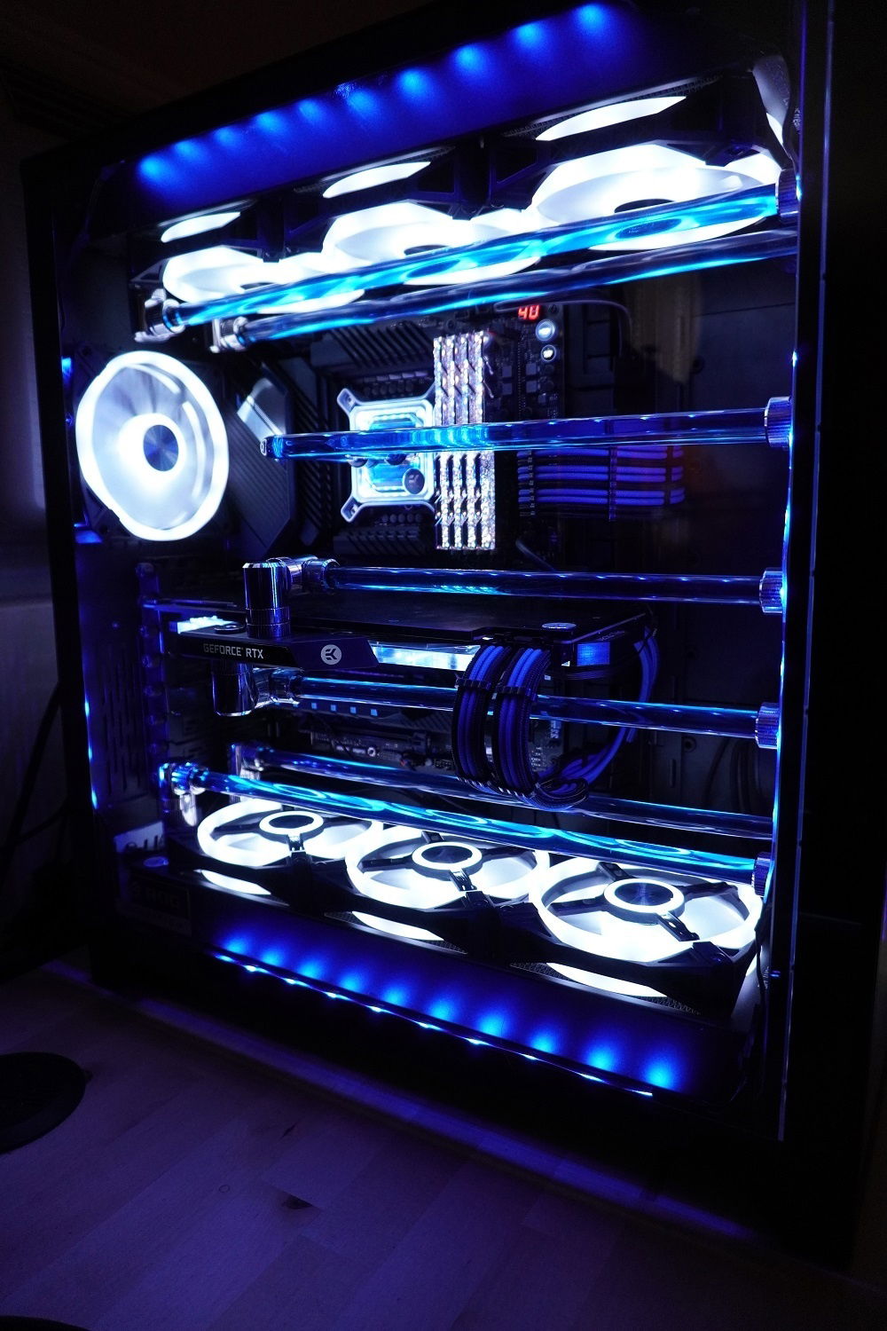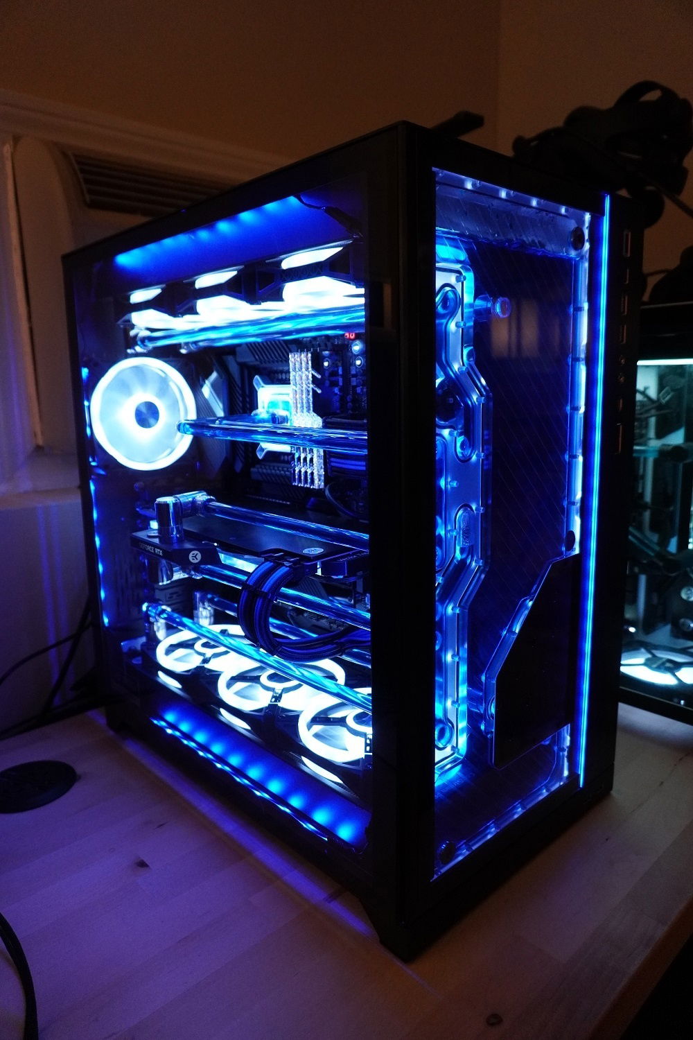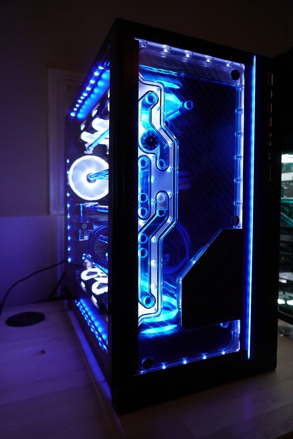 A year ago I built a machine in the original o11d with the EK side distro, It was close to the vision I had for it but not quite. I decided to take another stab at it and went with the XL o11 (mostly for the extra rad space) and the front distro plate from EK this time. Another big change for the look was switching from EK cryofuel Navy Blue to Alphacool Crystal Blue which was a much deeper blue.