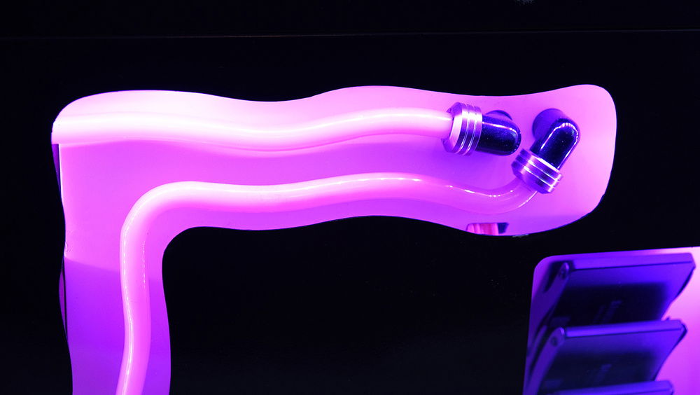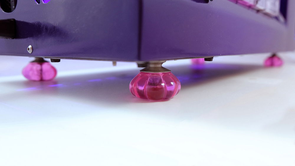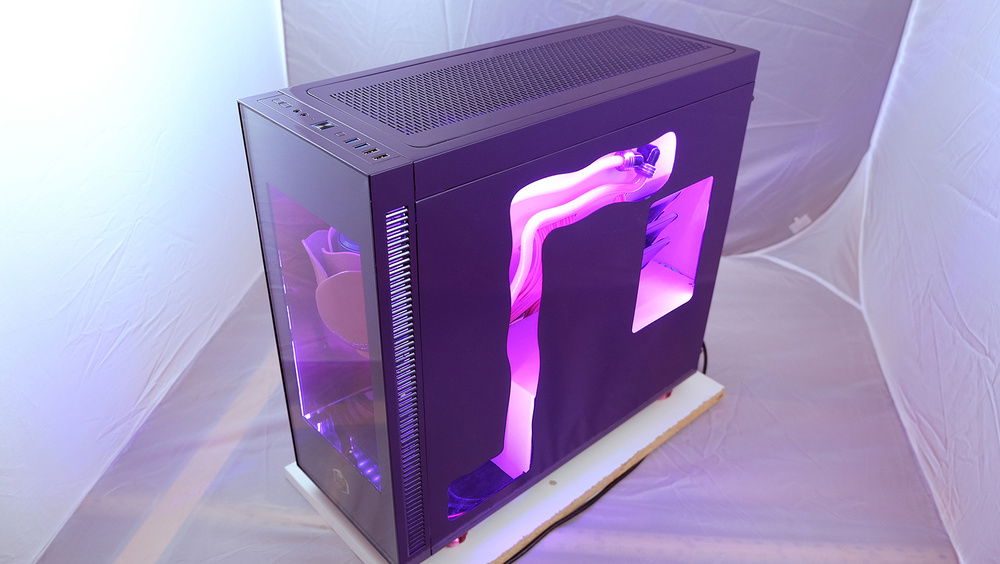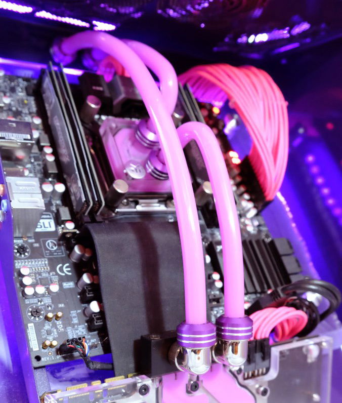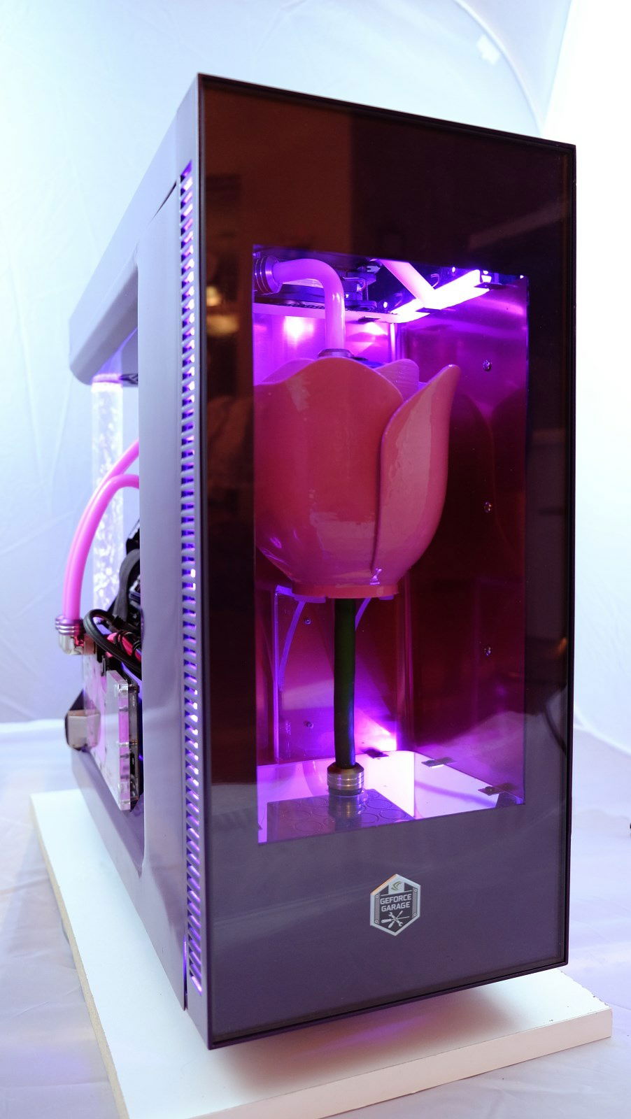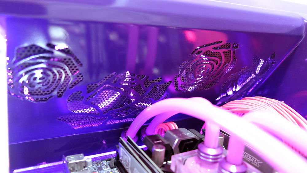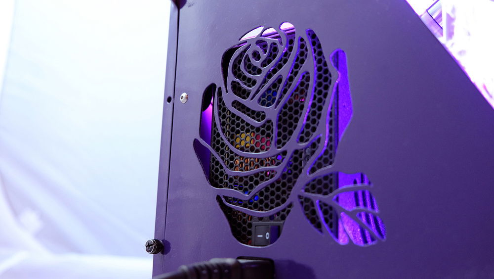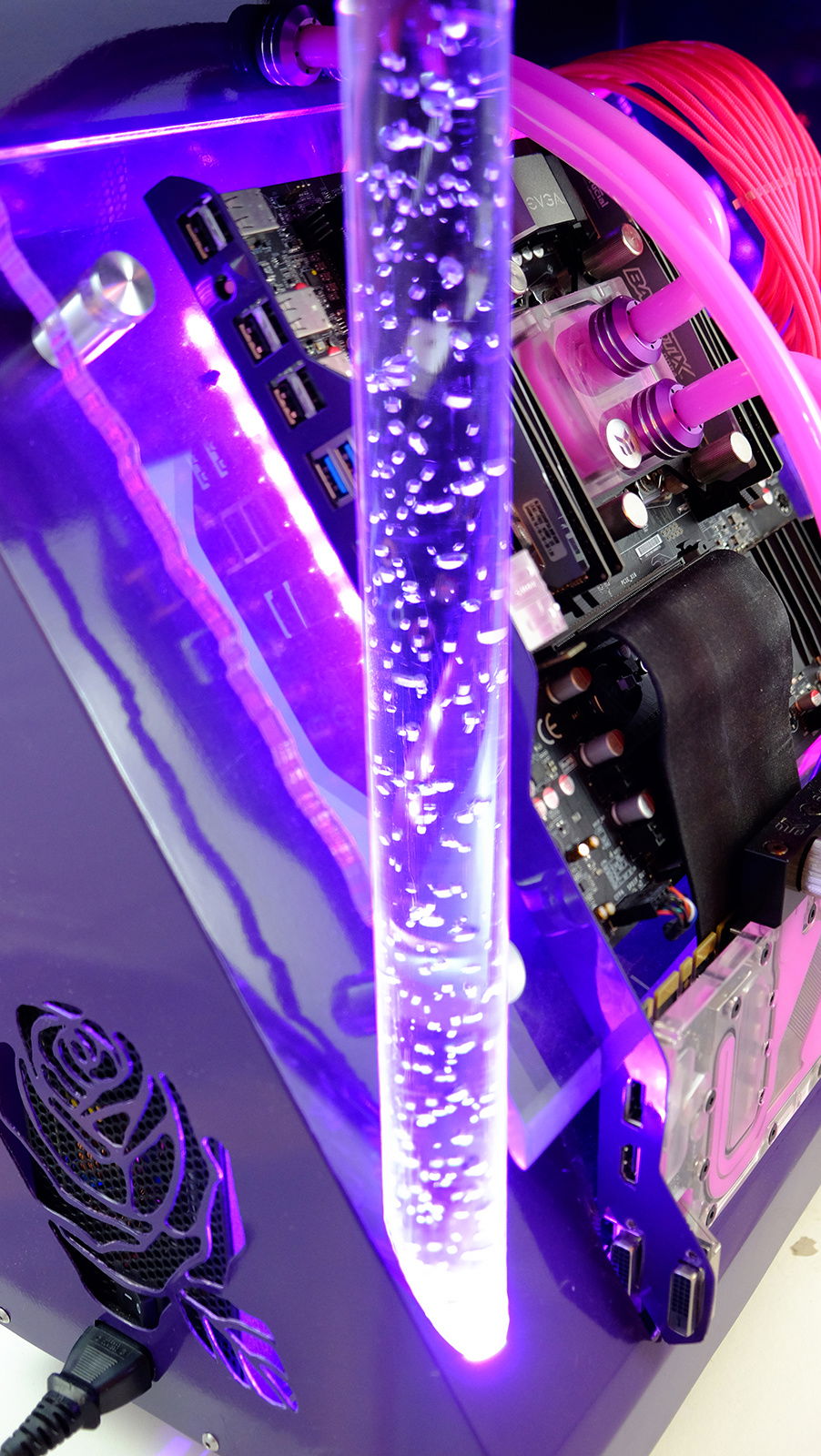 I built this case for my daughter a few years ago.. She requested a rose-themed PC, so this is what I came up with. For the color palate, I used her favorite colors, purple and pink. A 3D-printed a pink rose takes up the entire front of the case. I made it large enough to incorporate the Primochill tube res, then disguised the rigid tubing that feeds into the pump as the stem of the rose. To show off the hardware, I fabricated a slanted panel to replace the stock side panel and mounted the EVGA motherboard and graphics card externally. I always wanted to add a bubbler feature to a case, and this was my chance! But don't worry, it's separate from the system's liquid cooling lol. On the back side, I cut two windows in the panel to specifically hilight the SSD cluster and the organically styled rigid tubing that runs from the pump up to the radiator and thru to the components on the front side. Not wanting to add screw-on fan grills, I meticulously cut rose patterns into the steel sheetmetal for the radiator as well as the power supply intake. Lastly, I used pink rose drawer pulls made of glass as the case feet to round out the theme. Thanks to Primochill, EVGA, EKWB, Crucial, and Thermaltake for their continued support!