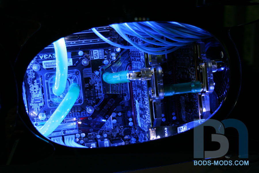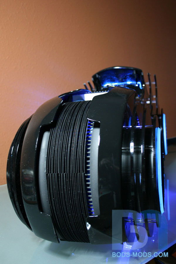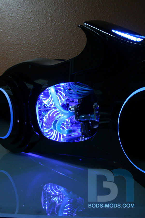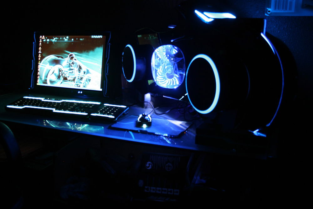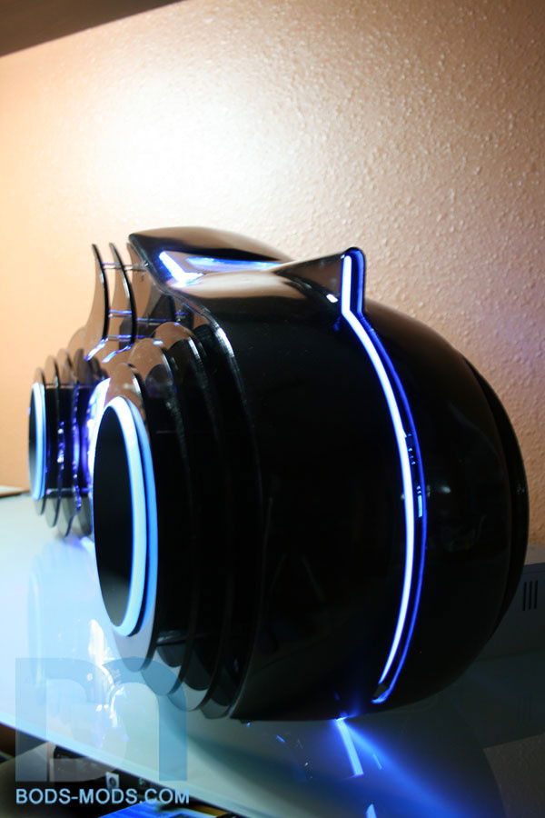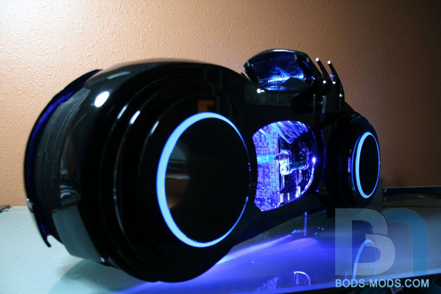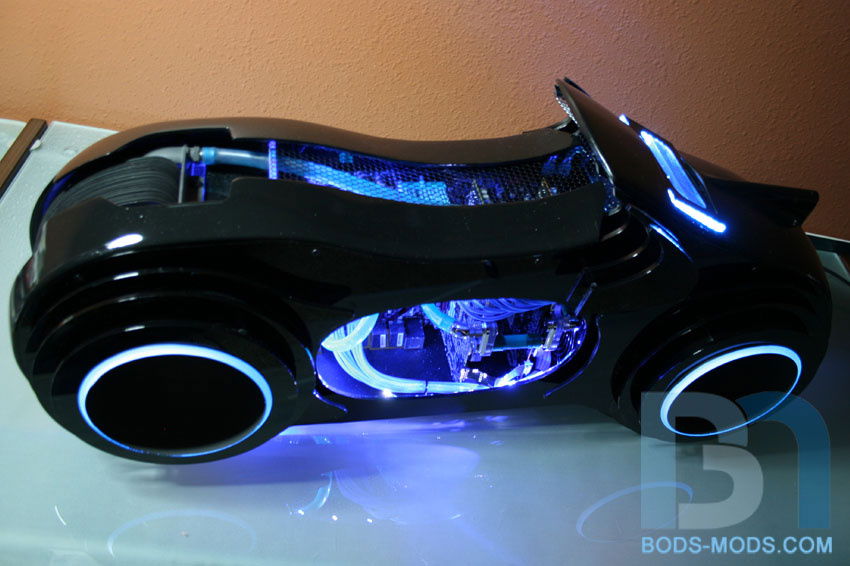 This was my entry into Cooler Master's Case Mod Contest in 2011, for the scratch build category. Fabricated out of acrylic sheet and tubes, with the hardware mounted in the center. The tubes were edge-lit, as well as the light wall emitter on the rear of the bike. A custom curved radiator was made to fit around the front tube. the "engine" was also made from acrylic, and houses three Crucial SSD's. The front and rear fairings were fabricated using Plasti-Paste (a 2-part plastic fiberglass resin). Razer was kind enough to support the build with their TRON themed gaming keyboard and mouse. Thanks for reading!