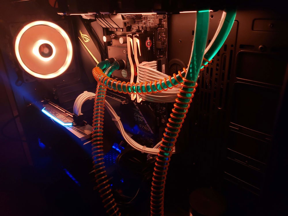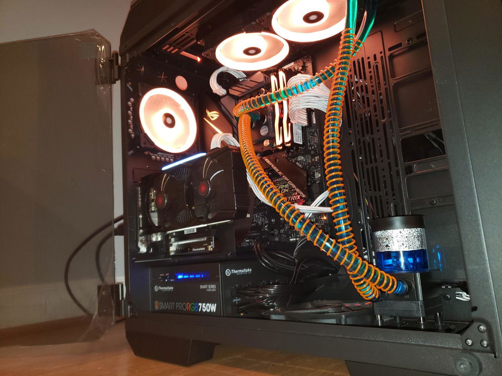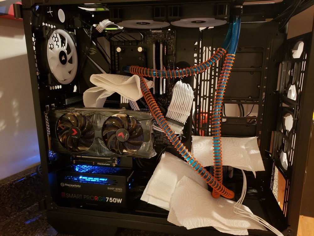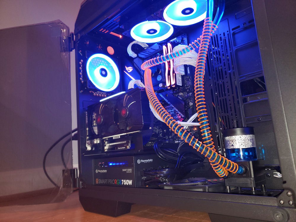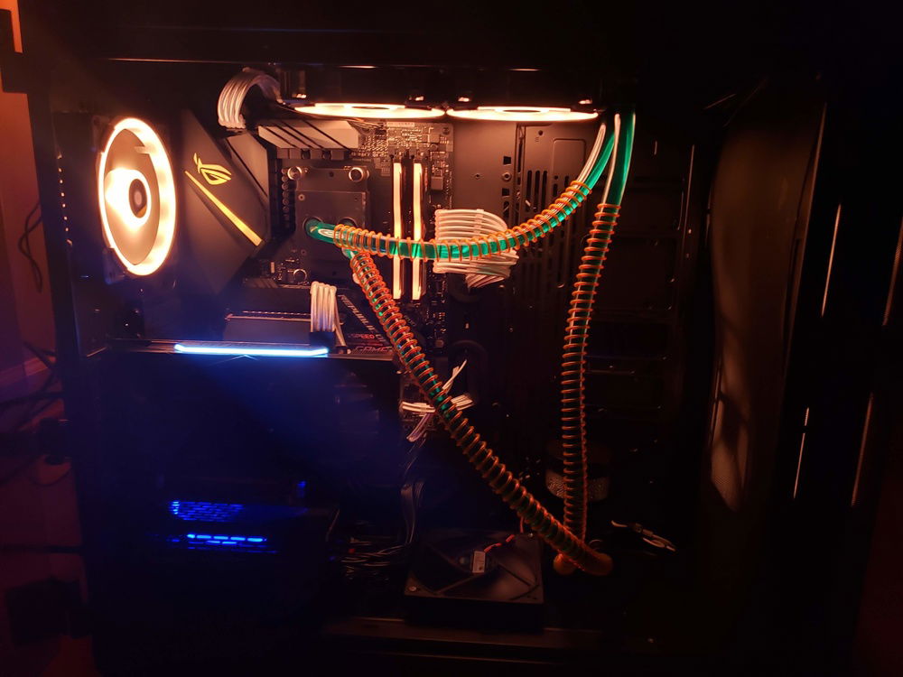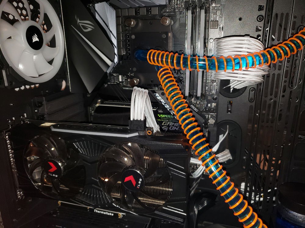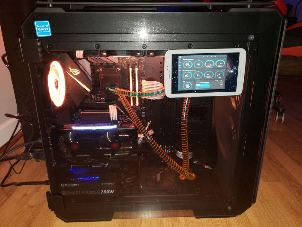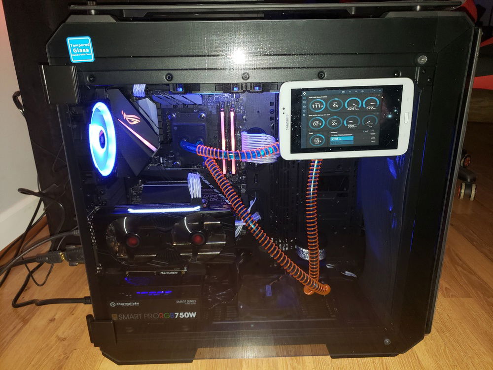 First build, Yes! now that's out of the way where to start. I didn't run into too many issues other than me freakin out at parts since I have never build a system before. It took me longer than most once I got all my parts because I would work on it after I got off from work throughout the week. So the main colors I stay with is orange and blue(hence the name O'blue). The coolant is actually blue but I notice, as you can see in some of the pictures, it comes off as green depending on the color of the Corsair LL fans. I had 6 extra fans that I ended up with but originally didn't have any plans to use but I used 3 of them, all non-RGB besides the Thermaltake case fans that came with the View 71. The 240 radiator at the top is in push/pull configuration with the Varder fans at the top. Threw an extra coolermaster fan at the bottom pulling air in to help with the GPU being vertically mount and I plan on possibly using one of the Thermaltake blue LED fans that came with the View 71 and putting it to the right-back of the motherboard. I wanted to water cool the GPU as well but couldn't find an aluminum water block for the PNY RTX 2070 card, unfortunately. Speaking of which I got really lucky to find the PNY 2070 brand new unopened for only $350 off of eBay. I know the orange anti-kink coils can look a little tacky to some but I haven't seen anyone use them so I wanted to use it to be a little different lol. I saw a few builds using a small screen as temperature monitors and thought that was one of the coolest things I have seen so I remembered I had an old Galaxy Tab 3 and so I set it up to show the CAM tool. I was originally going to keep it on top of the case since I could just look down to see it but decided to install it inside. Overclocked the 2600x currently up to 4.1 GHz from the base 3.60GHz. Only have 500GB but will get a 1TB NVMe soon (I really need more space I'm already at 300GB). Let me know what you think, complaints or praises, I'm just ecstatic I FINALLY got to build a system at 31 years old and I'm itching to build another....maybe I can convince the wife she wants one build :)