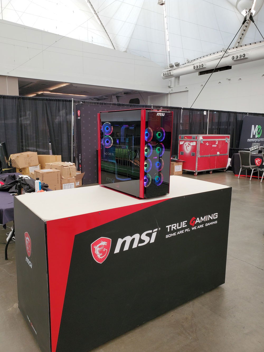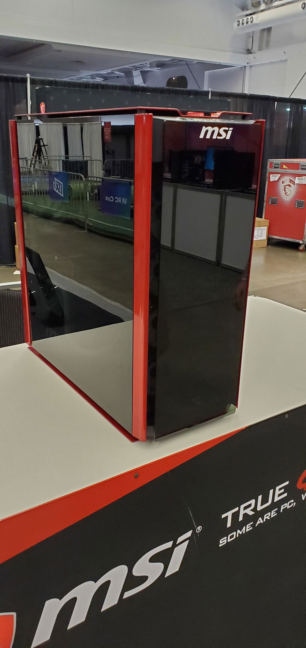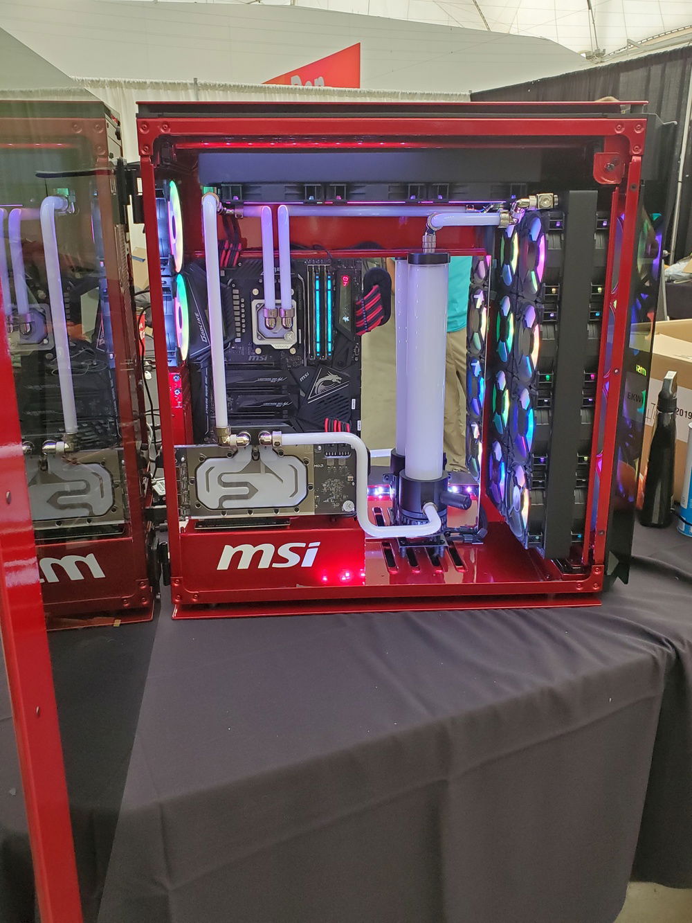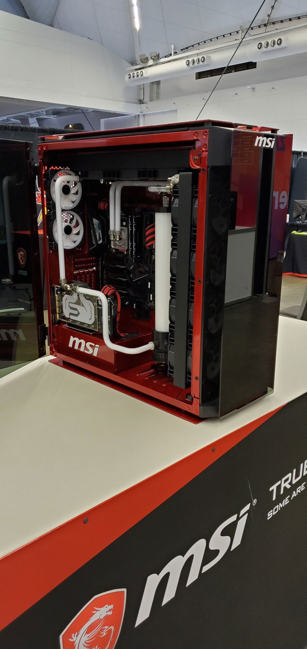 Thank you MSI Gaming for trusting us to build your new showpiece. At 109 lbs. it's more like a "Showbeast". 😜 The focus here was to build a mod that showcased the motherboard. We built the mod around keeping the board visible so we moved the GPU to the front and down low. The hard line tubing was placed so that it would add to the design but not distract viewers.