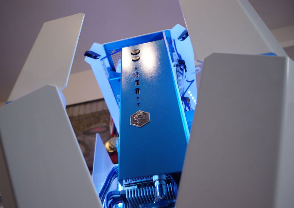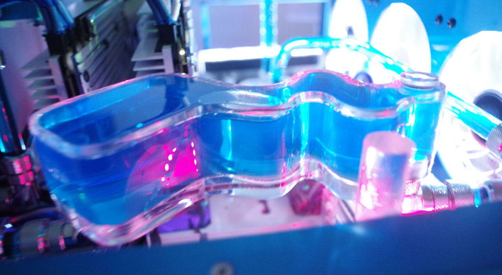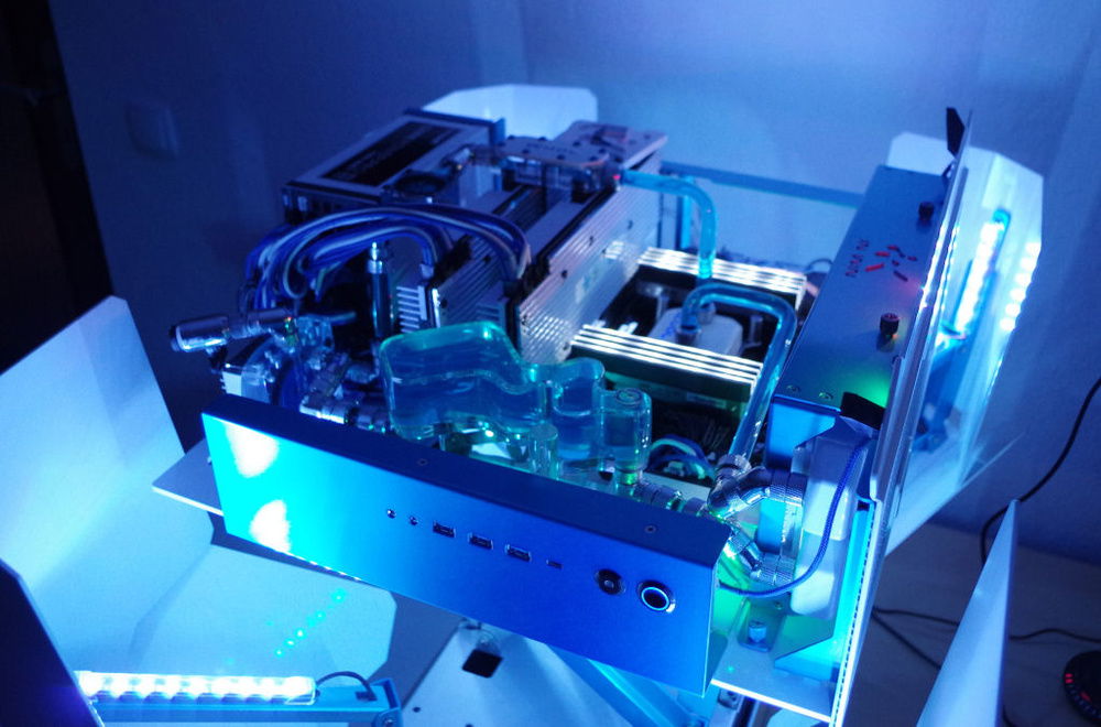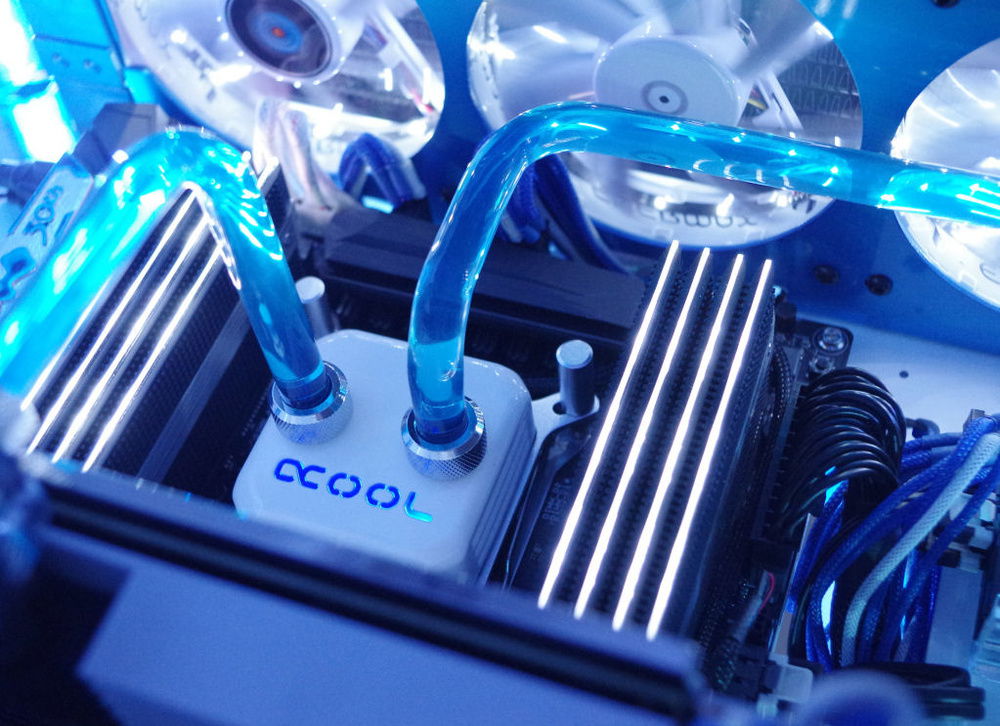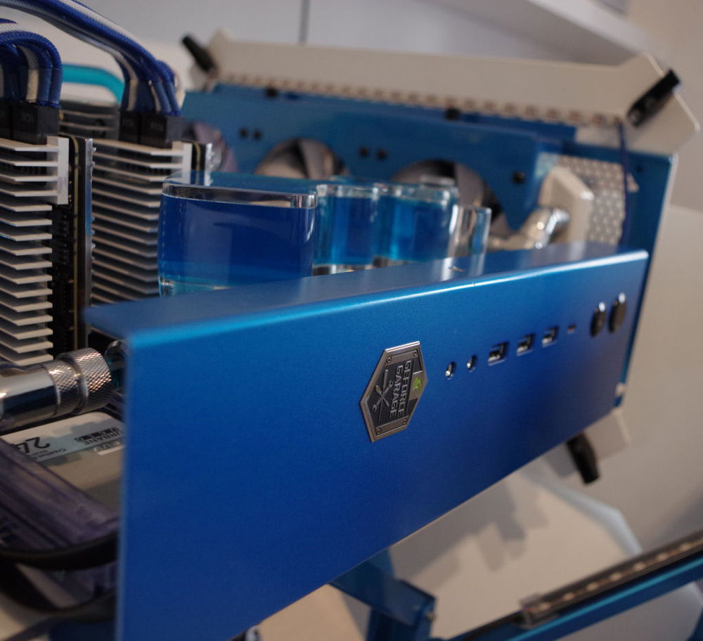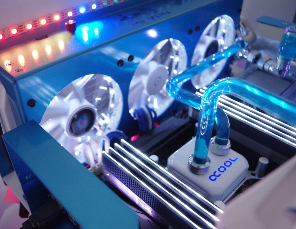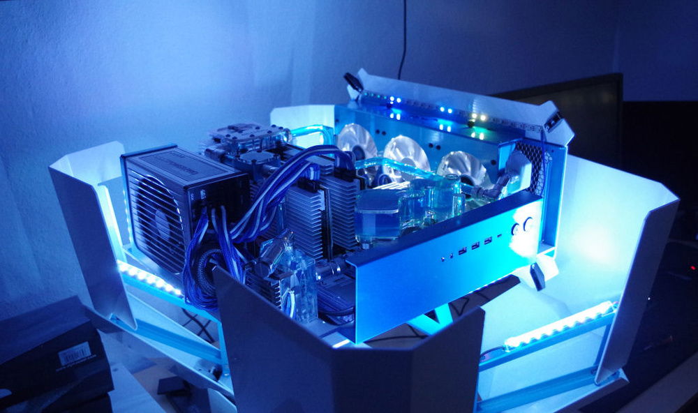 We altered the color combination from red/black to a sparkling white and blue combination and added a few details like the custom reservoir, custom lighting, custom Decals on Motherboard and SLI Bridge, custom SSD Holder and a few painted details. The Watercooling Loop was also build with custom painted radiators, CPU + GPU Blocks and Rigid Glass Tubing.
