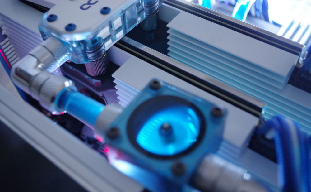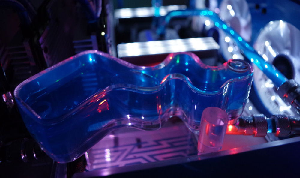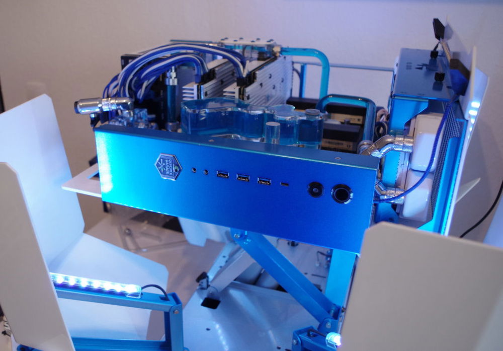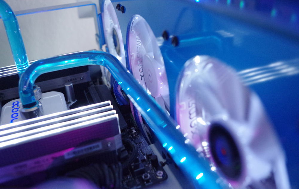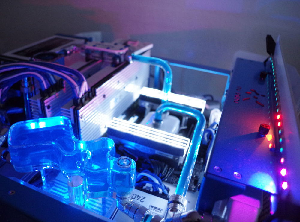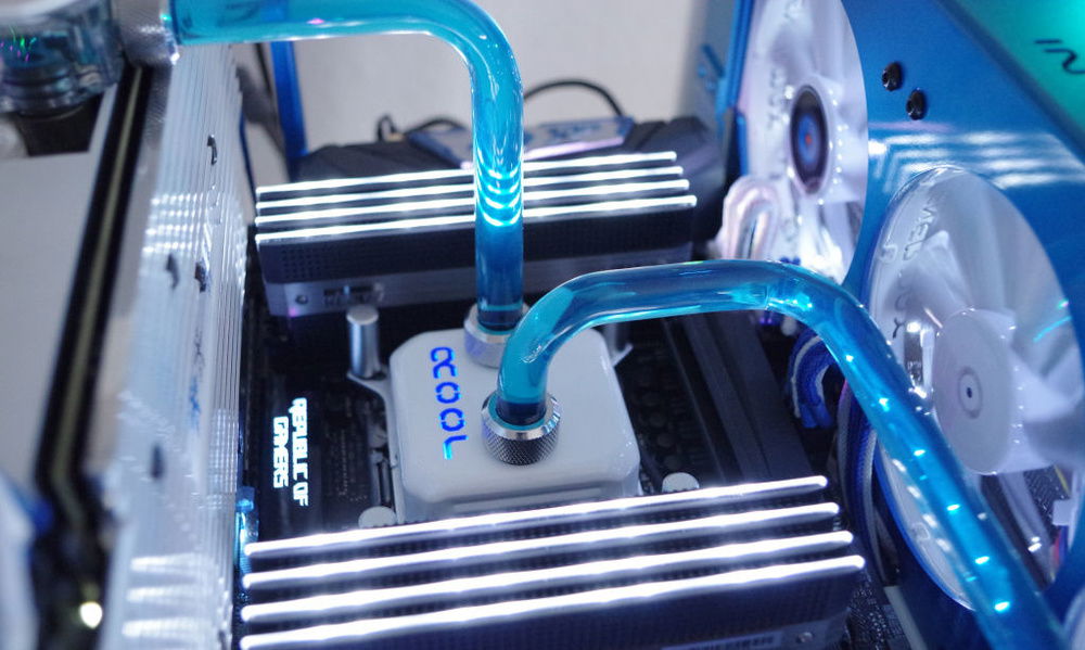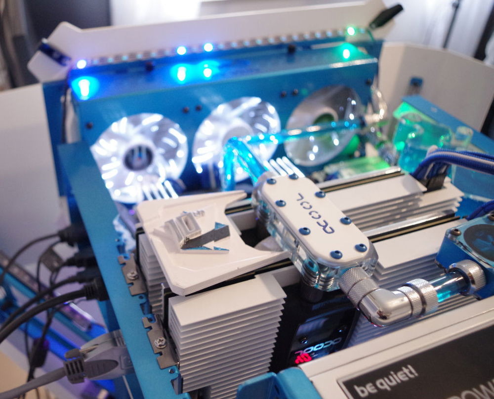 We altered the color combination from red/black to a sparkling white and blue combination and added a few details like the custom reservoir, custom lighting, custom Decals on Motherboard and SLI Bridge, custom SSD Holder and a few painted details. The Watercooling Loop was also build with custom painted radiators, CPU + GPU Blocks and Rigid Glass Tubing.