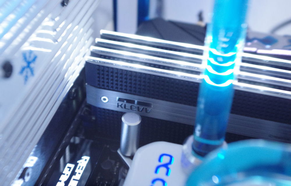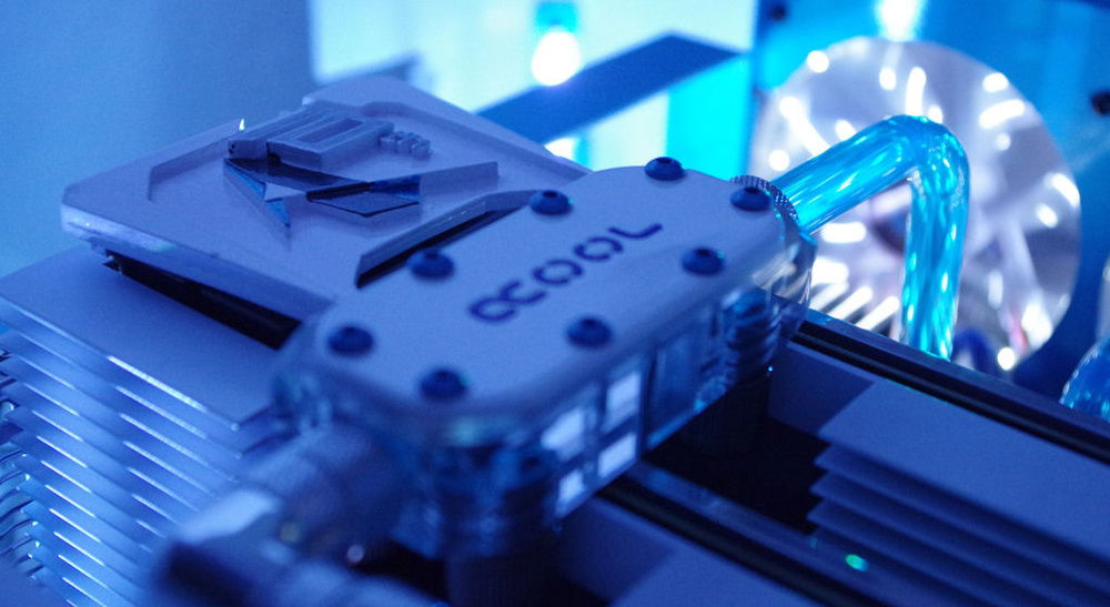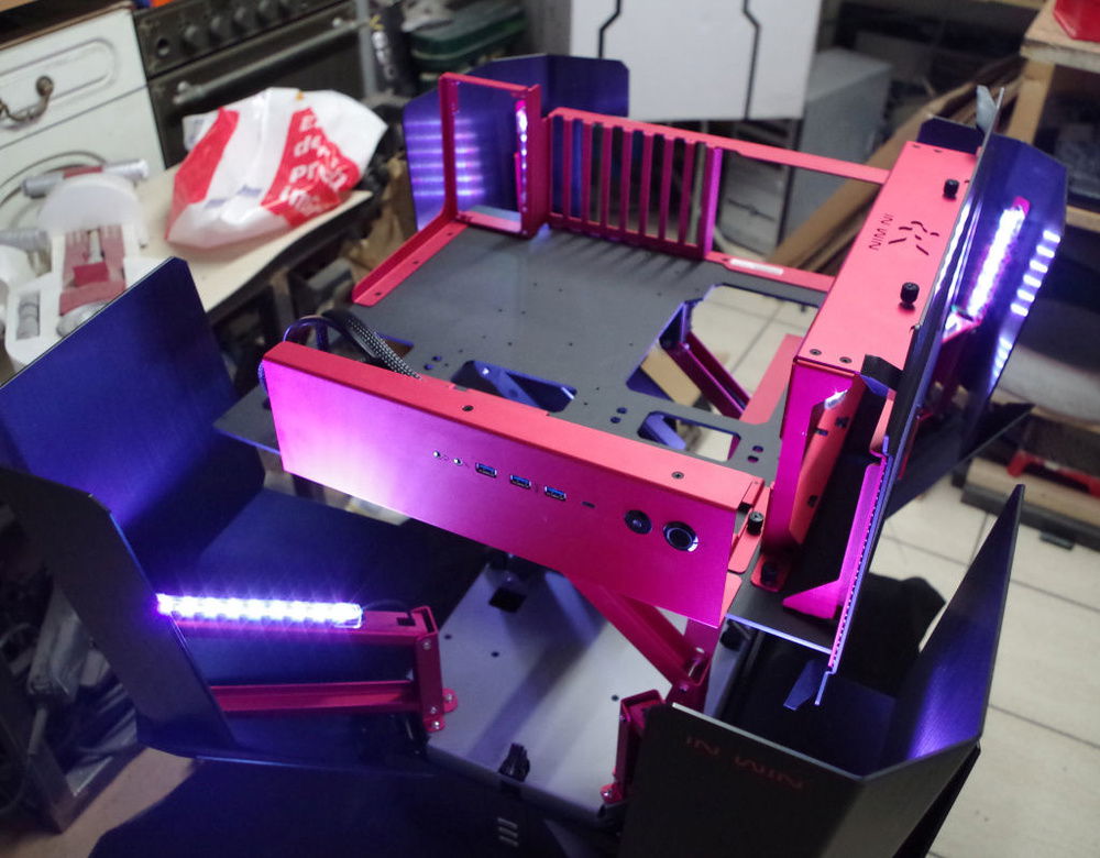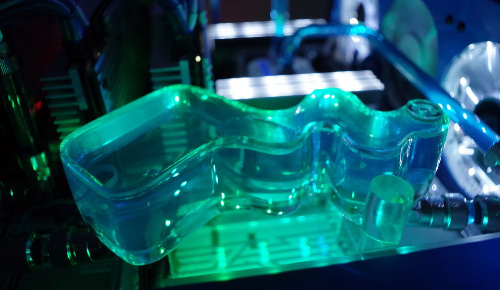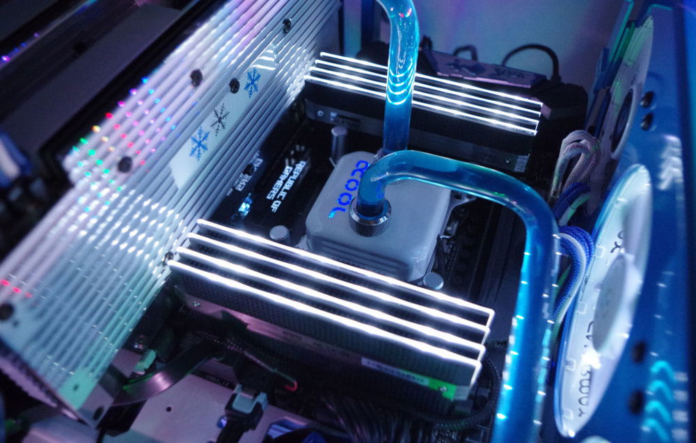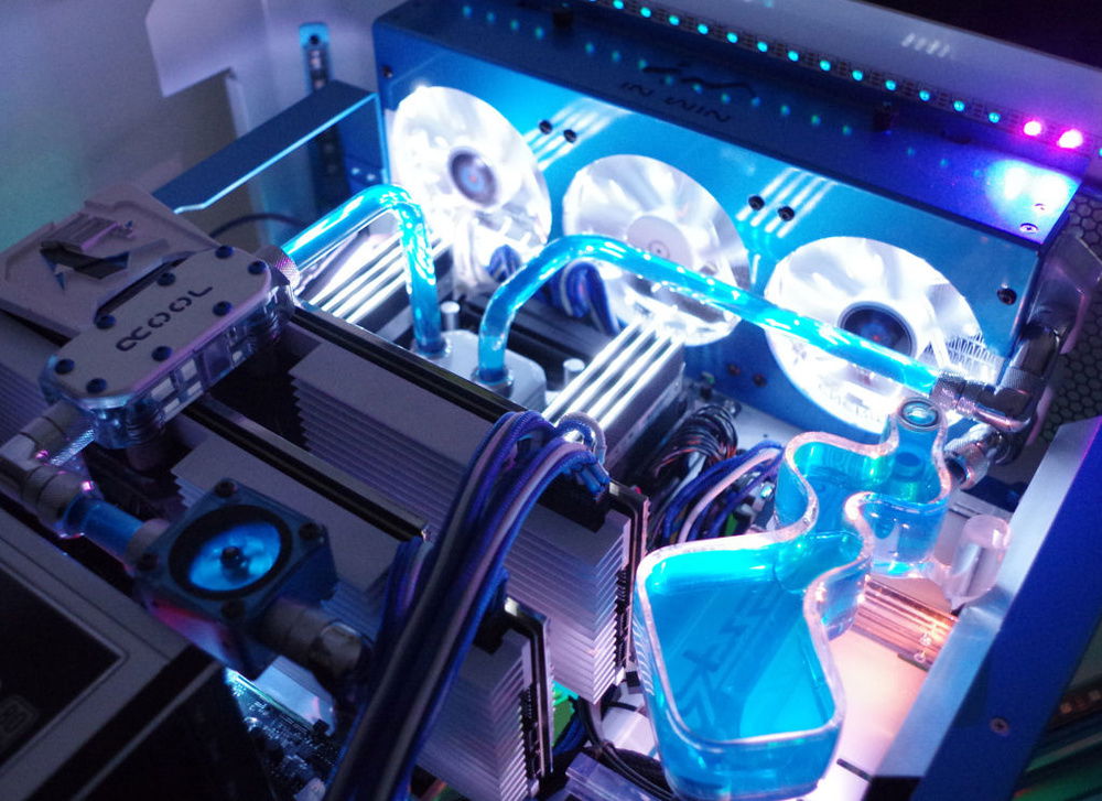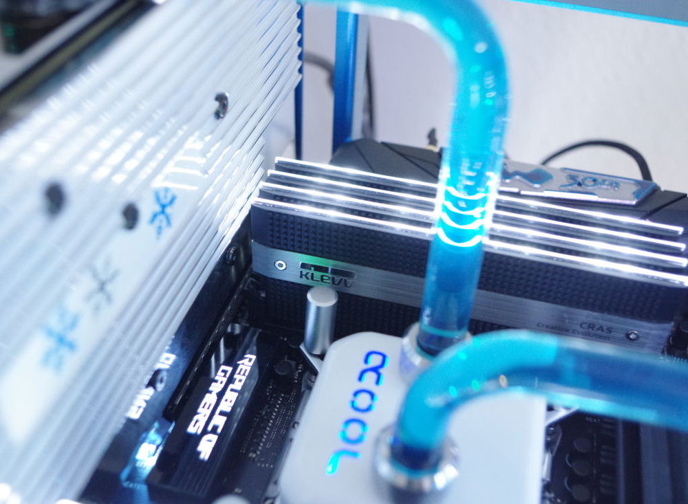 We altered the color combination from red/black to a sparkling white and blue combination and added a few details like the custom reservoir, custom lighting, custom Decals on Motherboard and SLI Bridge, custom SSD Holder and a few painted details. The Watercooling Loop was also build with custom painted radiators, CPU + GPU Blocks and Rigid Glass Tubing.