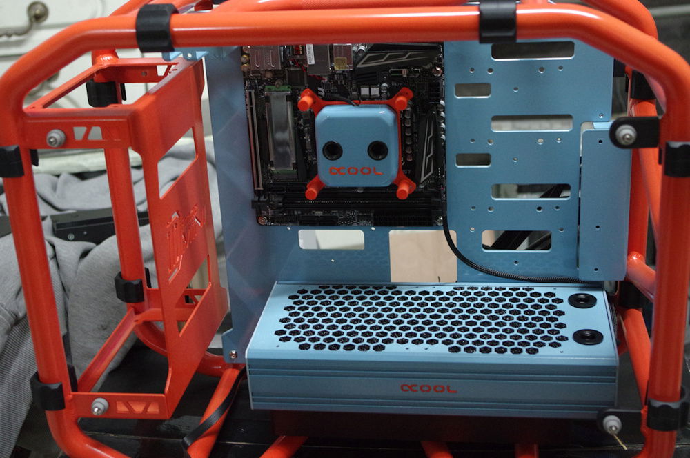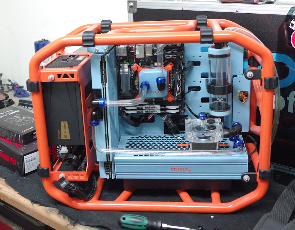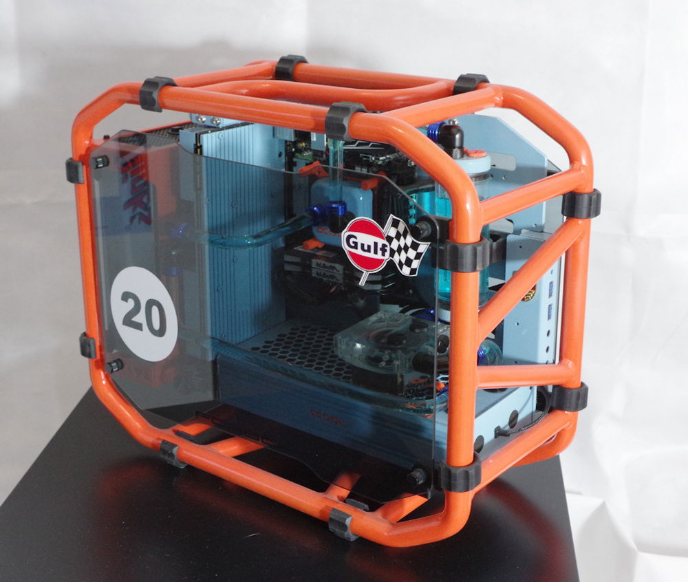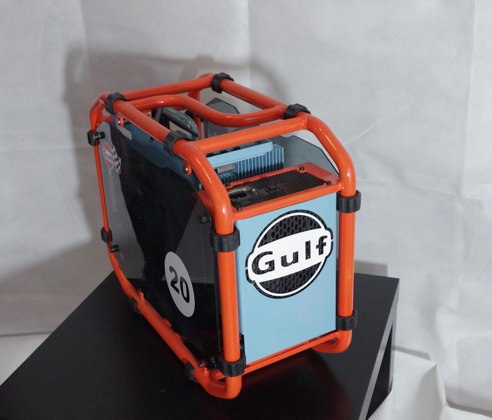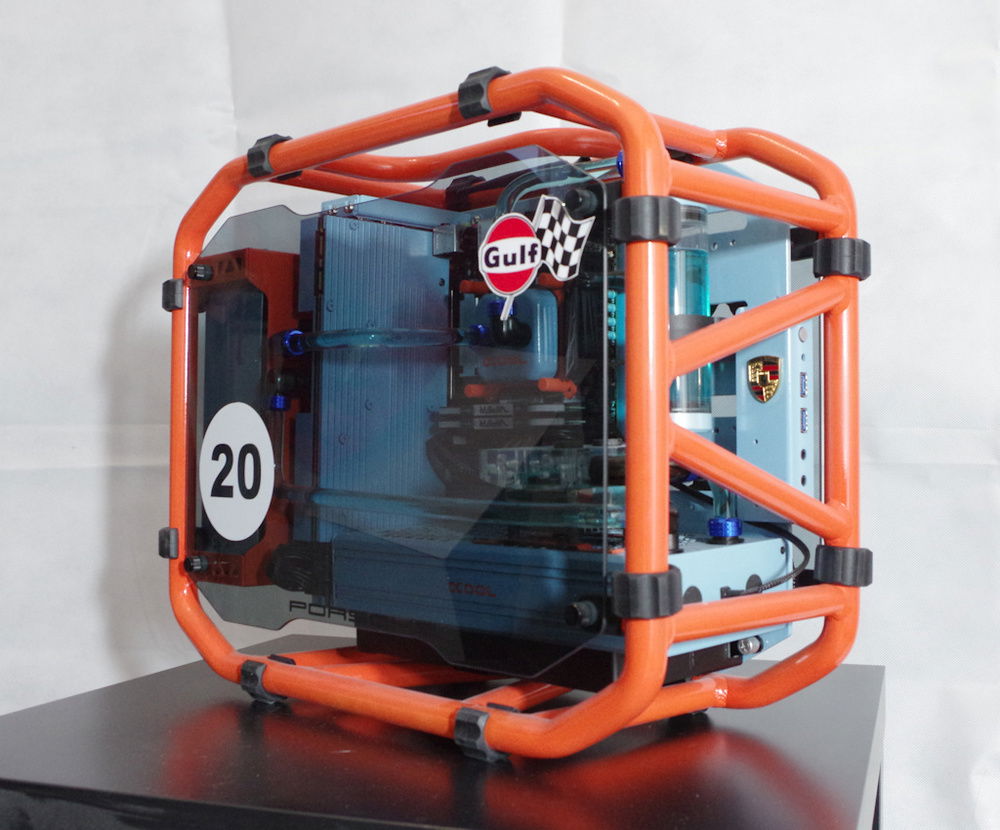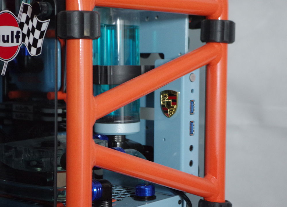 This Project was build as a small Dedication to the legendary Gulf Racing Team. The whole Case and nearly all components were repainted in the Original Gulf Racing Color Scheme and we even added a small Porsche Badge on the Inside. The cables were also custom Sleeved in the original Color scheme. It was originally build in 2018 as a small Showcase which we could use to show a custom Watercooling loop, while we were giving some Workshops on the Gamescom here in Germany.