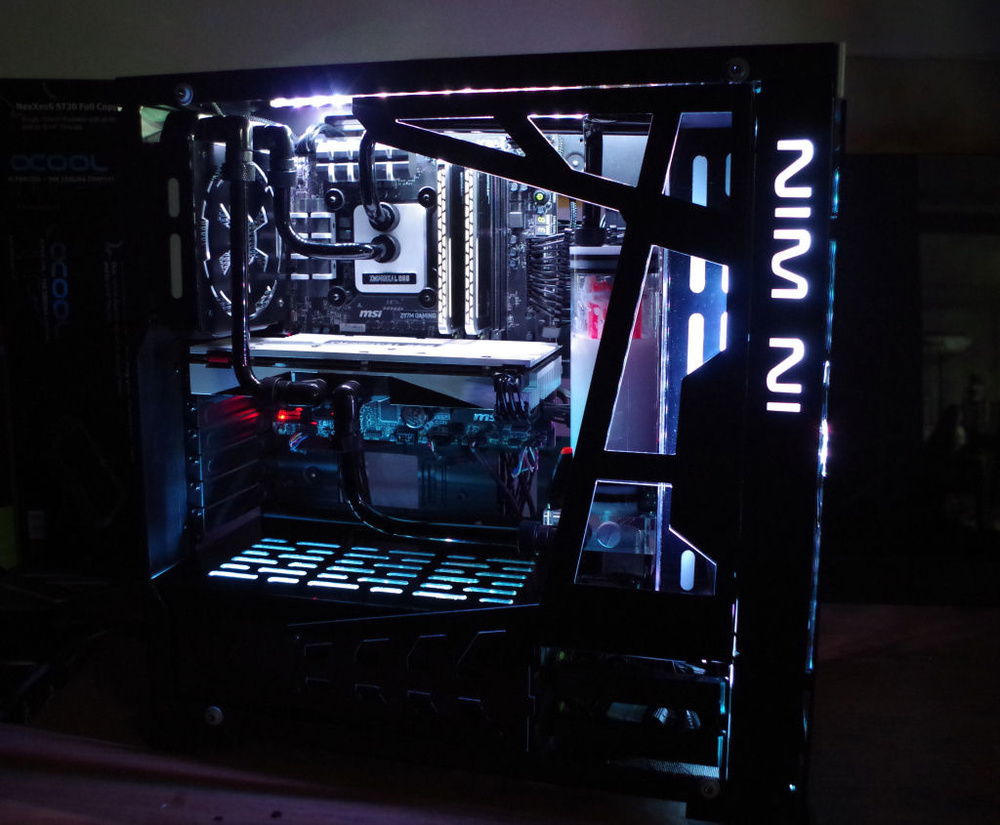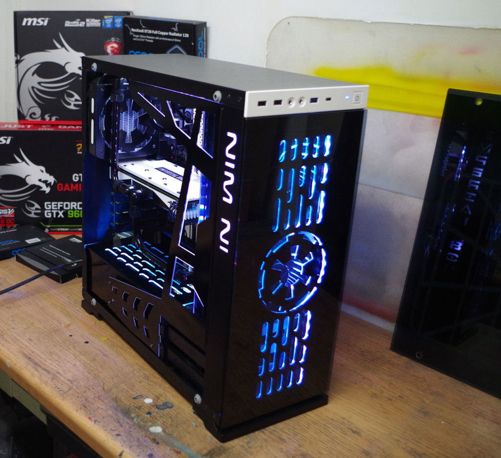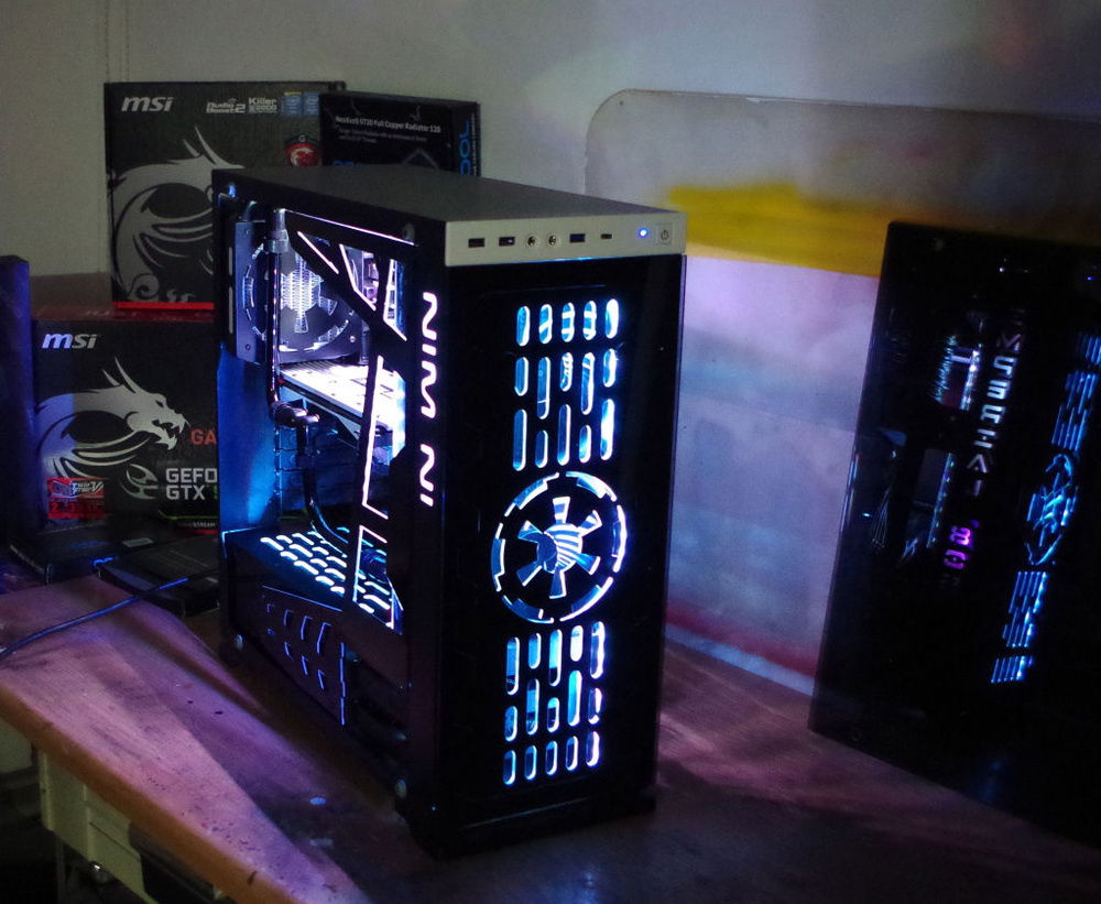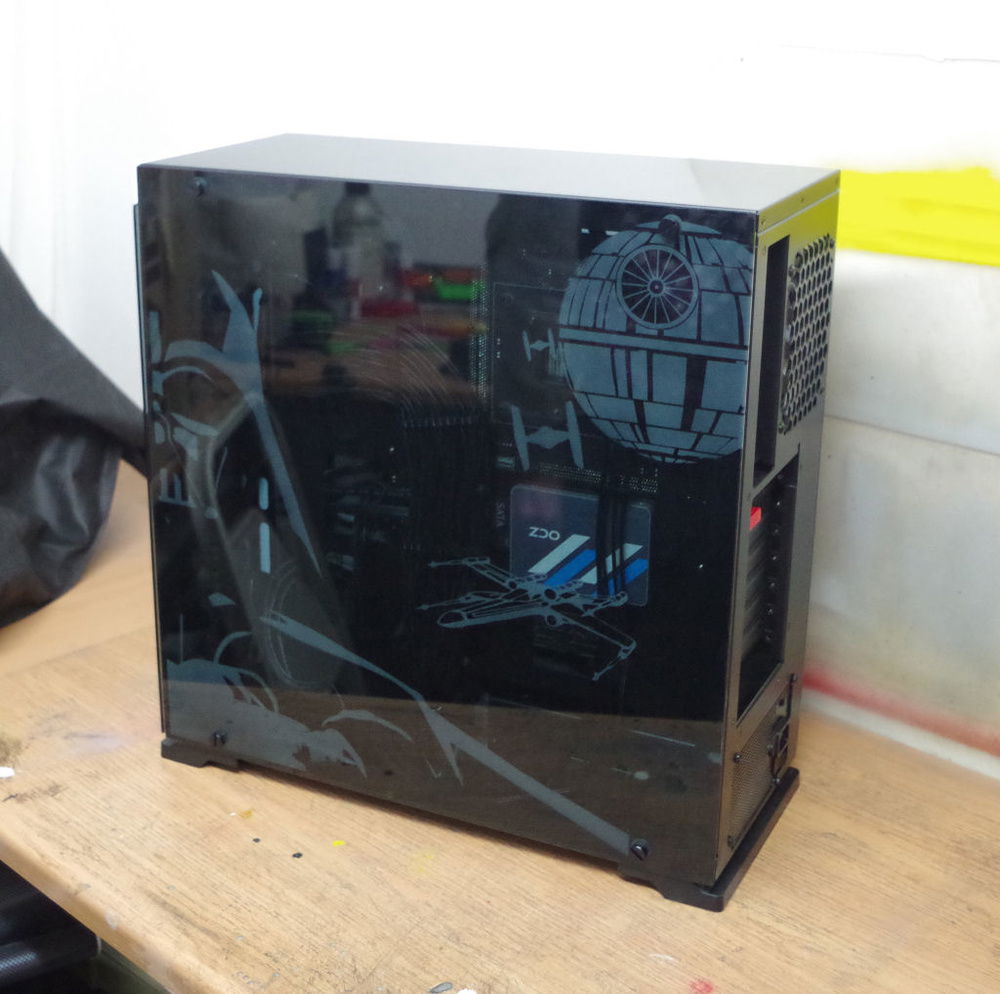 Because we´re big Star Wars Fans, we built this Mod with the inspiration of the Empire. So we added a lot details to the Case and even made a custom Engraving on the Glass Sidepanels.