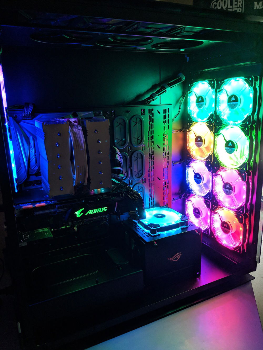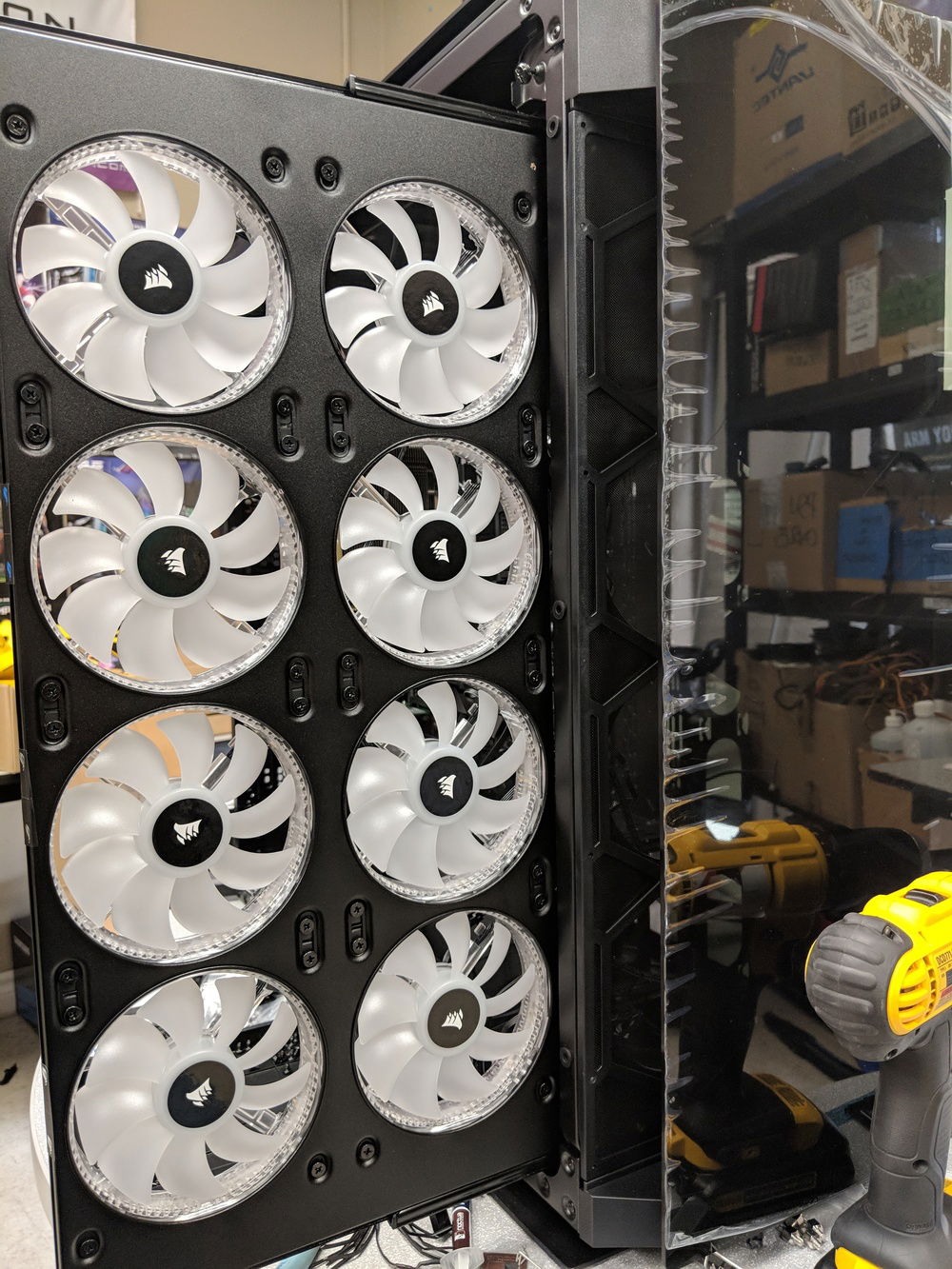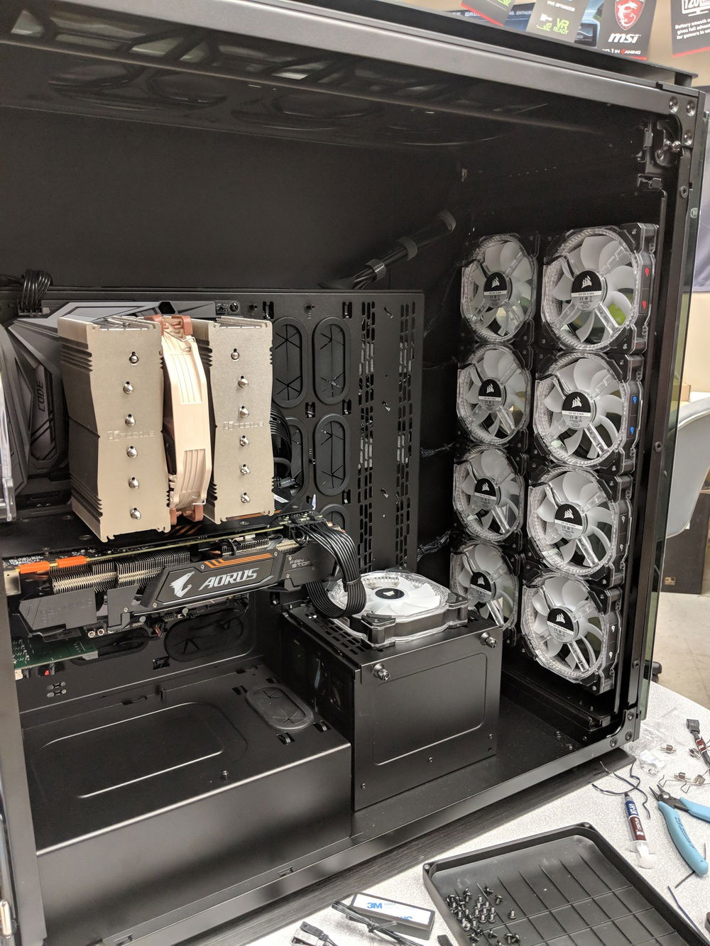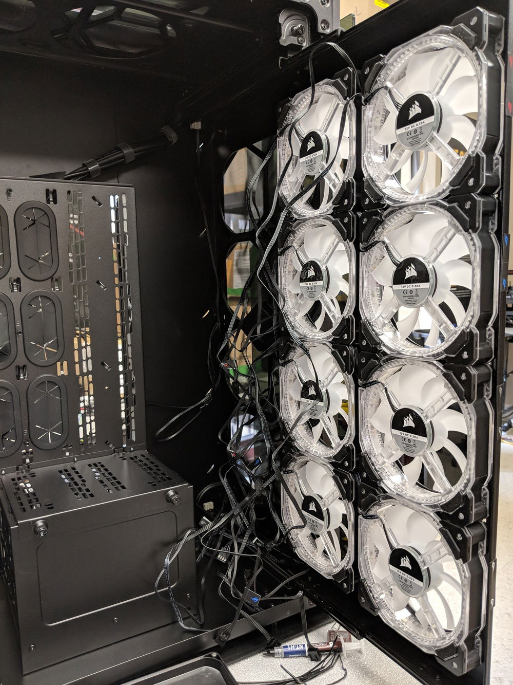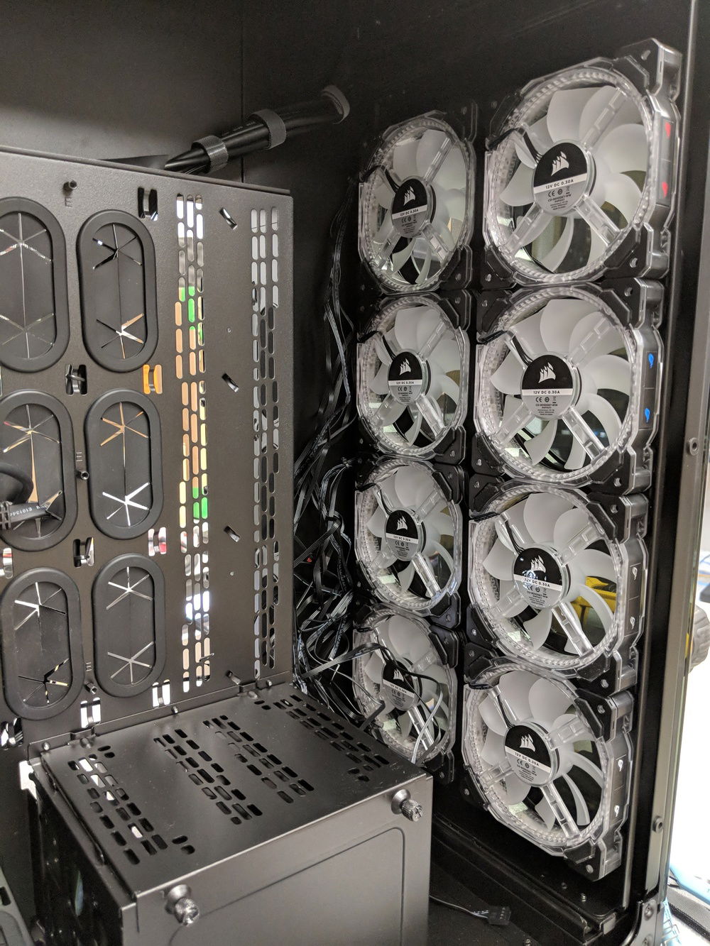The customer had insisted on these components. Normally I make suggestions on changes to better suit the customer's needs, but he was just in love with this case! I had to add in a second Commander PRO (in addition to the one that comes with the case), to properly setup all these fans with RGB. This system is a flight simulator for Prepar3d, and XPLANE. Notice the ROG stickers on the side of the fans at the front, this helped me route them in the back of the case so they do the lighting effect in order. Stupid clean as usual... As my boss says, ROBOTIC!