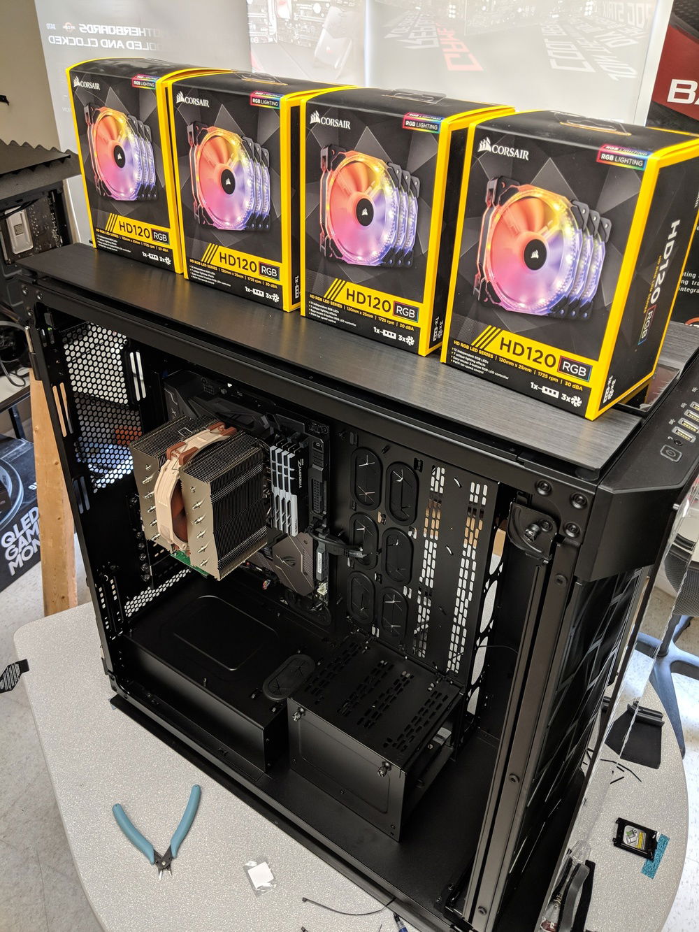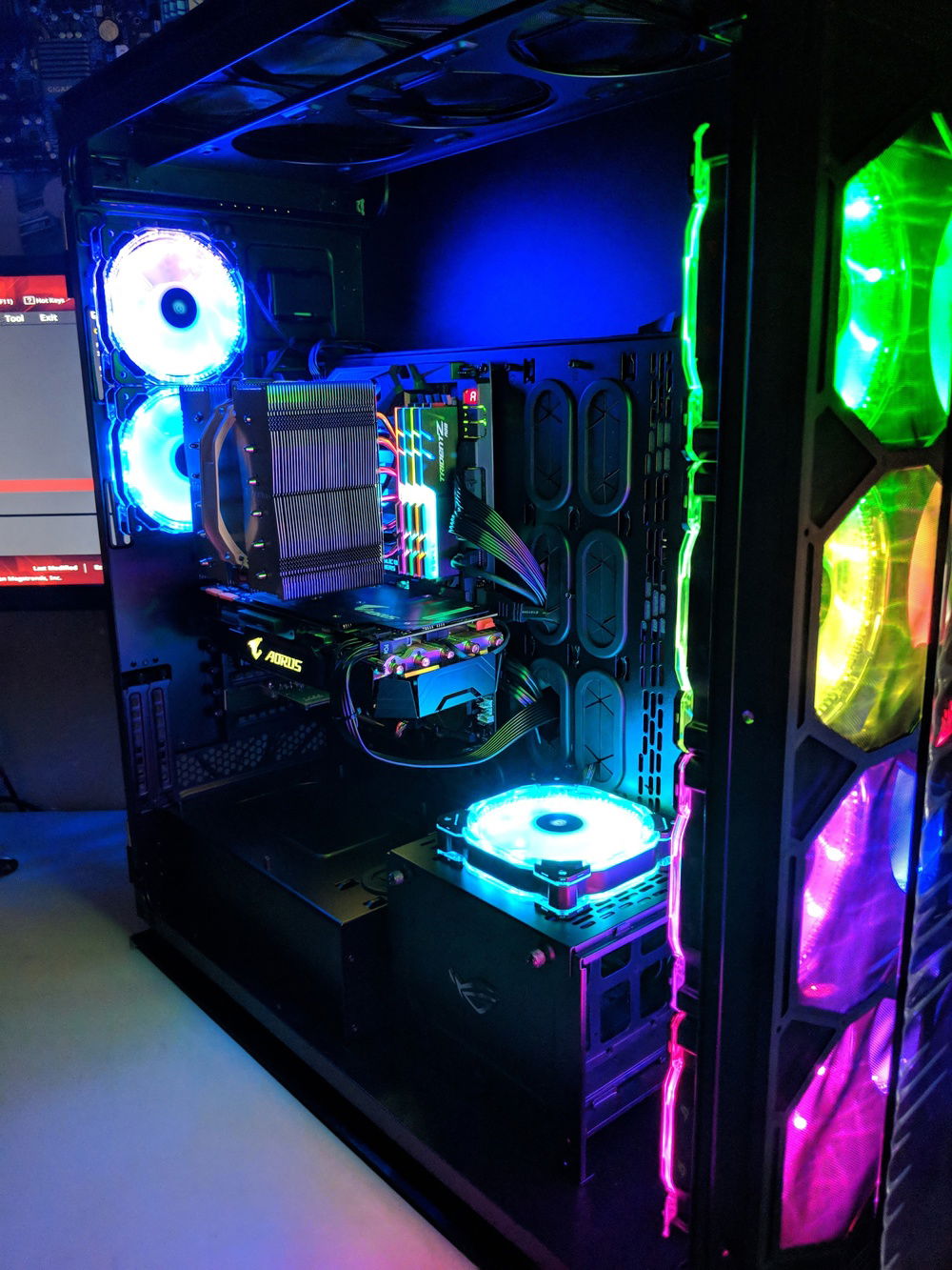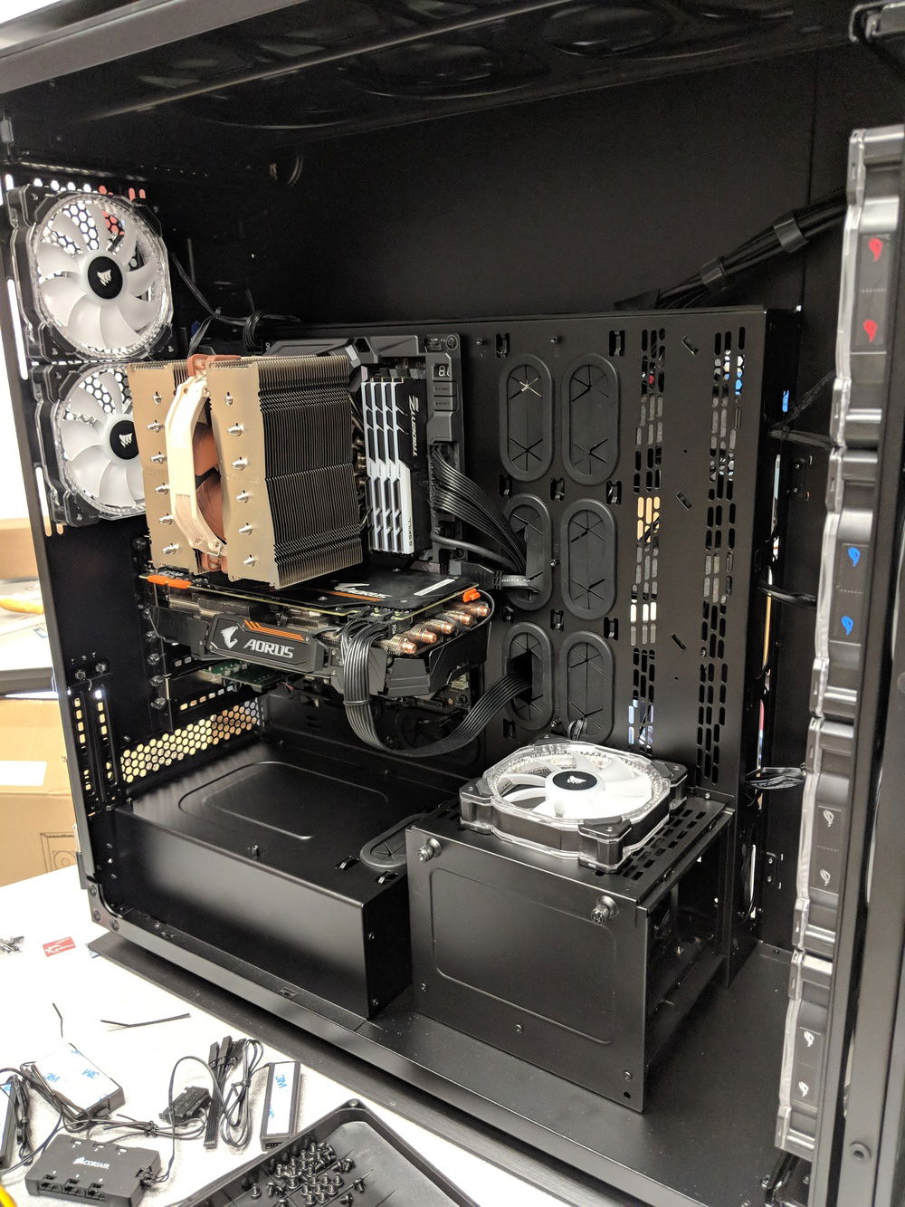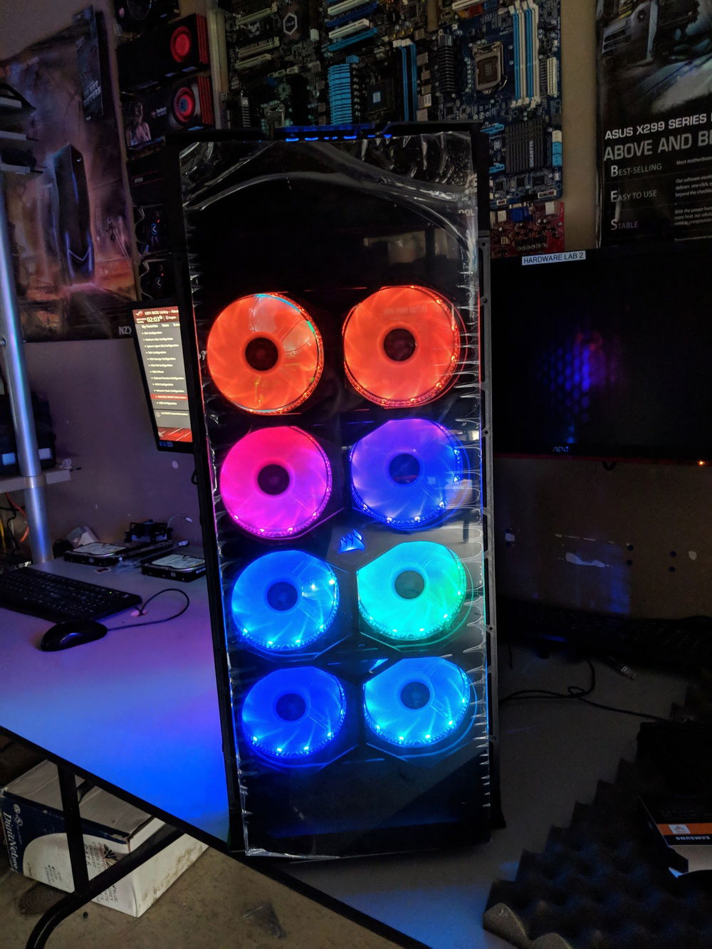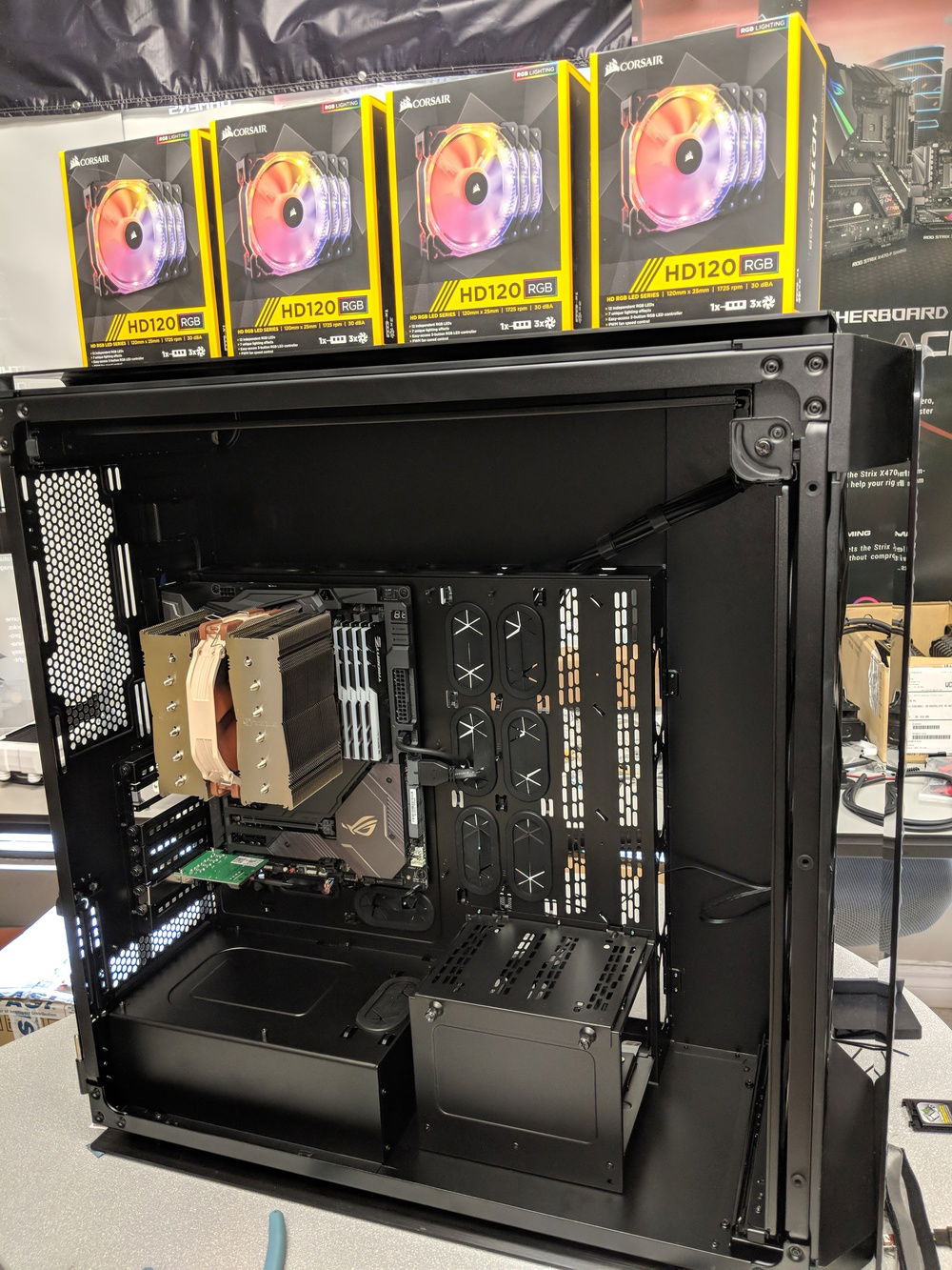 The customer had insisted on these components. Normally I make suggestions on changes to better suit the customer's needs, but he was just in love with this case! I had to add in a second Commander PRO (in addition to the one that comes with the case), to properly setup all these fans with RGB. This system is a flight simulator for Prepar3d, and XPLANE. Notice the ROG stickers on the side of the fans at the front, this helped me route them in the back of the case so they do the lighting effect in order. Stupid clean as usual... As my boss says, ROBOTIC!