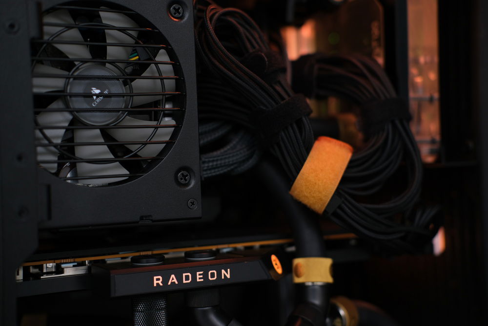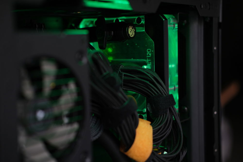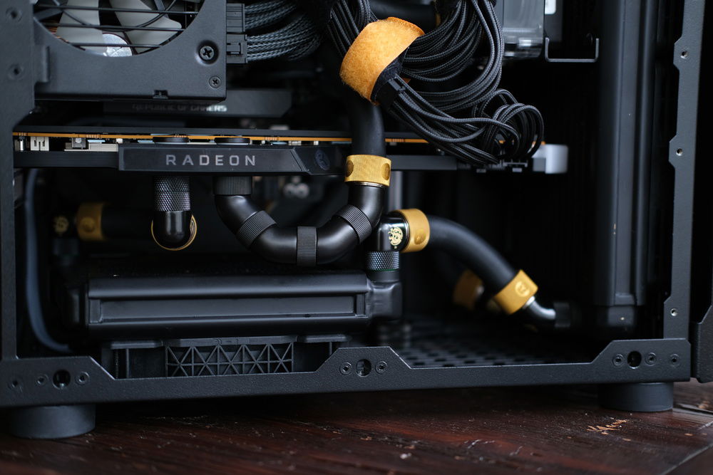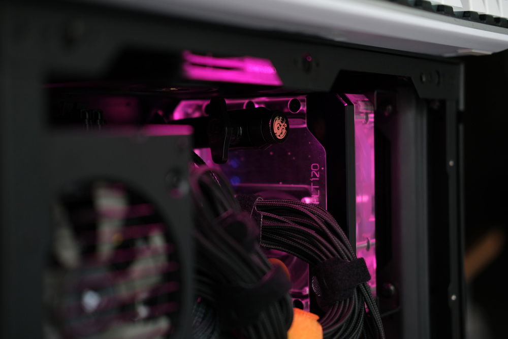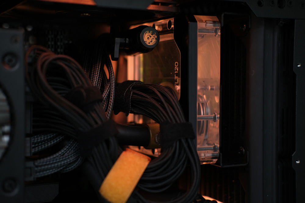 The custom watercooling in this sytem incorporates acetyl water blocks from EK for both the CPU and GPU, two HWlabs GTS radiators in 120mm and 240mm at 30mm thick, and a PWM DDC pump mounted to an EK flat reservoir. Fittings are a combination of Bitspower and EK.