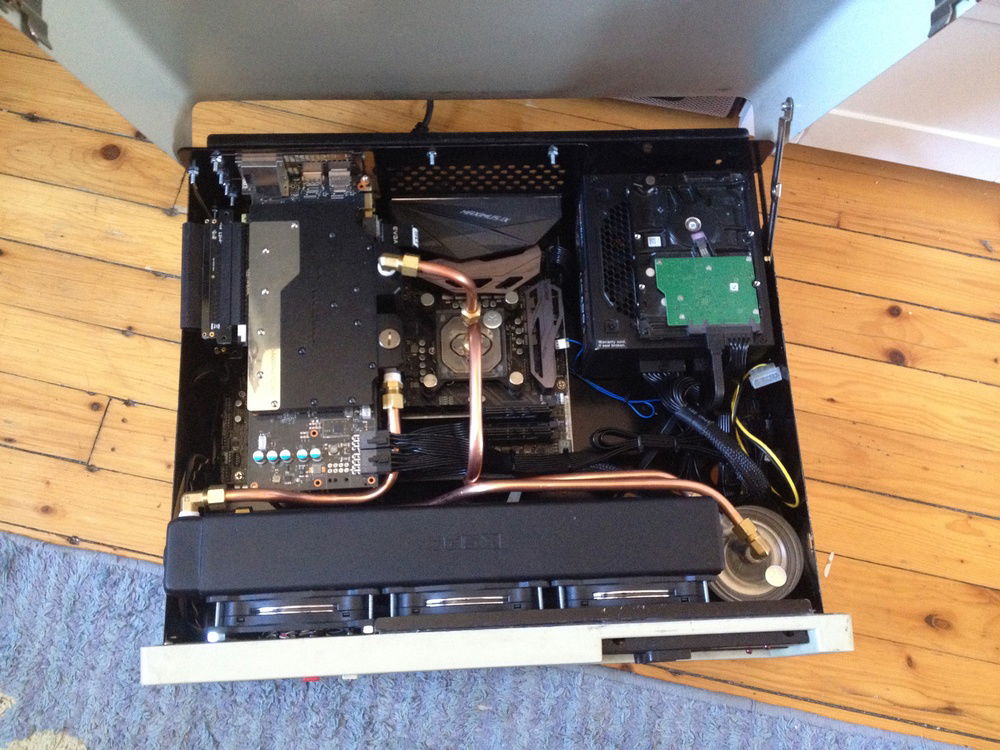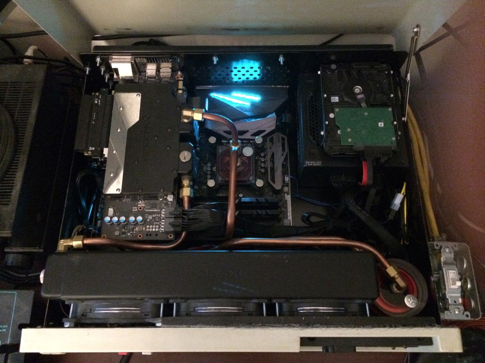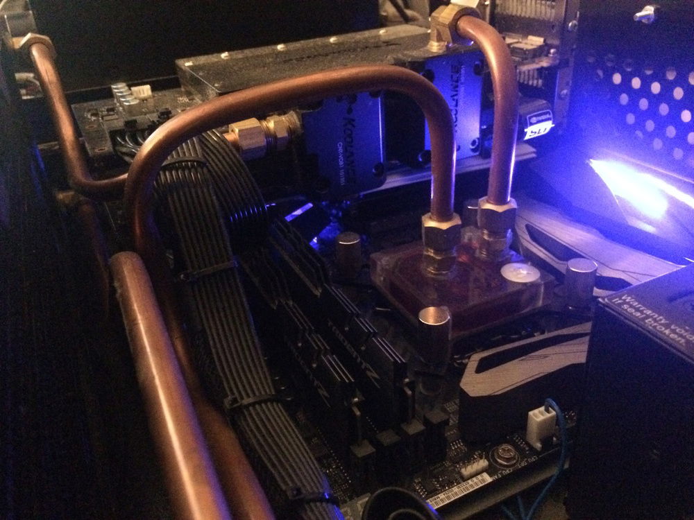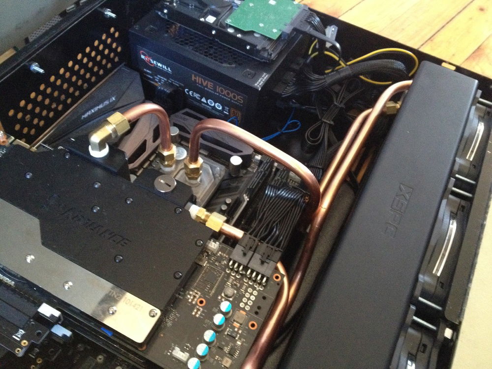Parts: Intel Core i7 7700k Delided Processor Asus Maximus Hero IX Motherboard 16GB G.Skill Trident Z (8GB x 2) DDR 4 3200Mhz Memory 1TB Samsung 860 EVO sata SSD 1TB Seagate SSHD Hybride Drive Founders Edition Geforce GTX Titan 6GB GDDR5 Graphics GPU1 Founders Edition Geforce GTX Titan 6GB GDDR5 Graphics GPU2 Rosewill 1000W Bronze Power Supply 3x Thermaltake Riing 12 120mm Fans Custom Copper Hardline Cooling on CPU and GPUs 360mm Ultrathick XSPC Radiator EKWB on CPU and Fullcover Coolance Blocks on GPUs