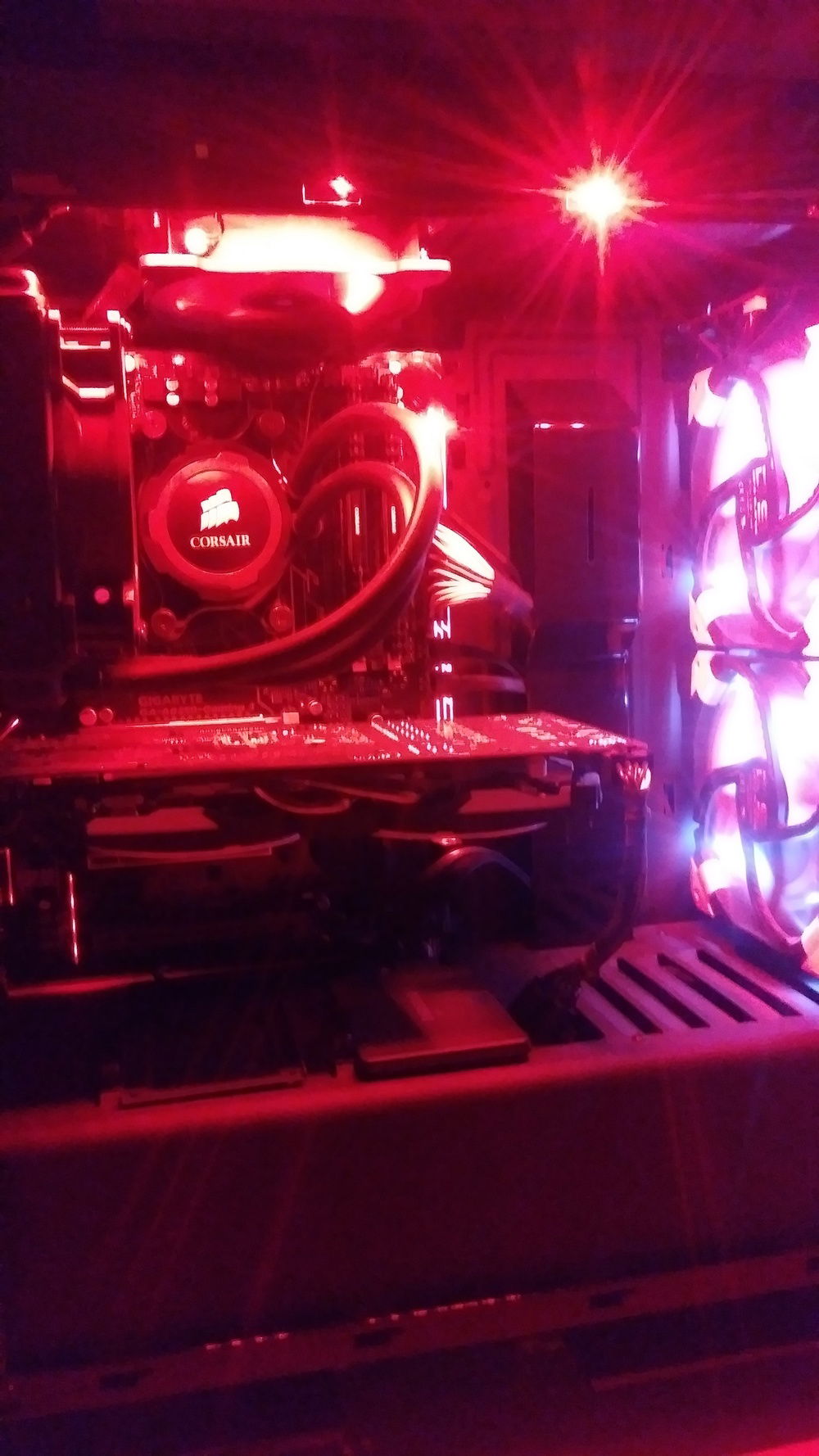 My lovely wife surprised me with parts to build my first rig but I needed to fit my pc in our new place but didn't have a good spot. Chose a nook between the fireplace and the couch. I built a custom desk to fit my needs and was surprised by my wife with a mini fridge to put next to my set up. I don't have many pictures of my pc build but i will upload some of the desk build. The desk has built in cable management solutions so I don't have a mess of wires behind the set up. At some point I want to do a custom water loop. Maybe when I upgrade to new Ryzen 3xxx parts.