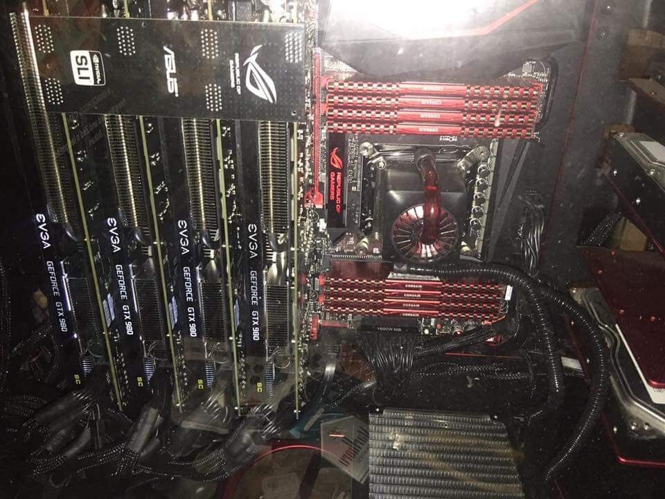 This is a build I did back in 2015, i changed it at one point to have a different motherboard and gpu’s. The first iteration was a gigabyte x99 gaming g1 WiFi, with an intel i9 5960x, 64gb of Corsair vengeance in quad channel, with a raijintek aio, and two r9 295x2’s in crossfire, with a evga 1600p2 psu all within an inwin s-frame chassis and two 1tb hdds. The second iteration everything was the same except I changed to an asus rampage v extreme mobo, and switched to four gtx 980 ti’s in quad sli, and changed the aio to a deepcool capitan 140.