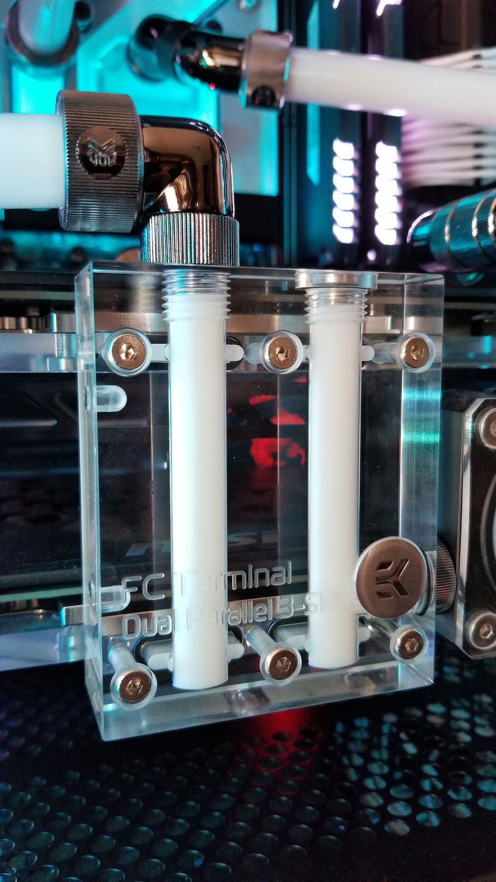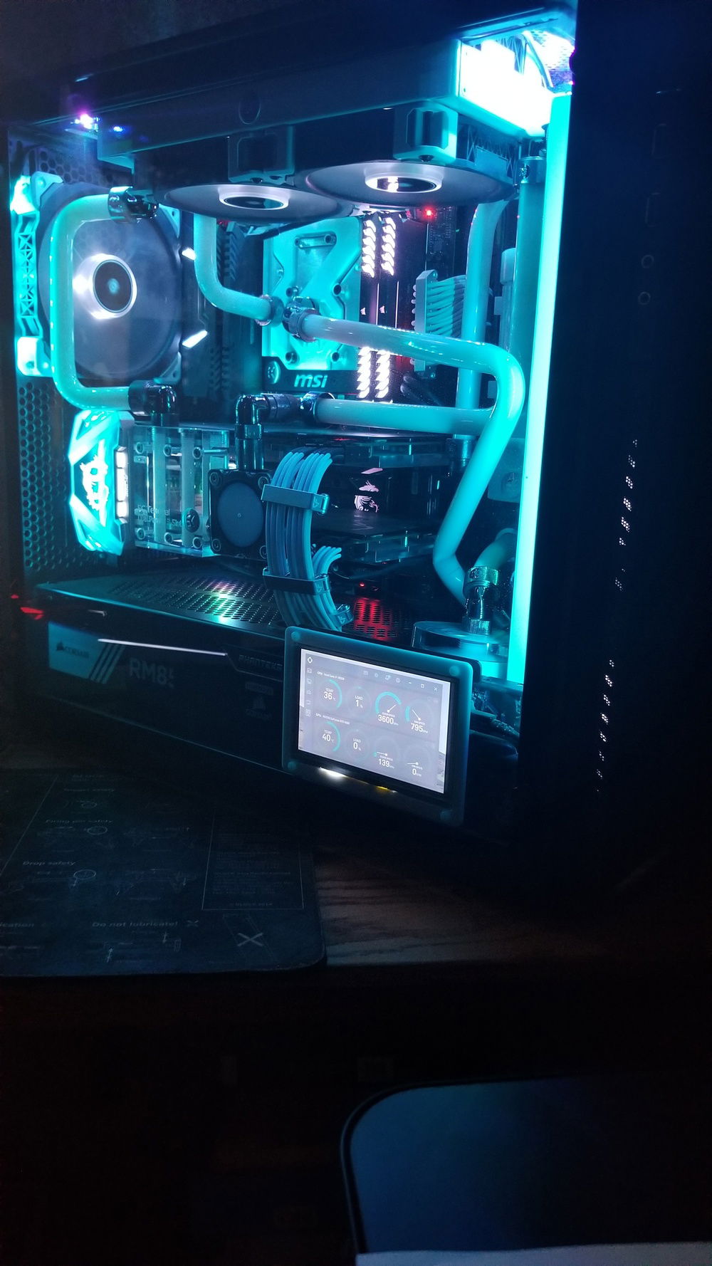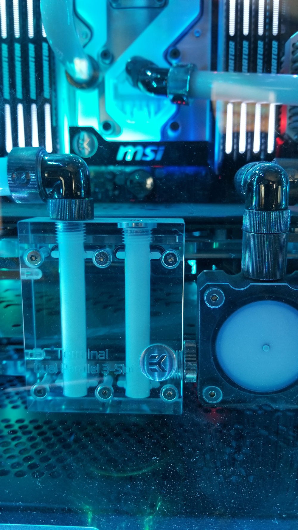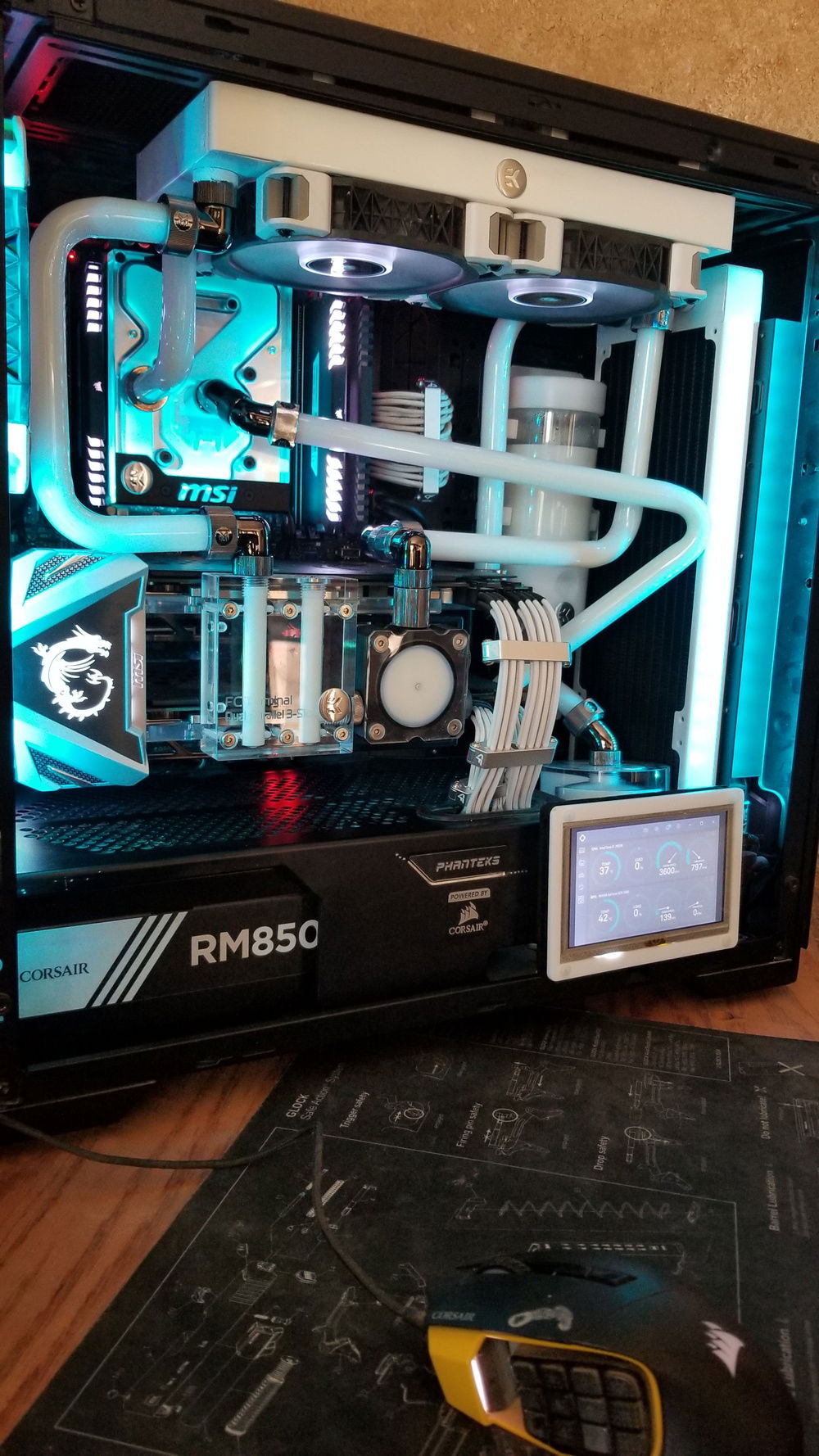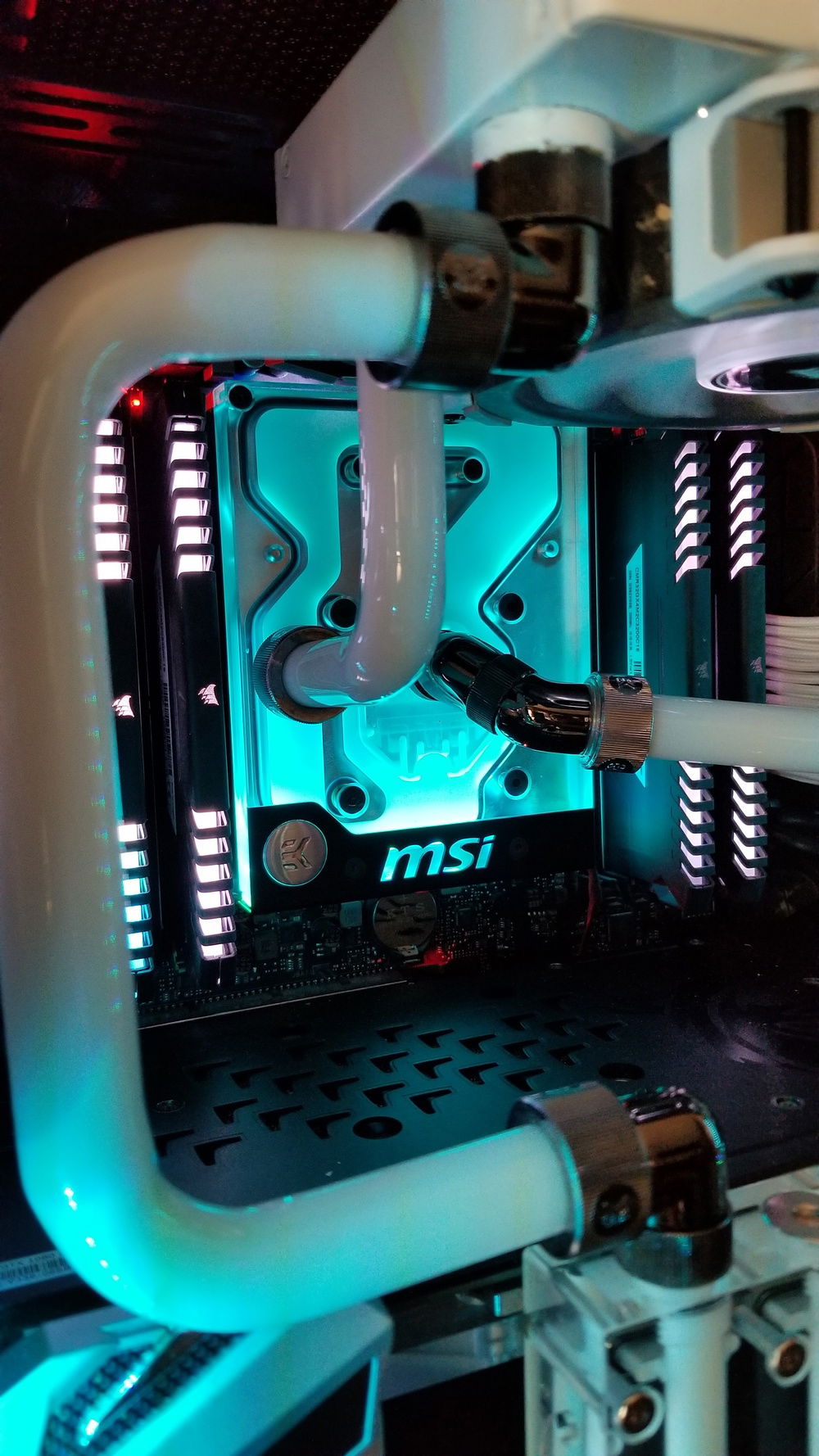i7-7820x, delid with copper IHS, (3.6GHz base clock w/ 4.3GHz turbo) MSI M7 ACK X299 Mother Board 64 GB Corsair Vengence (16x2) Samsung 960 Pro 512 GB M.2 (2) MSI 1080 SeaHawks in SLI Corsair RM850i PSU Corsair Cables New 8 Corsair ML series fans in white EKWB MSI X299 Monoblock EKWB 360 SE radiator EKWB 240 SE radiator EKWB 140 SE radiator EKWB 150 glass reservoir in white EKWB D5 vario pump EKWB G1/4 fittings, tube, etc.… Bitspower D5 pump top (silver) Phantek Ethoo Pro M case with tempered glass Cablemod UV RGB strip