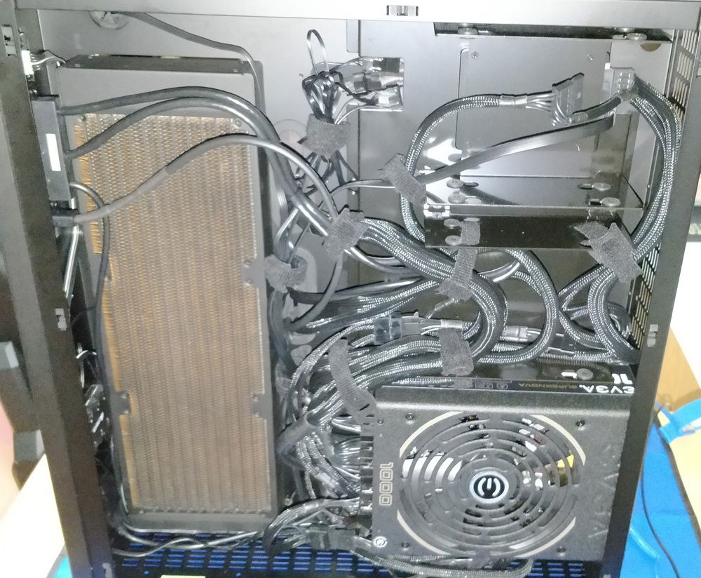 Cable management around the back. I refuse to pay as much for custom-length cables as the PSU+cables cost in the first place. Unused HDD bay makes a good place to tie down extra length.