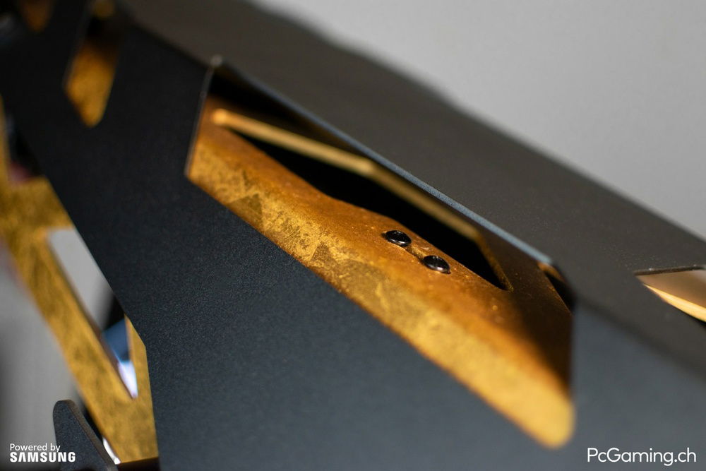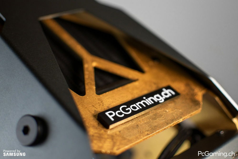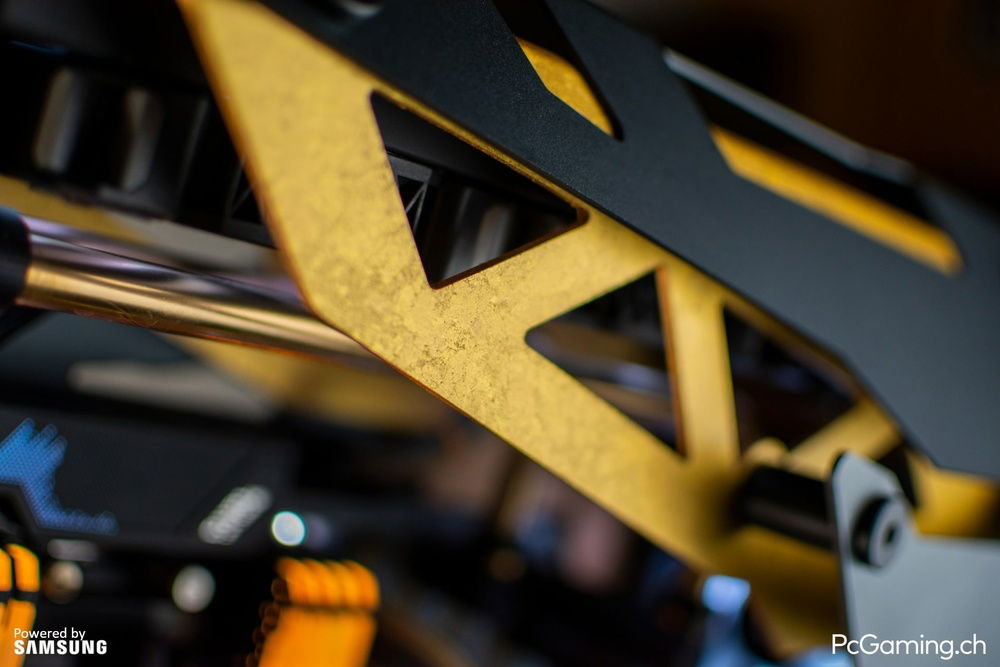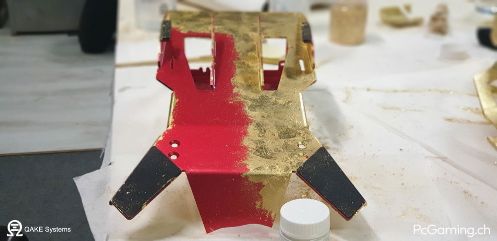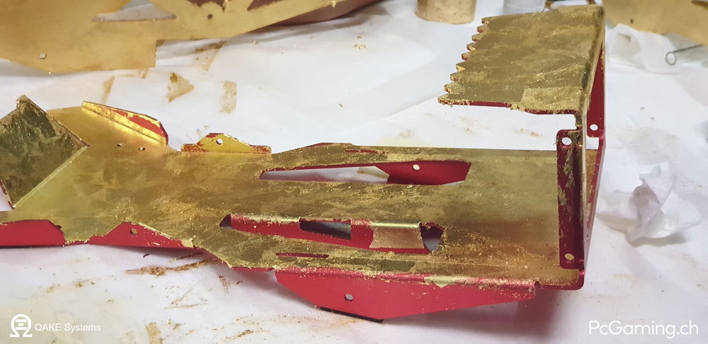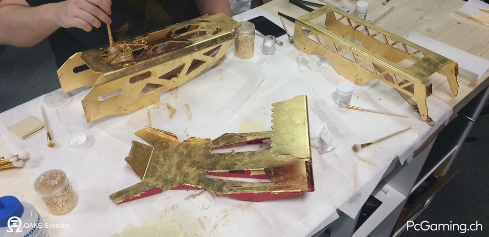 As you can see, the case is an Antec Torque, which we have plated with 24 carat gold. To do so, the case was completely cleaned with isopropanol, coated with special glue and then we applied the gold leaves on the parts to be covered. The process was repeated 3 times to cover properly and obtain the desired effect. (pictures of the plating process are available at the end of the slideshow.)