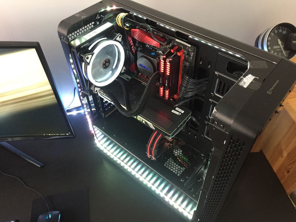 Rev.1 - * First PC build * September 2017 Rev.1.5 - * Upgraded from 1050TI to 980 * January 2018 Rev.2 - * Upgraded from Gigabyte H110M to Asrock B250 K4 * Upgraded from Cooler Master 500W to Thermaltake 750W * Began adding LED Strips * Febuary 2018 Rev.2.5 - * Changed from Cooler Master Masterbox 5 MSI to Thermaltake V27 * Added more LED Strips * April 2018 Rev.3 - * Upgraded from CM H212 to Antec Kühler H600 * Upgraded from many Sickleflow fans to many nice looking cheaper fans. * Liquid Metal'd my GPU (G'day Aaron) * May 2018 Rev.3.5 - * Upgraded from my old TV to a 21:9 75Hz Monitor and a smaller secondary one I found in the attic * Liquid Metal'd my CPU * June 2018 I live in Perth, so if pricing shocks you, thats because it's in the most isolated city on the planet The PC: It rocks. I decided to make the switch from Xbox to PC for two main reasons; LSPDFR, and the death of Xbox exclusives such as Forza. If Forza were still only for Xbox I would probably still own mine. I purchased the parts for it around August 2017 from Austin Computers in Osbourne Park and Amazon in the USA The Parts I got an amazing deal on some of the stuff. The RAM cost me around $90 USD after Amazon's VISA Credit thingo. The CPU was a bit much but the 212 came for free. The Devastator 2 was $75 but came with a hat, and the 1050TI was $270. I thought I was getting ripped of back then, but when I sold it they went for around $310. It was bought by a guy in Victoria IIRC who needed the LP one for his HTPC. I've been good recently. I've abstained from making any upgrades to the PC for a while, and plan on holding on to it for a while. If I do upgrade it, it will be with a second hand GTX 1270 or 1080TI and 8400 or 1600, when they can be bought for $700 together, but I'm already planning an iTX build with similar parts. I own the last Antec Kühler in Australia. If you look at the price breakdown, you can see that it vanishes the day I purchase it. PCCG was the only store that had them in stock, and after I bought it they told me that they were out of production and that I got the last one. If it breaks, I'll see what happens warranty wise. I have the receipt, but I'm not sure whether I'll get my money back, a new cooler, or if they will fix it. Performance Performance is quite good. It beats most of my friend's PCs (G'day Cameron), and runs GTAV on max settings at a solid 60 fps. I could probably get more, but I have no idea how to limit the fps of games without V-Sync. I've had an amazing experience with software. Geforce Experience is great, CAM is splendid (G'day Aaron), and the BIOs are really nice, except a recent update has limited my RAM to 2333. The liquid metal keeps everything running at ambient, which is nice. Putting it on was good fun too. I did it with a mate who was doing his R9 290 (G'day Aaron) and it was fun to compare his 4 screw 'Gaming' card to my 34 screw, all metal shroud blower card. I was apprehensive about the reference when I bought it, but now I think I'll go out of my way to find a founders for my next upgrade.