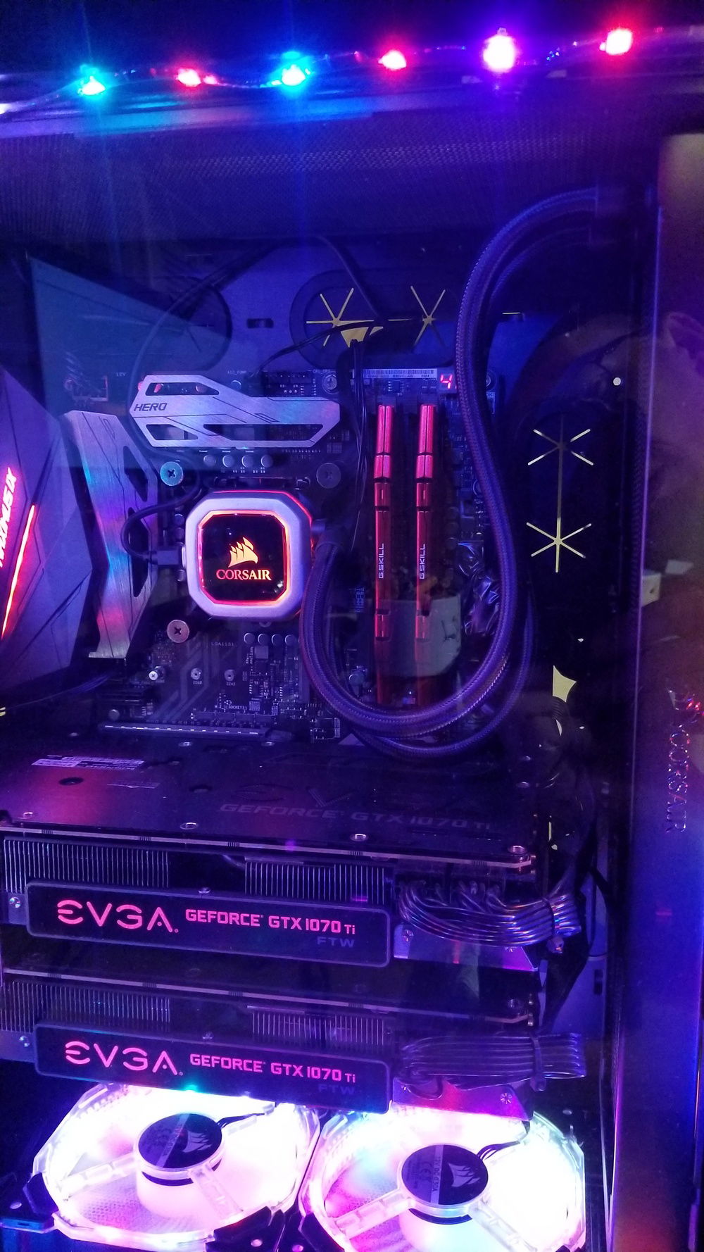 CPU - Intel 7700K overclocked to 5GHz CPU cooler - Corsair 150i 360 Mainboard - Asus ROG Maximus IX Ram - 16GBs GSkill DDR 4 2666MHz overclocked to 3GHz SSD - Samsung M.2 MVME 960 EVO 250GBs HHD - Seagate Baracuda 3TBs and WD Black 1TB GPU - EVGA GTX 1070Ti ultra silent FTW x 2 in SLI Case - Corsair Crystal Series 680X Black and is not listed as a choice for corsair PSU - Rosewill Capstone G Series 850W Modular Gaming Power Supply, 80 PLUS Gold Certified