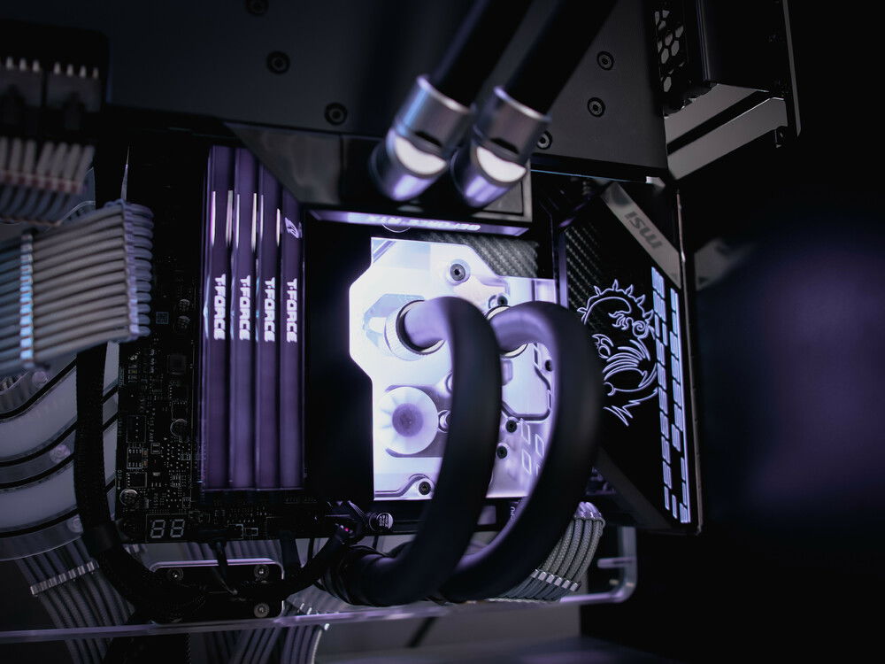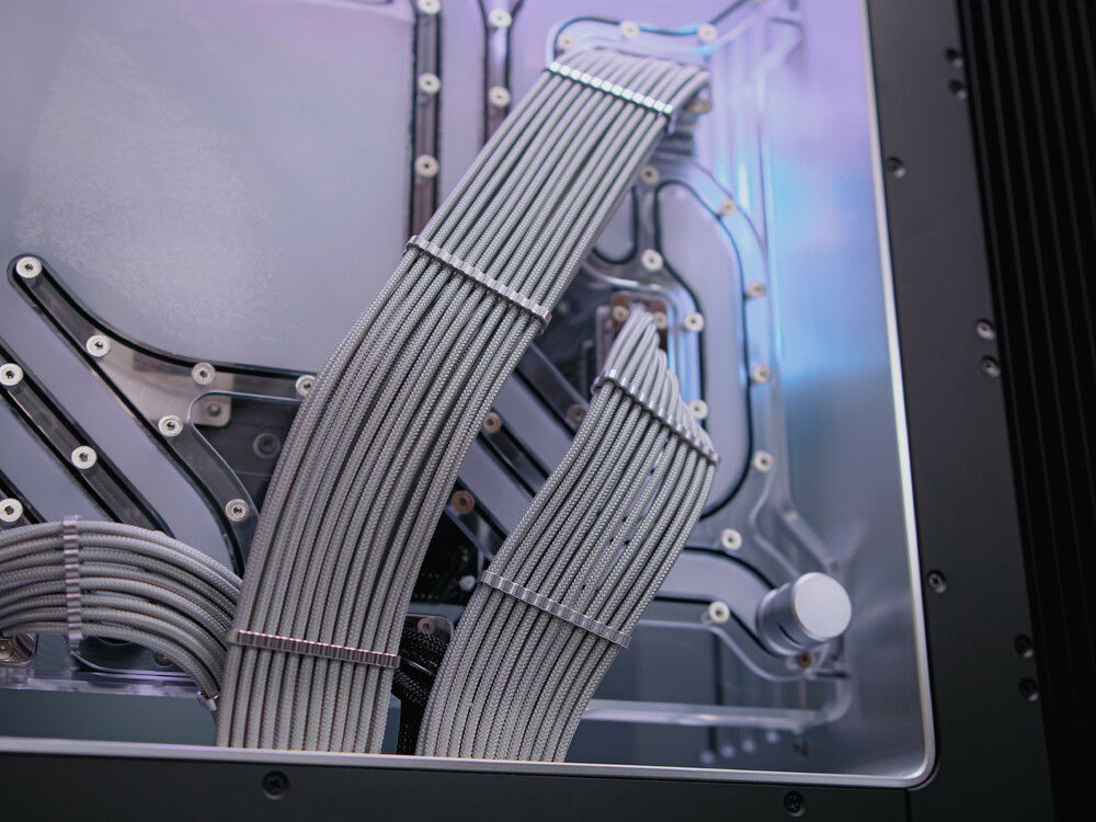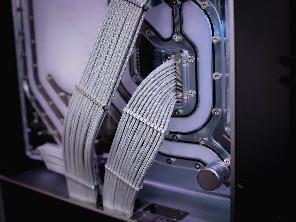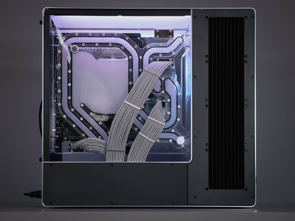 The 909EK supports 2x 480mm radiators, housing for 2 D5 pumps, a distribution panel which also is the motherboard panels, an inverted ATX layout, unique and customizable PSU cable routing options, a complete open-air design, and an amazing RGB ceiling that lights up all components inside.