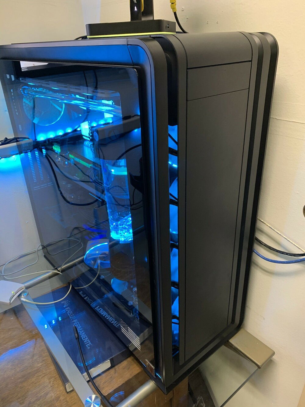 I used a lot of parts from my wall mounted build to build a dual water cooled gpu set up. I wasn’t going with sli I wanted to donate some cpu and gpu time to folding at home. There is a mix of two builds but the same water cooling parts I started with the i9 9900k but wanted to play with threadripper 3960x. Both are beasts intel is better for gaming by far but threadripper was just ok but spanked intel in encoding and work station tasks like folding at home. Both systems really pushed my 1000w Corsair power supply to the limit and eventually killed it. Running at peak output for long periods of time can do that to a psu but fortunately all my hardware was spared and I could carry on building other systems with those parts