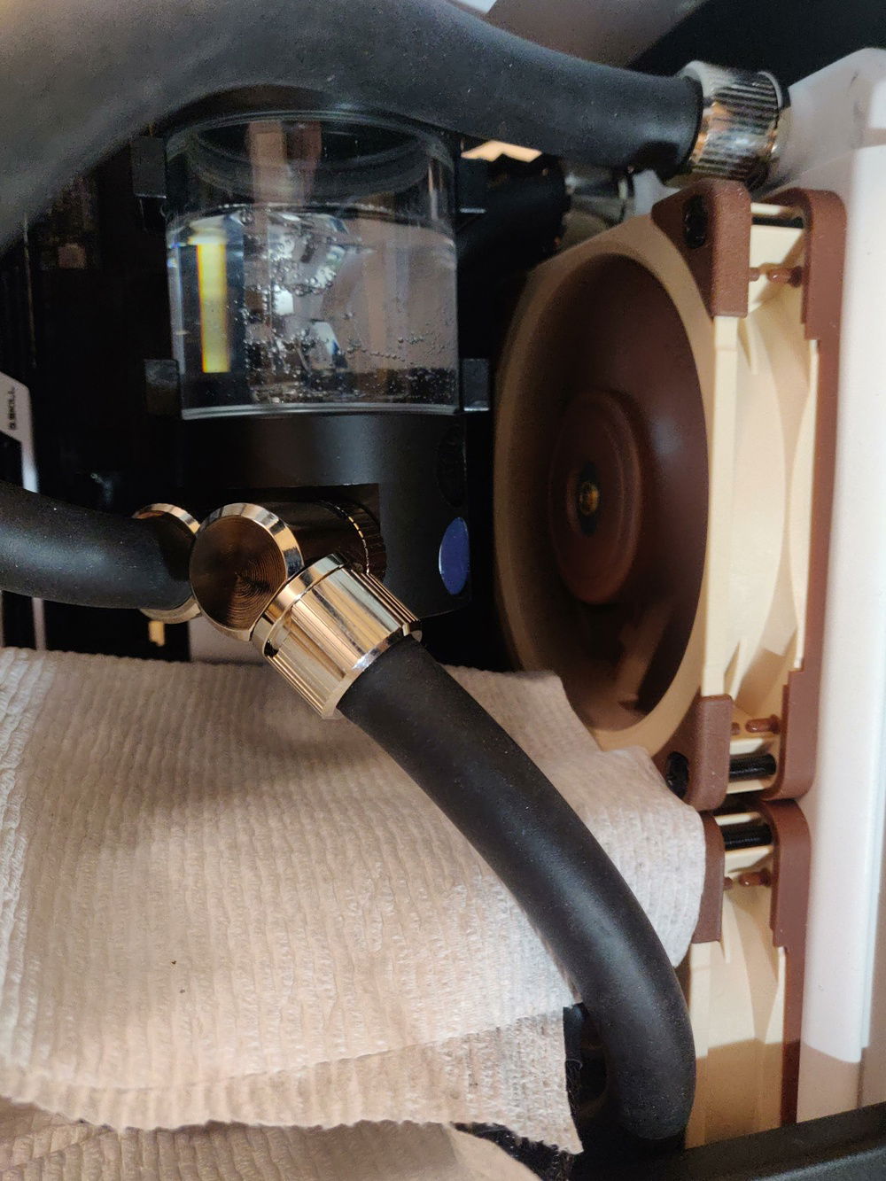 The bottom GPU port is a swiveling fitting so that the tubing can have leeway when I pull the reservoir out to fill.