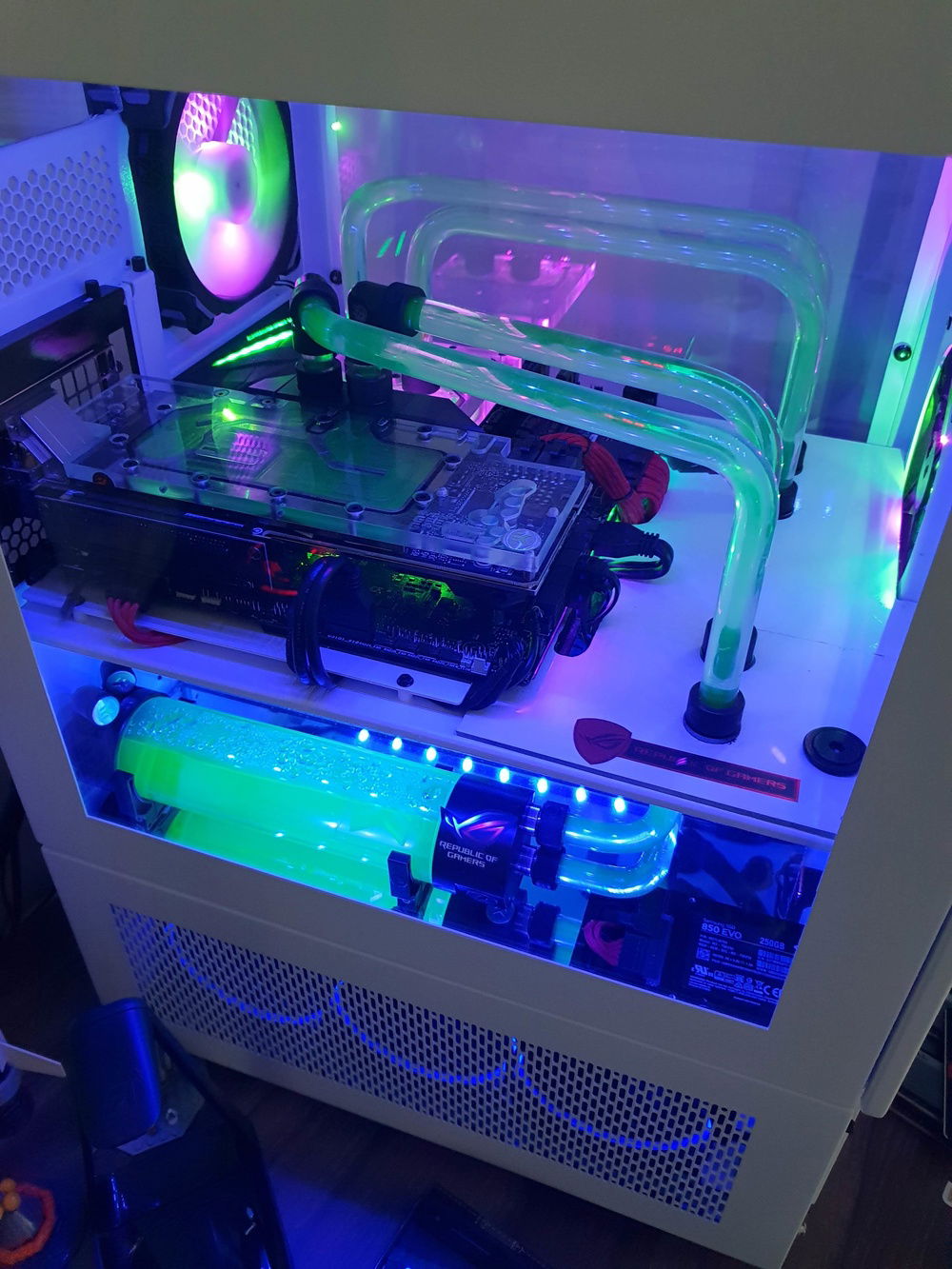 Hi Everyone!. So i was going all out on this one to see what i could come up with and to test my abilities, and it come out super nice, I def improved on the design over time and added in a few drops of EK Green coolant aswell after about 6 months. I definitely learned a hell of alot from this build which will make my next one even better. It took me about a full week of working on it nightly to get it done as it had some mods done to it including cutting mirrored acrylic pieces, and painted acrylic, drilling etc.