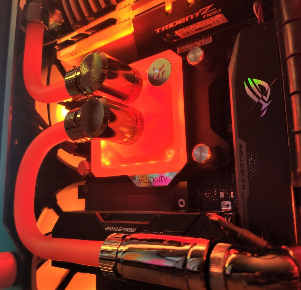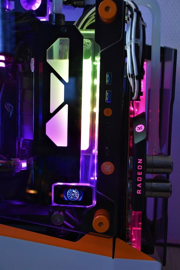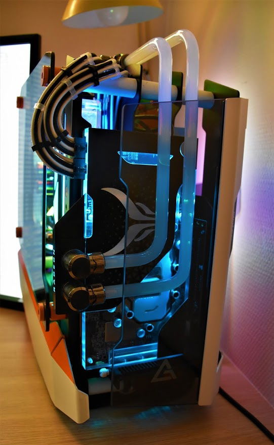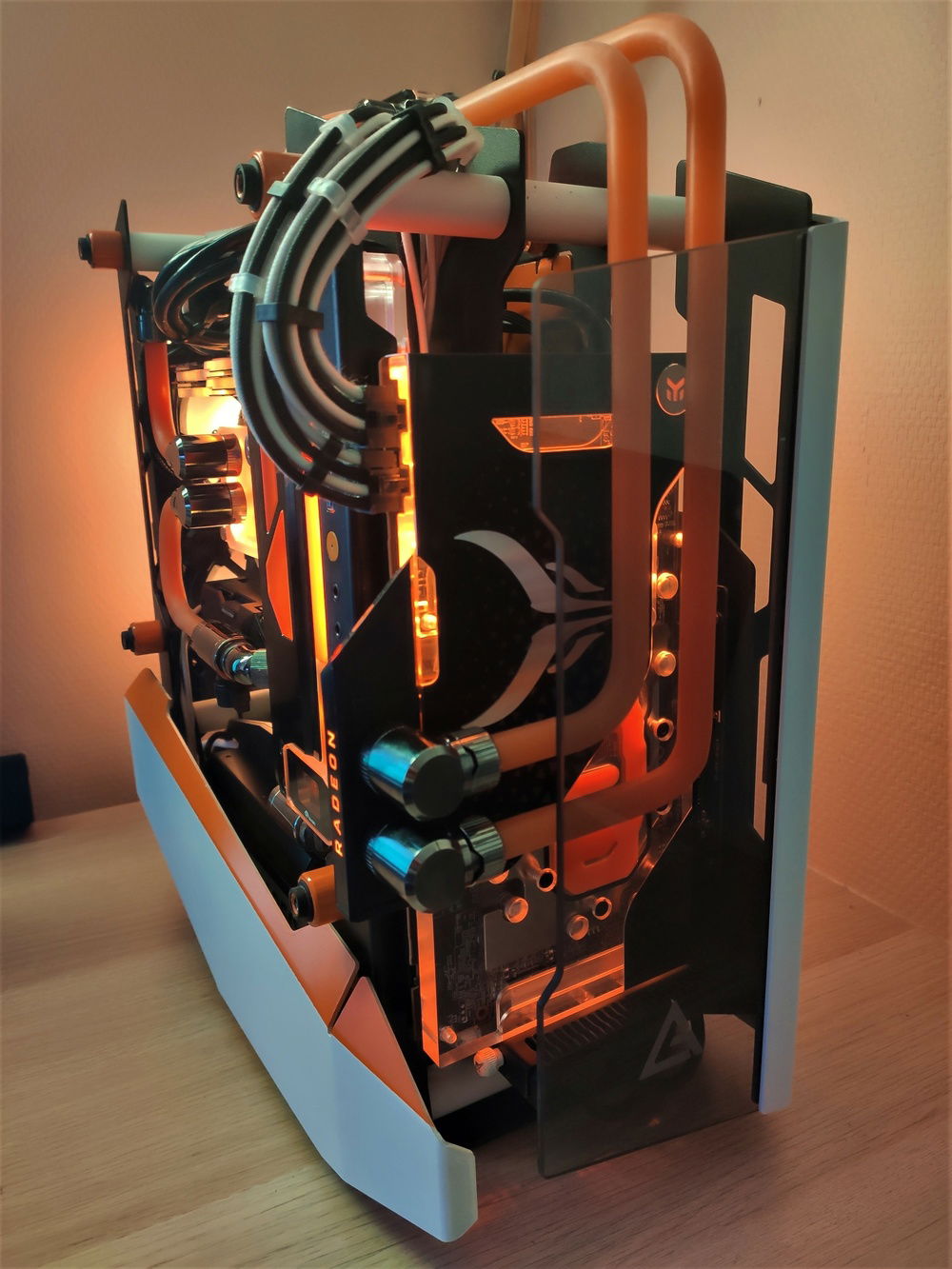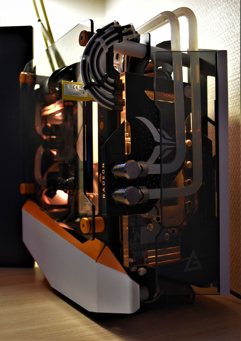 The RX 5700 XT liquid devil used in this build is my favorite card of all time. she's fast, looks ******* good and under water she compete really well in most games at 2k ultra. I wasn't lucky enough to get a 6800 xt but planning to change the RX 5700 XT for a 6xxx xt as soon as possible and using the RX 5700 xt as a collector piece.