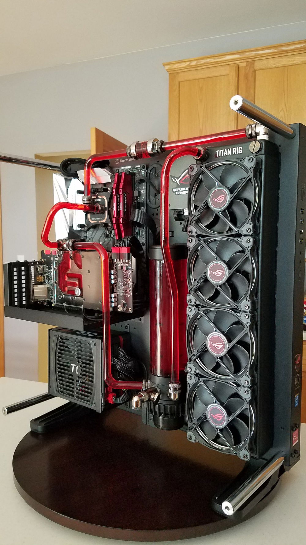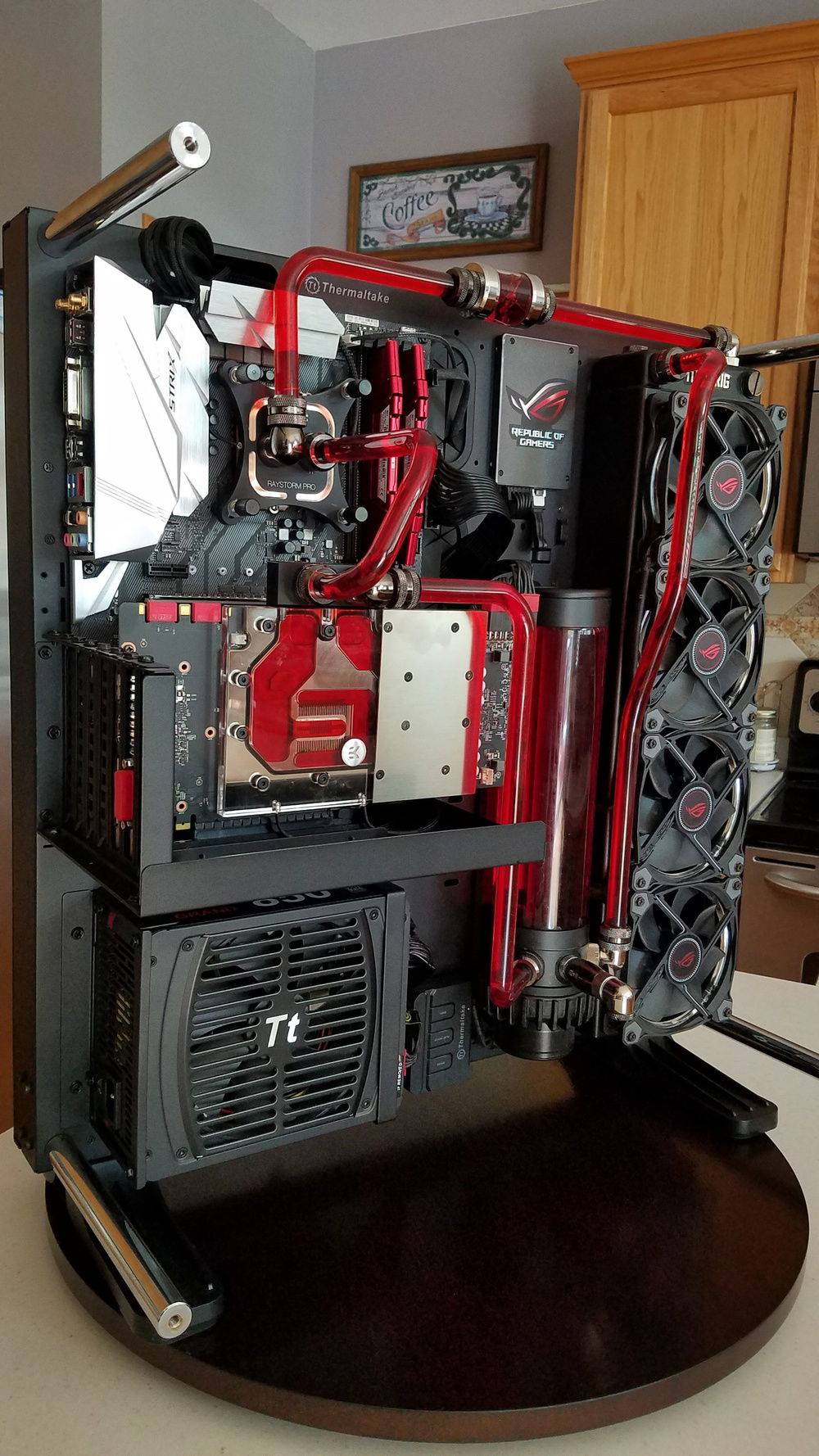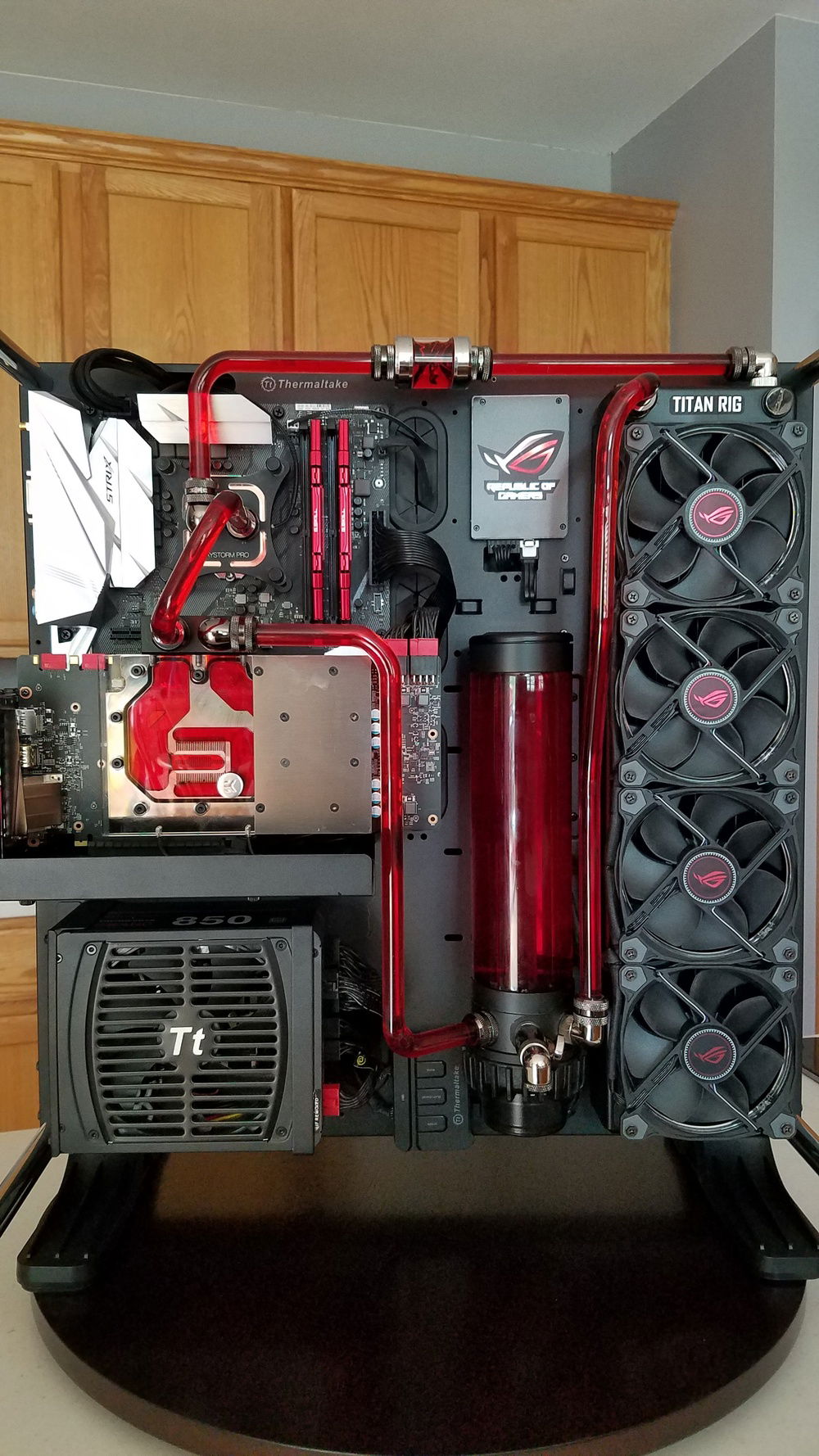 Wall mounted - single loop. My first water cooled rig, originally (circa 2016) a 6700k with blue coolant/lighting. Updated in 2018 to the blood God ;)
