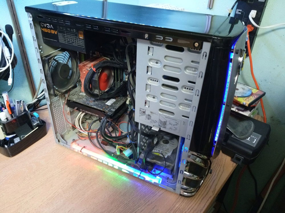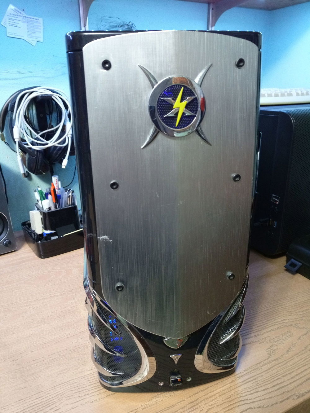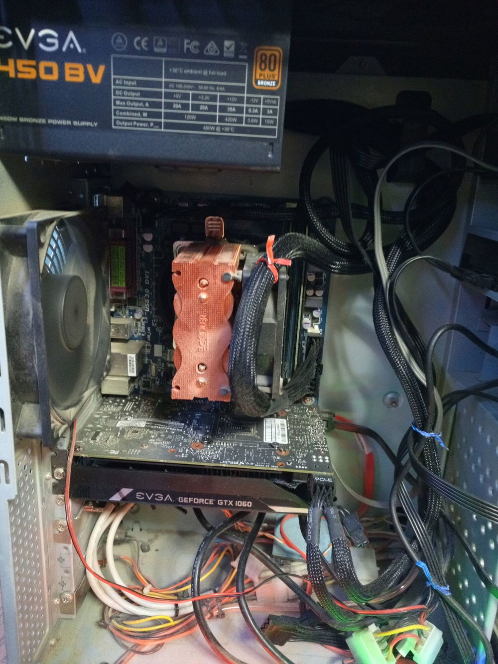 This is an older Gladiator case that has been updated hardware completely 3 full times, only keeping HDD. Currently has: Micro-ATX Gigabyte motherboard Intel 1155 16GB DDR3 Crucial Ballistix Ram i7-3770 with Hyper 212 cpu cooler EVGA-GTX1060 6GB with a healthy Overclocked to 2011Mhz core clock and 4428Mhz memory clock 120GB Kingston SSD for OS, and 4TB game and storage drive EVGA 450-BV fully modular PSU Monitors 23" Hannspree 1080p touchscreen monitor & 4k HDR 43" TV