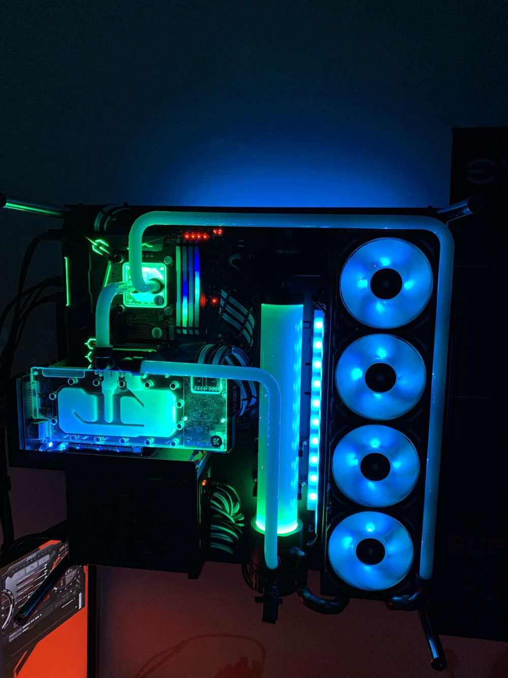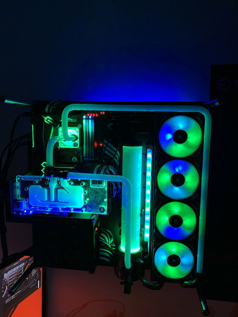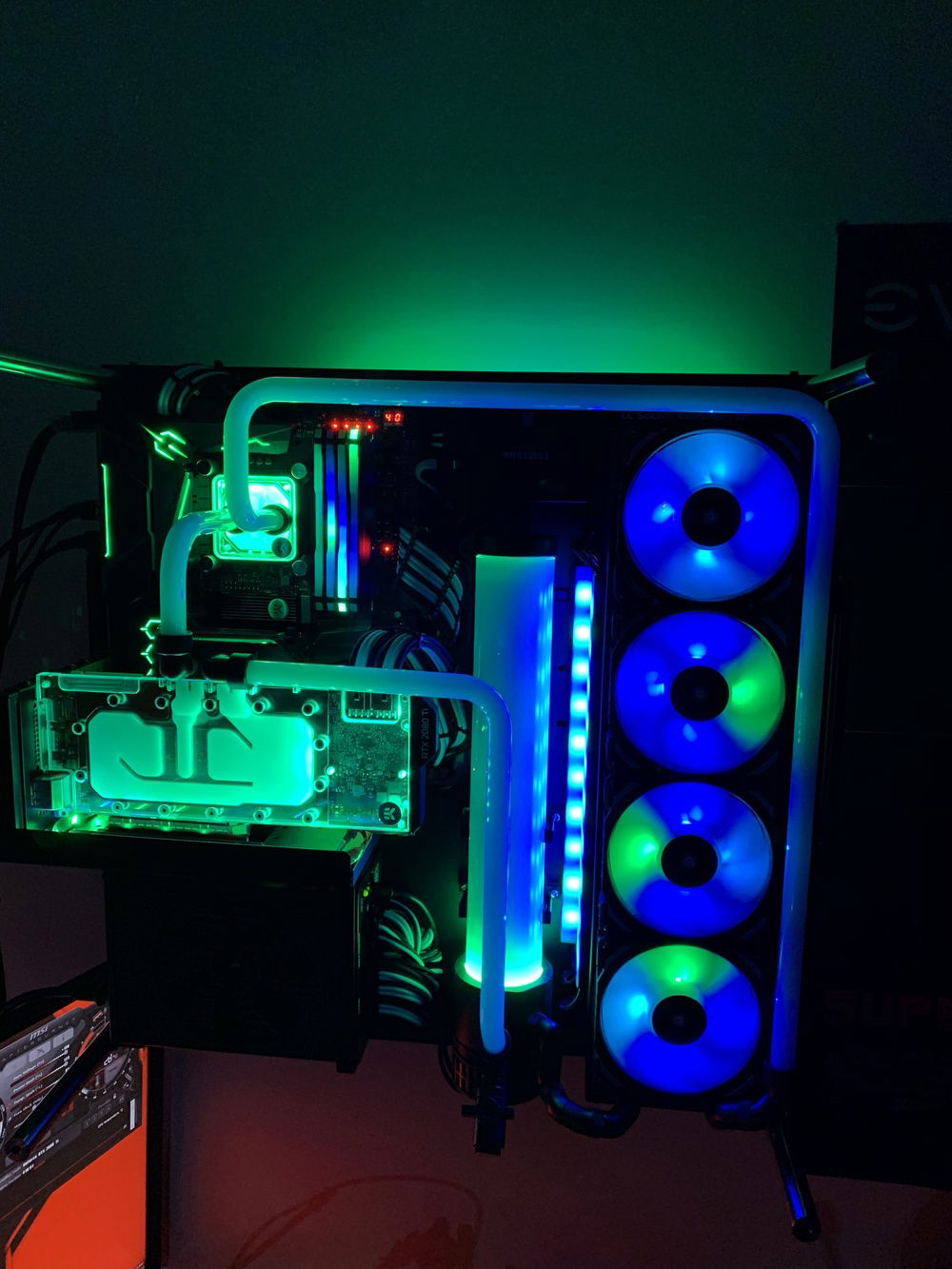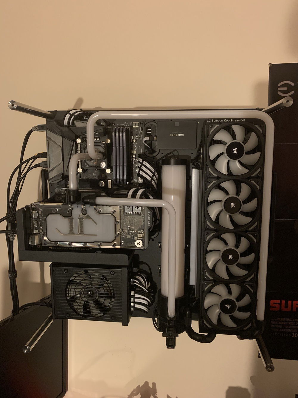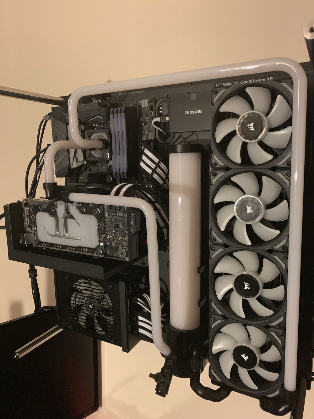 This wall mounted build has evolved over the years and has been tinkered with and rebuilt 20ish something times. It had a FTW3 1080ti for two years in it with a Thermaltake pump res combo that had a built in bracket from the case to hold it. Purchased an EK D5 RGB pump res combo when I got the 2080ti and slapped a 400mm reservoir on it to fill the void weird space... I'm completely aware it doesn't provide any thermal benefits! It just seemed like the best thing to do to fill a decent amount of empty space. I made this white and black so that any specific color with the RGB lighting could be projected. PSU is way overkill but this particular Corsair unit only kicks the fan when it gets hot so 75% of the time its not running. 8 fans in a push pull config with a bunch of different fan curves that I can hot key. GPU temp on my normal use fan curve maxes out at 49c. CPU is in the 70's under load but that's because its been abused for almost three years running at a 5.1ghz 1.39v .