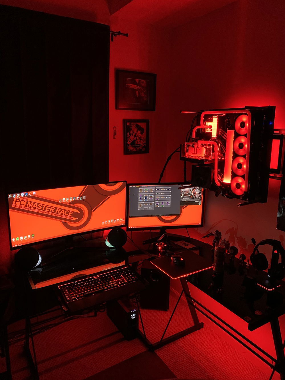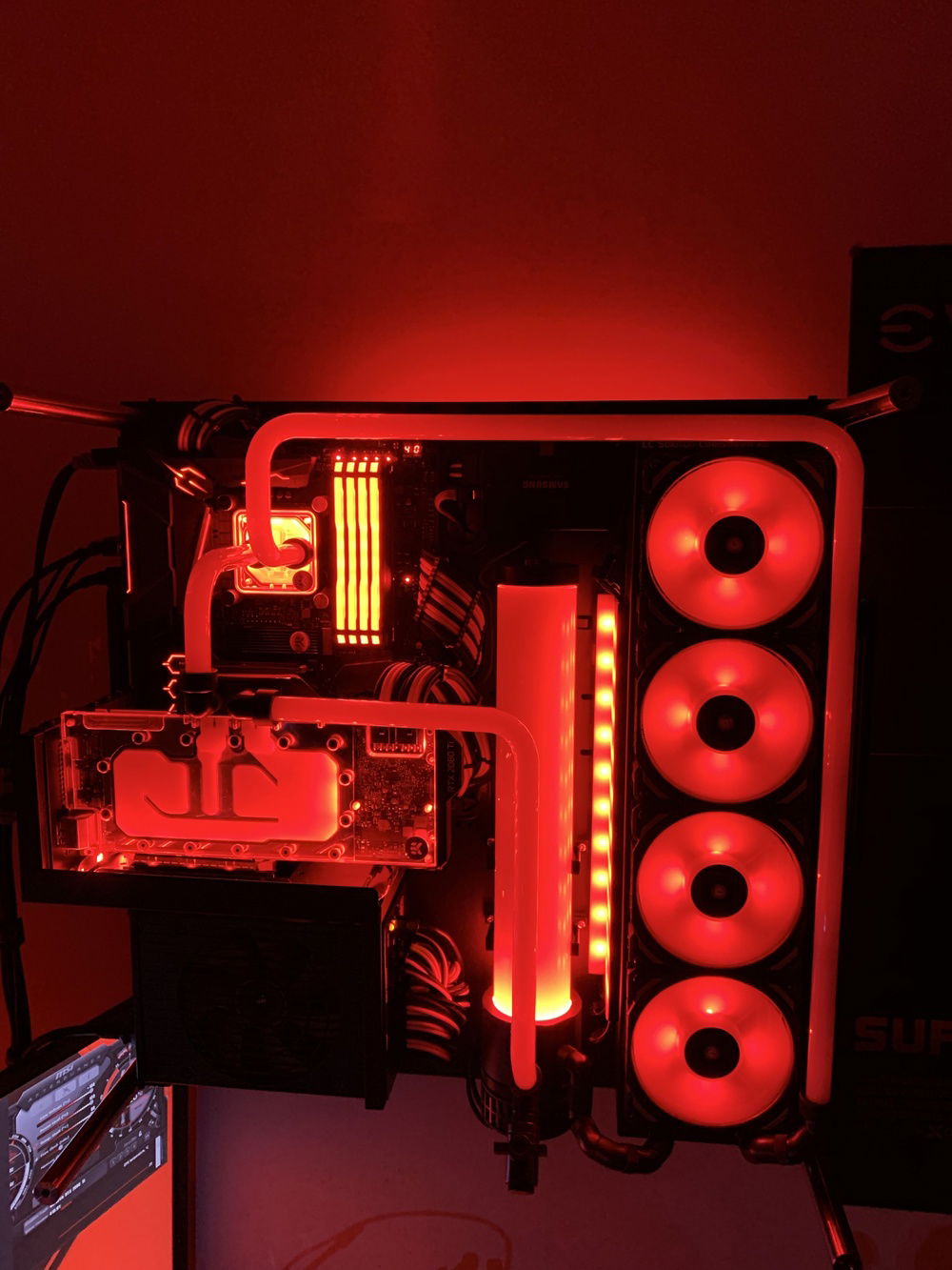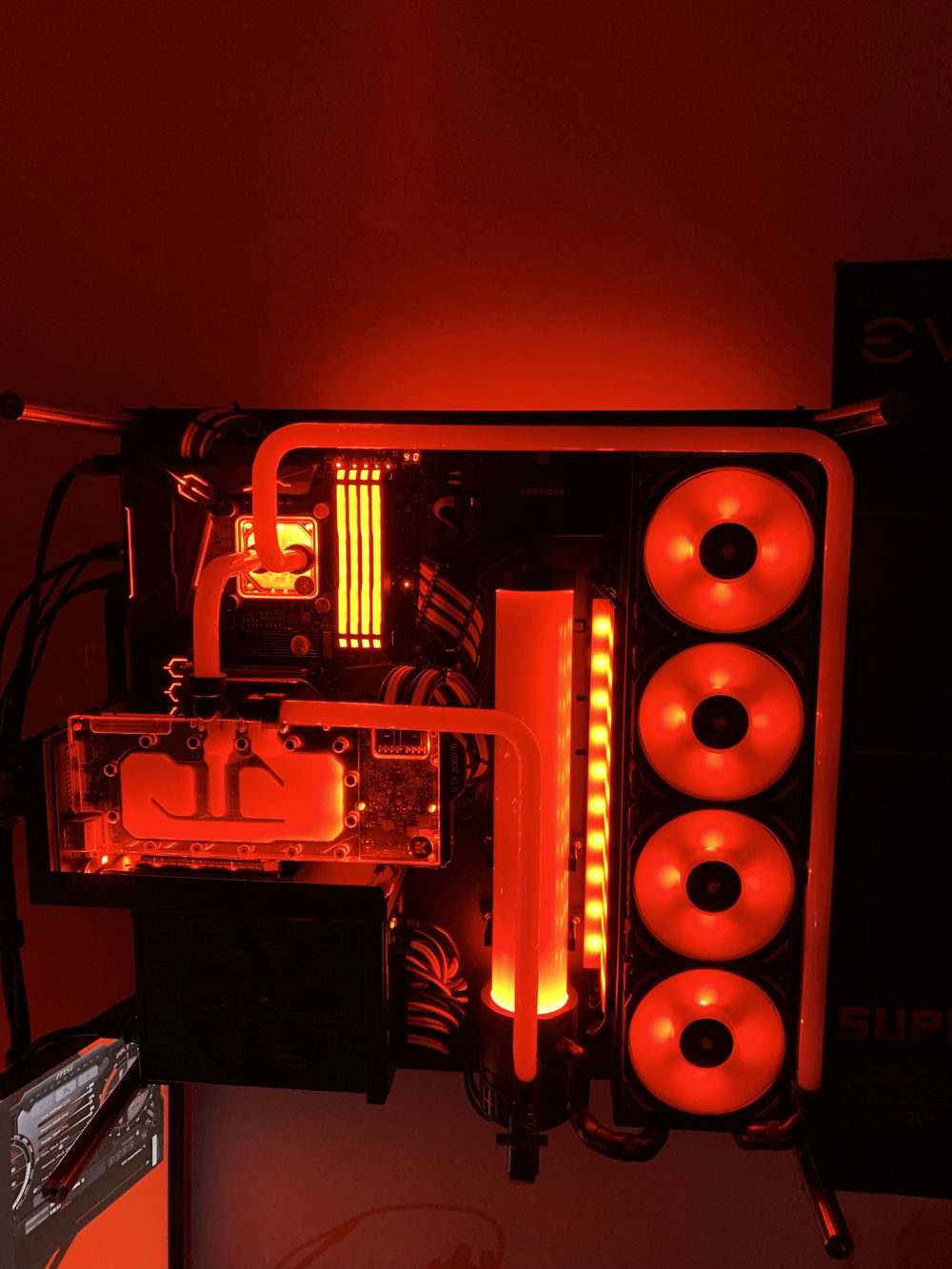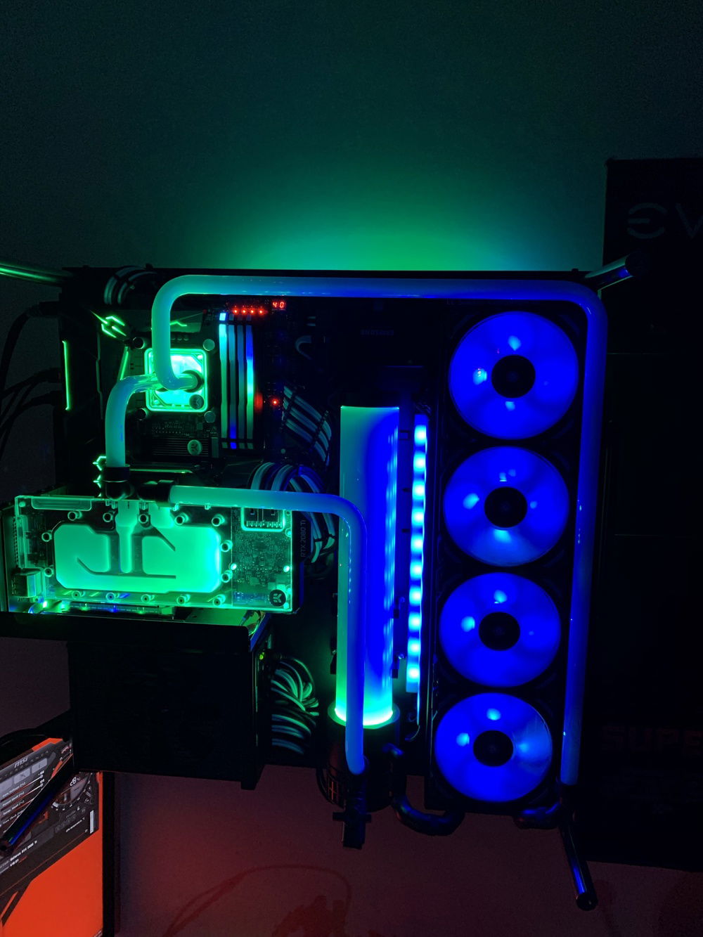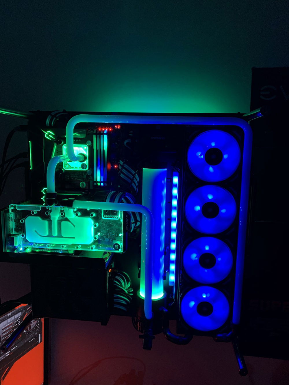 This wall mounted build has evolved over the years and has been tinkered with and rebuilt 20ish something times. It had a FTW3 1080ti for two years in it with a Thermaltake pump res combo that had a built in bracket from the case to hold it. Purchased an EK D5 RGB pump res combo when I got the 2080ti and slapped a 400mm reservoir on it to fill the void weird space... I'm completely aware it doesn't provide any thermal benefits! It just seemed like the best thing to do to fill a decent amount of empty space. I made this white and black so that any specific color with the RGB lighting could be projected. PSU is way overkill but this particular Corsair unit only kicks the fan when it gets hot so 75% of the time its not running. 8 fans in a push pull config with a bunch of different fan curves that I can hot key. GPU temp on my normal use fan curve maxes out at 49c. CPU is in the 70's under load but that's because its been abused for almost three years running at a 5.1ghz 1.39v .