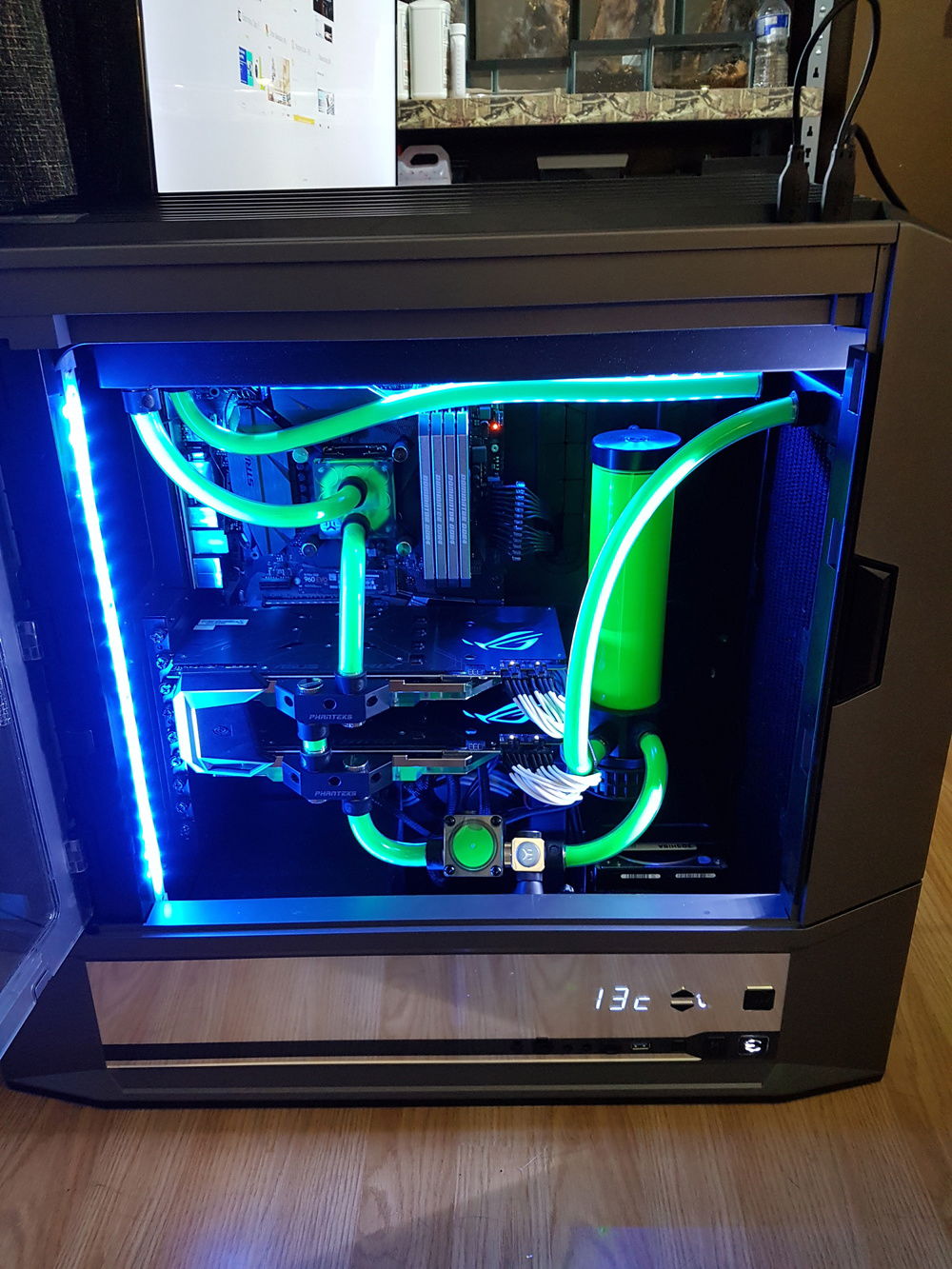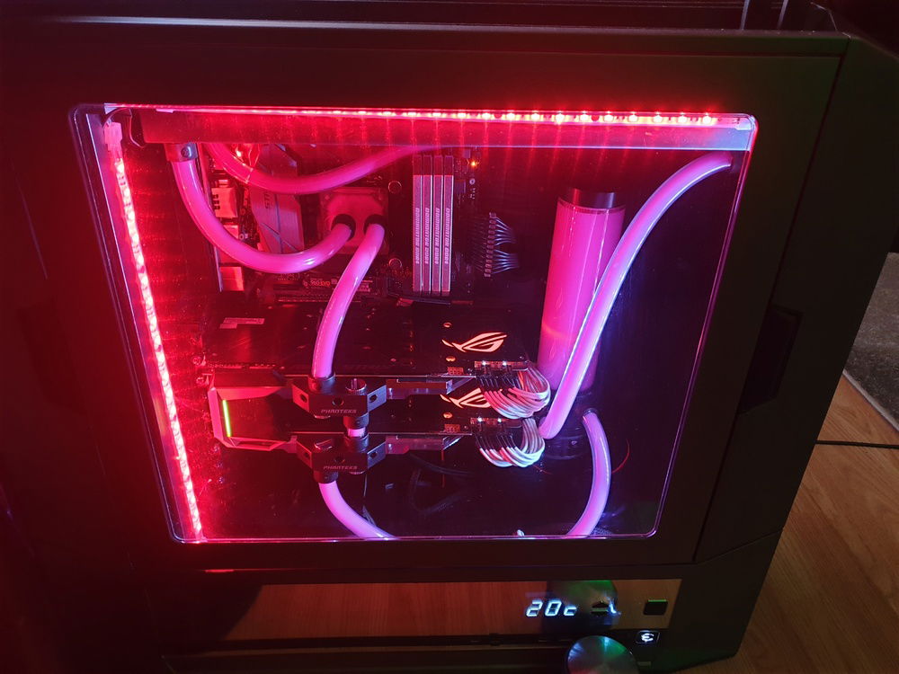 EVGA DG87 Case 1000w Corsair PSU, Asus Z270F Motherboard, Delidded i7 7700k CPU Corsair Dominator Platinum 32GB RAM, 2 x Asus GTX 1080Ti 2 x EK radiators and 1 x CPU block, 1 x D5 pump combo, 2 x Phanteks GPU waterblocks, 8 x Noctua 3000PMW fans. Mayhem pink fluid