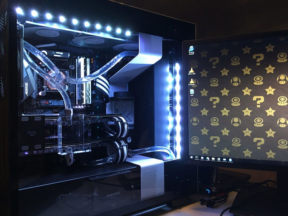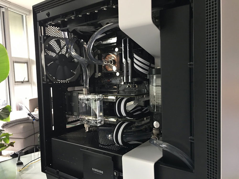 This build took me 2 months to complete. It started with an air cooled i5-8500K. By the time I was done I had this custom liquid cooled 8700K with dual 1080Ti in SLi. Eventually I'll go in and replace the flexible tubing with hard tube. For now, I'm enjoying the bends in the meantime.