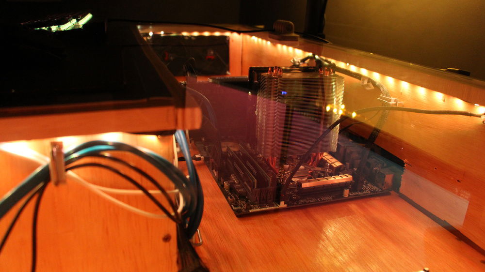 Made out of Birch plywood, screws, nails, and blood, sweat, and tears, my Wooden desk build was custom made and hand crafted specifically for my enjoyment. From the relatively short height of the desk, to the extra space behind the desk for room for cable management, to the fans that intake air from the left and blow out to the right, this desk PC was built with both aesthetics and utility in mind.